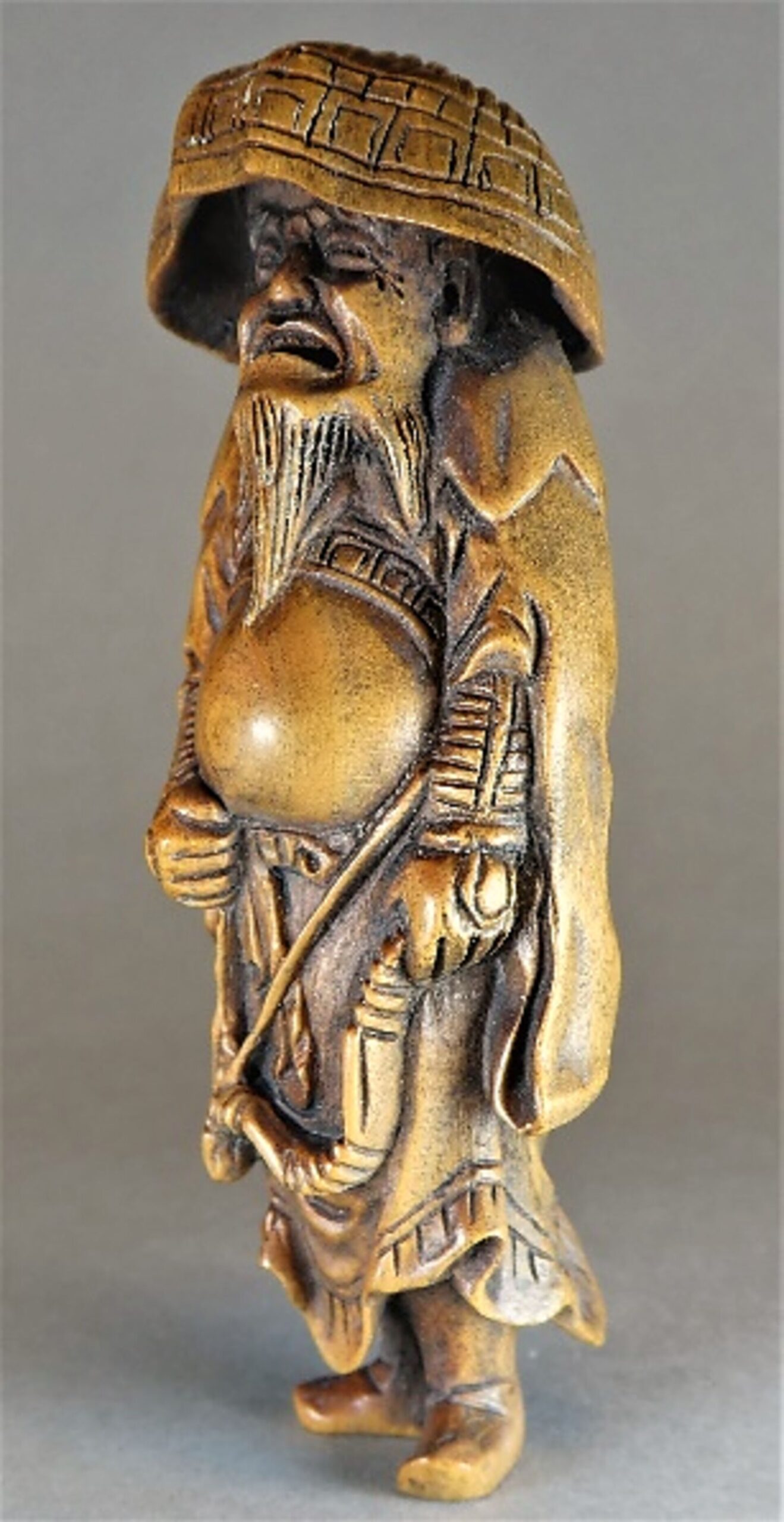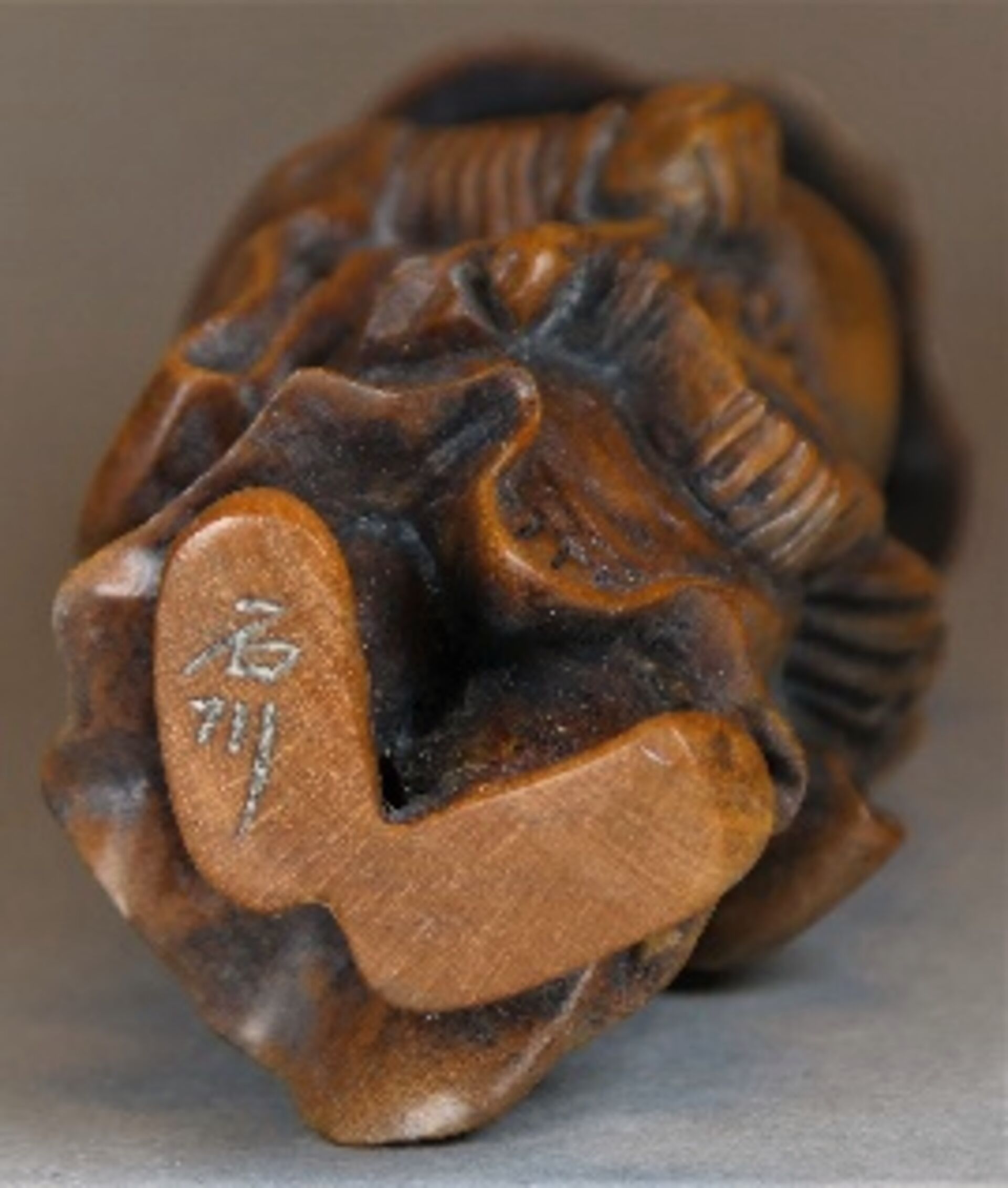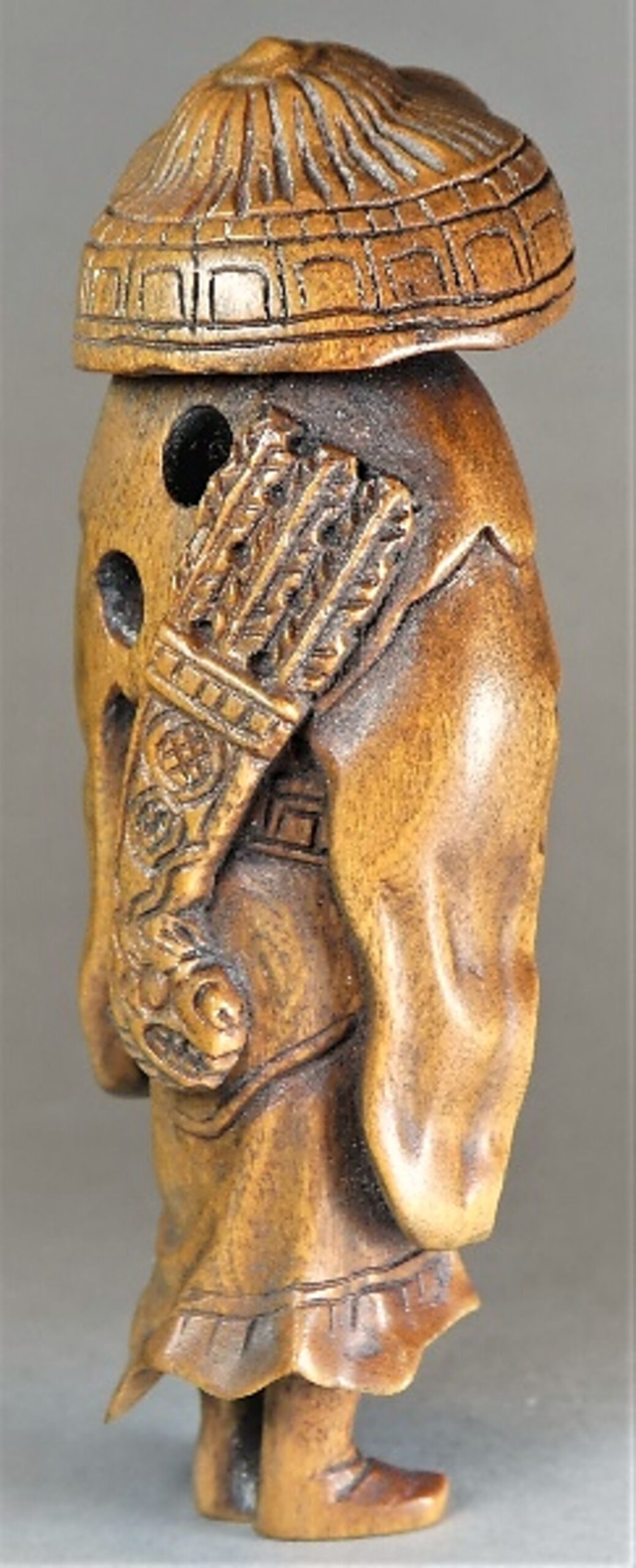 Holz-Katabori. Der Mann mit Pfeil und Bogen steht grimmig entschlossen en face da, mit dreizipfeligem Bart, einen Pfeil in der Rechten, den Bogen in der Linken. Er trägt ein wallendes Gewand, der kugelrunde Bauch steht vor. Der grosse runde Hut ist allseits überlappend und beschattet das Gesicht. Auf dem Rücken ein Köcher, der gegen unten in einem Drachenkopf ausläuft. Im Köcher drei gefiederte Pfeile. Im Rücken 2 gleichgrosse, gut gebohrte Himotoshi. Der linke Fuss ist etwas vorgeschoben, was der Gestalt etwas Entschlossenes gibt. In der rechten Fusssohle eine Signatur ISHIKAWA ( , K193, K149). Grösse 68mm, Alter: ?2.Hälfte 19.Jh., Meiji-Taisho-Zeit? Bogenschützen-Netsuke (siehe die Vergleichsstücke umseitig) sind meist in Elfenbein gearbeitet, ganz selten in Holz.