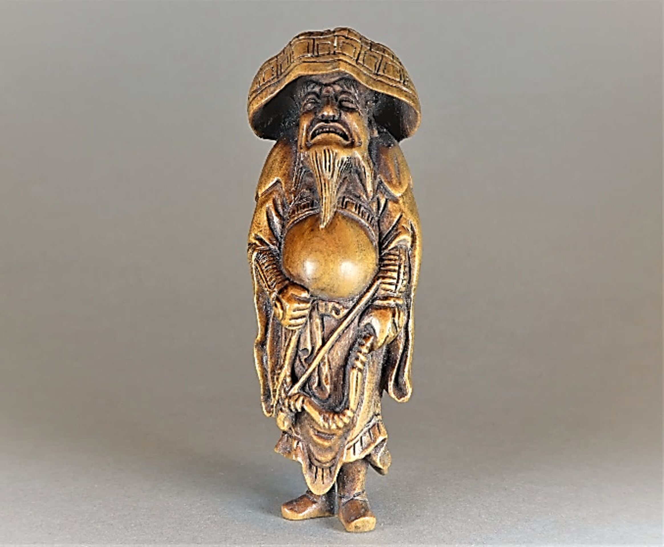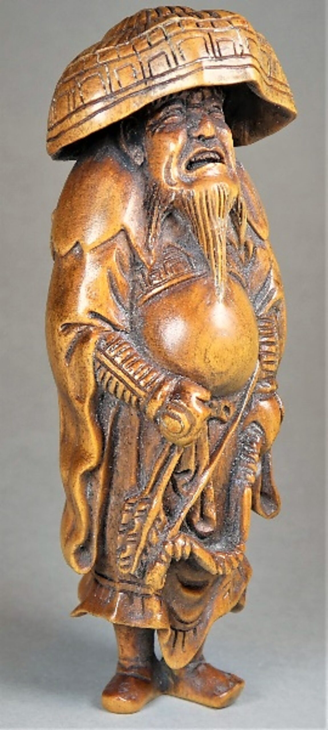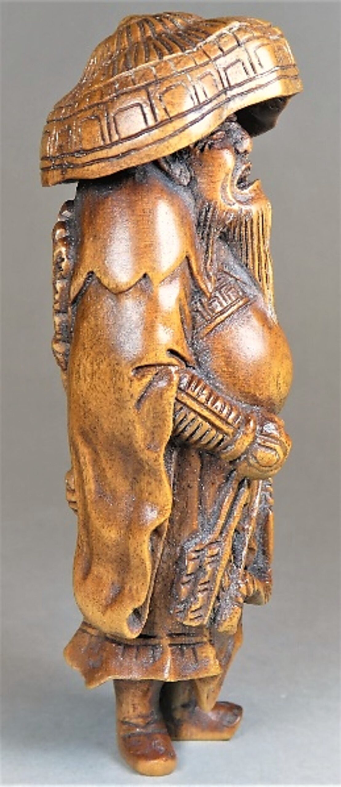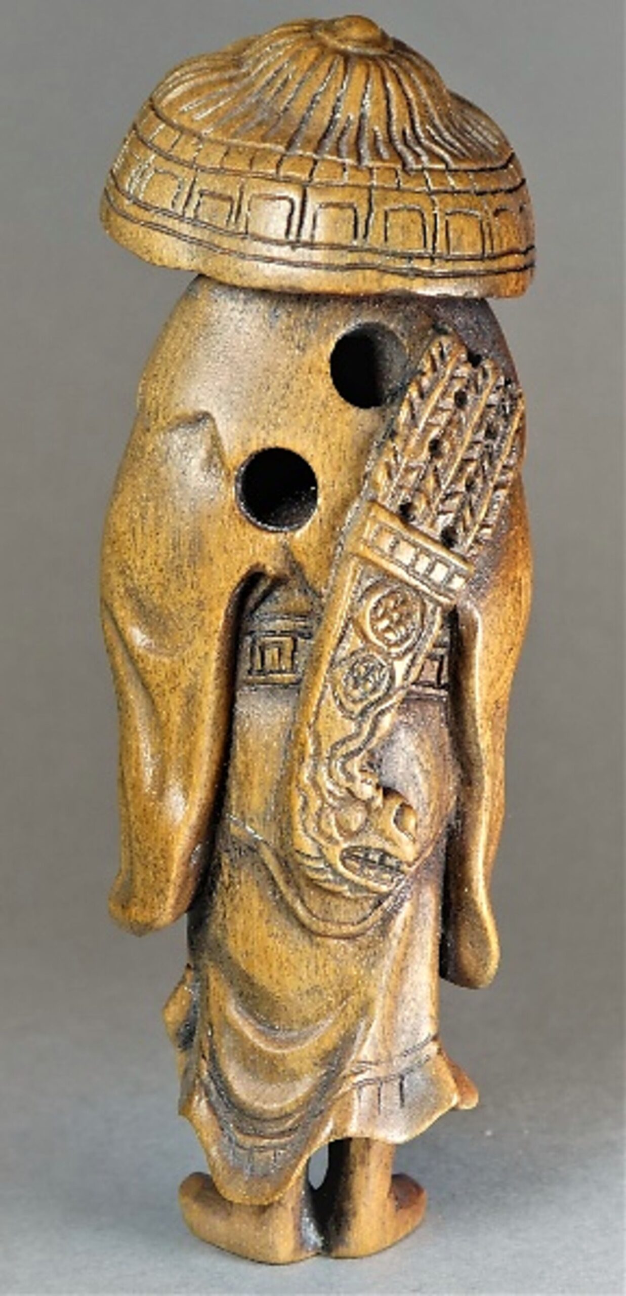 Holz-Katabori. Der Mann mit Pfeil und Bogen steht grimmig entschlossen en face da, mit dreizipfeligem Bart, einen Pfeil in der Rechten, den Bogen in der Linken. Er trägt ein wallendes Gewand, der kugelrunde Bauch steht vor. Der grosse runde Hut ist allseits überlappend und beschattet das Gesicht. Auf dem Rücken ein Köcher, der gegen unten in einem Drachenkopf ausläuft. Im Köcher drei gefiederte Pfeile. Im Rücken 2 gleichgrosse, gut gebohrte Himotoshi. Der linke Fuss ist etwas vorgeschoben, was der Gestalt etwas Entschlossenes gibt. In der rechten Fusssohle eine Signatur ISHIKAWA ( , K193, K149). Grösse 68mm, Alter: ?2.Hälfte 19.Jh., Meiji-Taisho-Zeit? Bogenschützen-Netsuke (siehe die Vergleichsstücke umseitig) sind meist in Elfenbein gearbeitet, ganz selten in Holz.