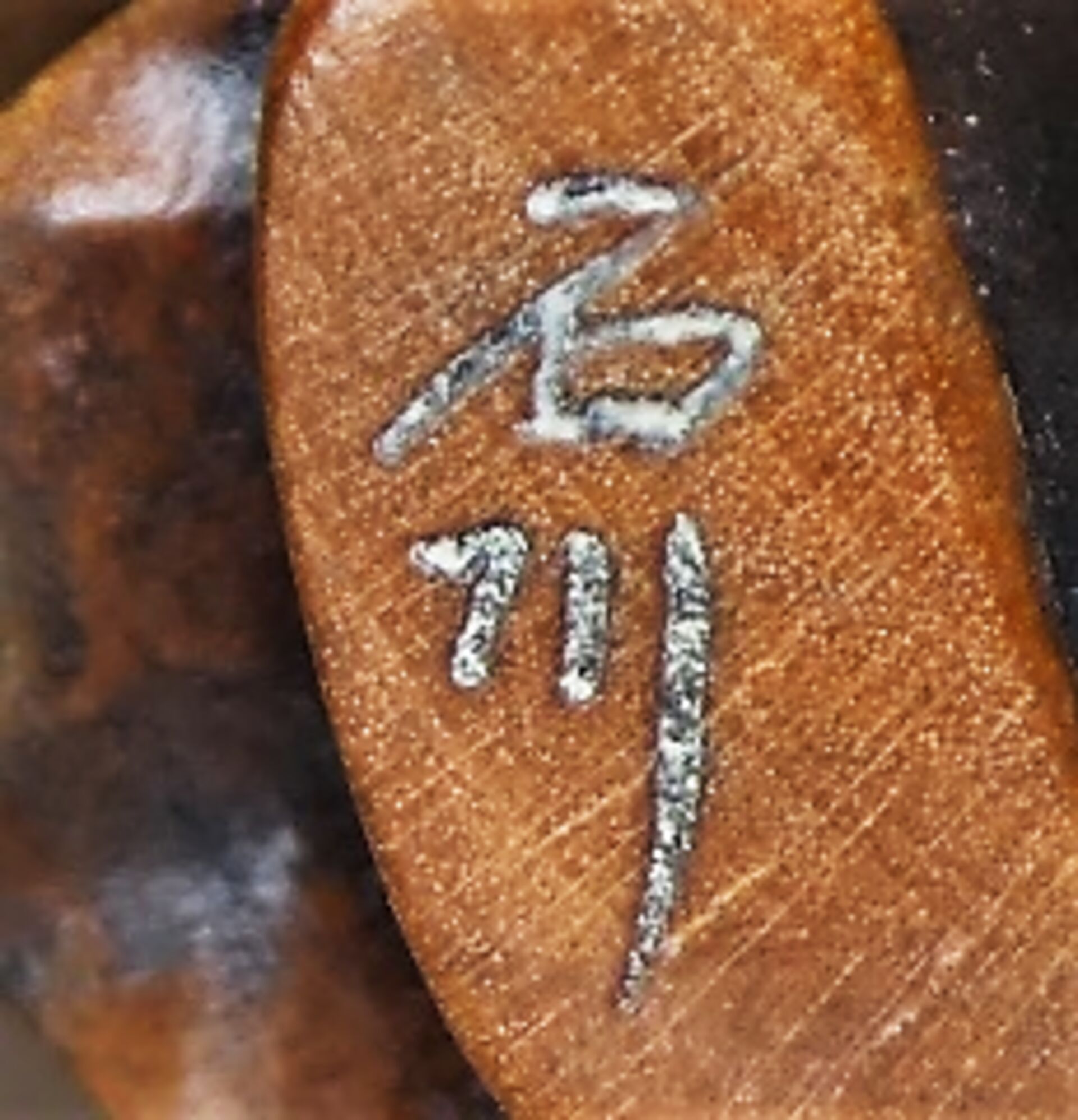 ISHIKAWA: eine Reihe von Netsukeschnitzern führte diesen Namen, u.a. in Verbindung mit den Namen Rensai, Komei, Mitsuaki…Alle sind ins 19.Jh., bzw. ins späte 19.Jh. datiert. Erstaunlich und zugleich verwirrend ist die Ähnlichkeit mit dem ebenfalls hölzernen Bogenschützen, der Tomokazu signiert ist, doppelt so gross ist wie unser Stück und viel stärker dekoriert. (siehe Vergleichsstücke S.4 unten rechts, Auktion Zacke 2.11.2019, No,35). Beide bekannten Tomokazu werden ins 19.Jh. datiert (Daivey/Hindson 1974, Nrn.2983, 2984). Zacke datiert den Tomokazu-Bogenschützen ins 20.Jh. Bleibt die Frage, ob unser Stück das Original ist oder die Kopie.