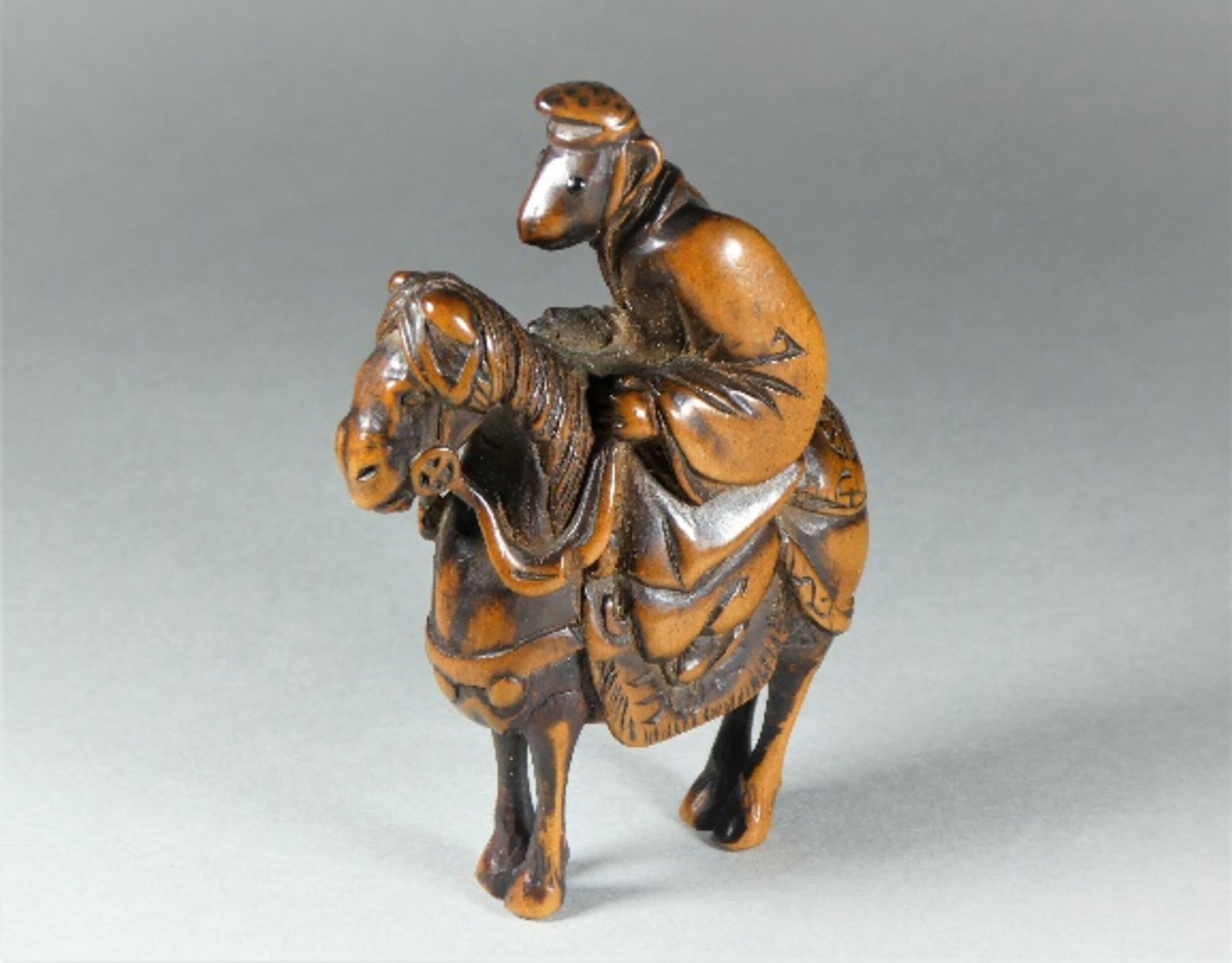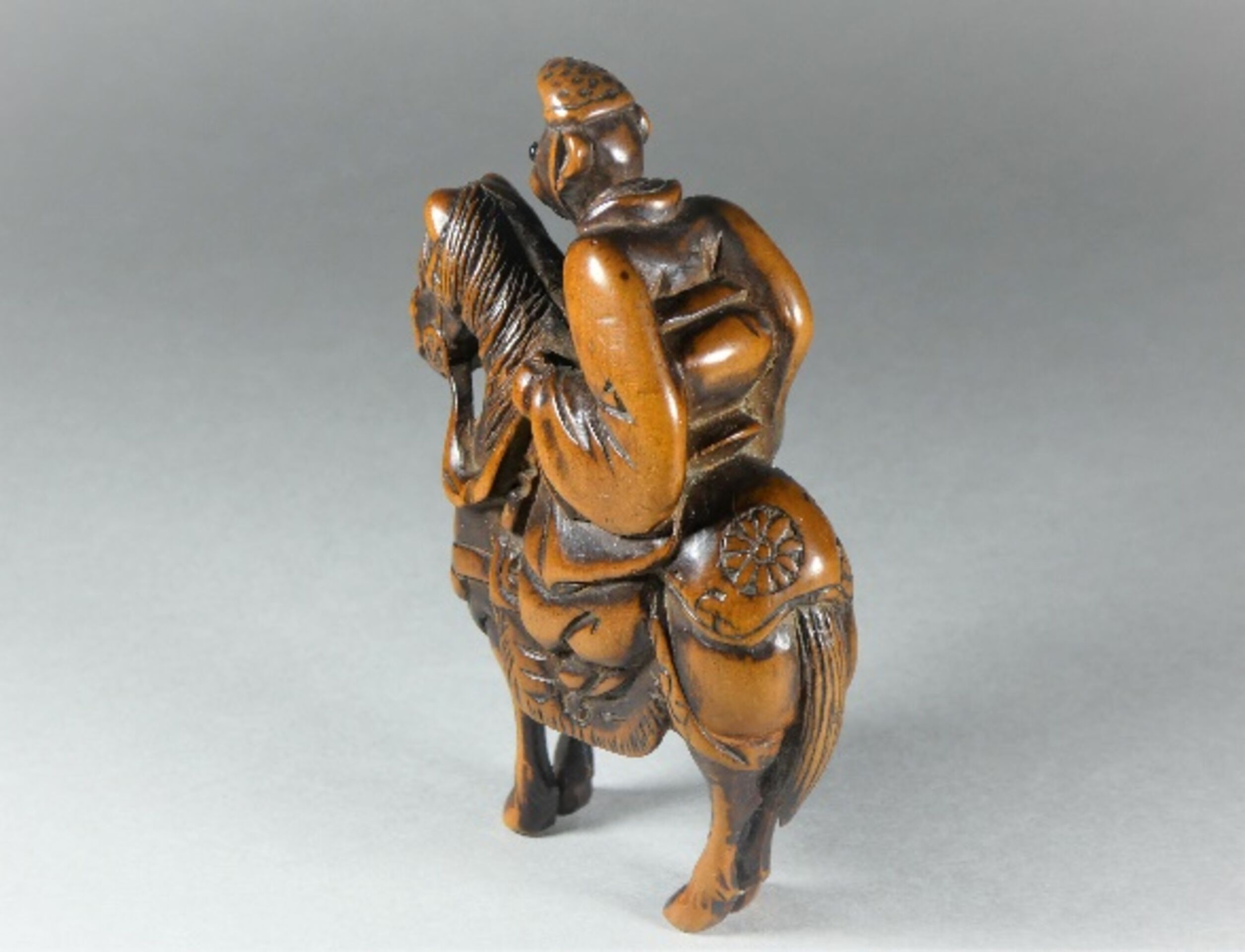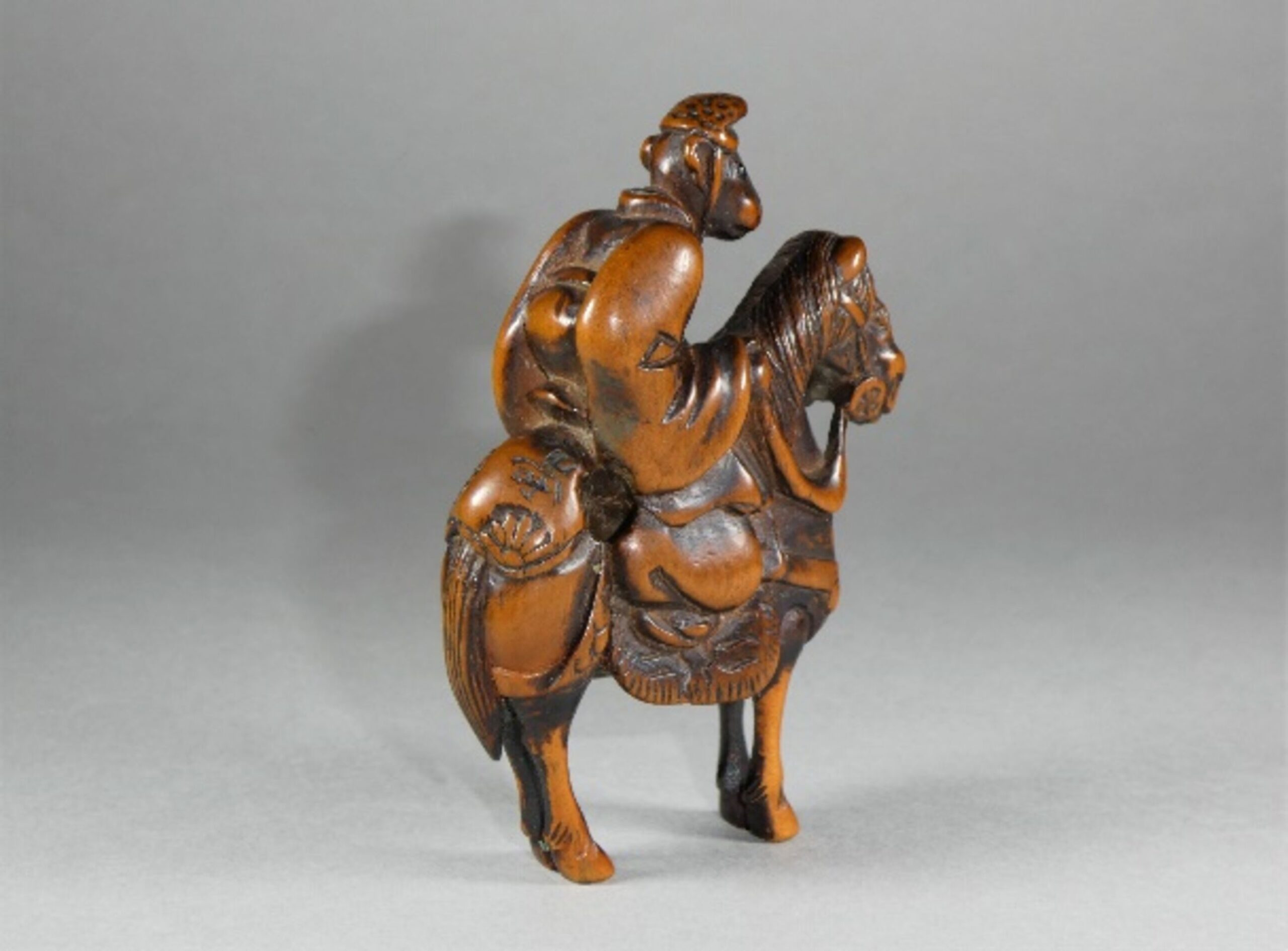 Holz-Katabori. Ein Affe sitzt auf einem gezäumten und gesattelten Pferd. Er ist gekleidet in ein wallendes Gewand und trägt auf dem Kopf die Hofmütze Eboshi. Seine Augen sind in dunklem Material, vermutlich Horn, eingelegt. Er hält die Zügel in den Händen und blickt aufmerksam und erwartungsvoll nach vorn. Das Pferd steht versammelt da. Es ist aufwändig und einigermassen kostbar geschmückt. Grosse, gut gebohrte Himotoshi rechts hinter dem Reiter auf dem Rücken des Pferdes und unten auf dessen Bauch. Schöne Alterspatina, Reste einer schwarzen Bemalung. Auf der rechten Gesässbacke des Pferdes eine etwas grob gravierte, für mich nicht zu entziffernde Signatur, die vermutlich nachträglich eingefügt wurde. Höhe 66mm, Alter: ca. 1. Hälfte 19.Jh.