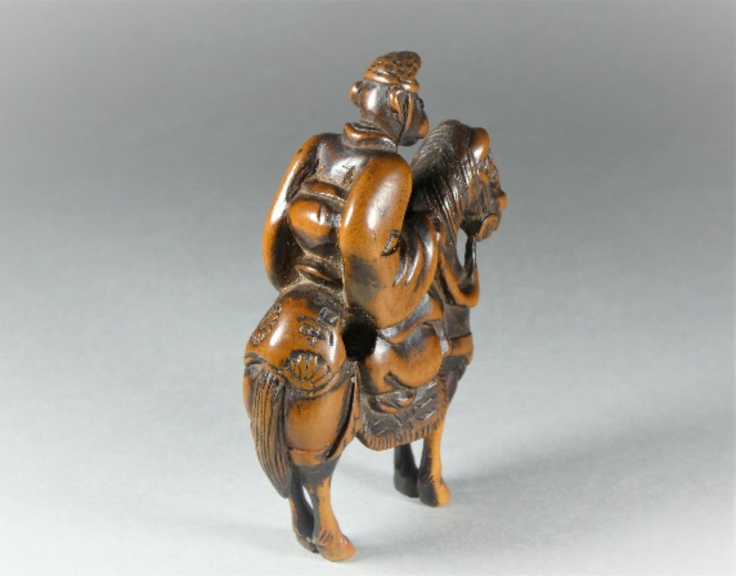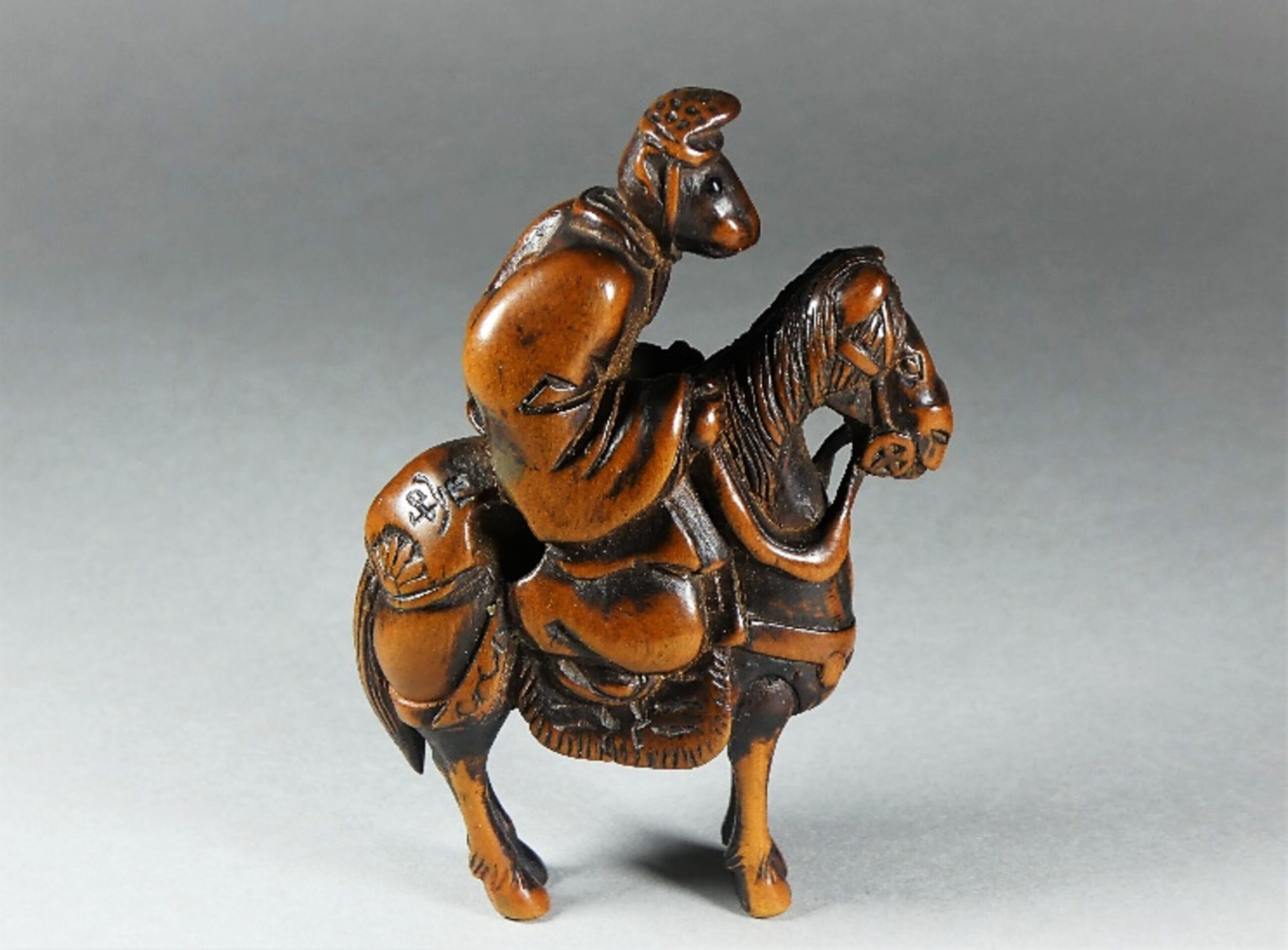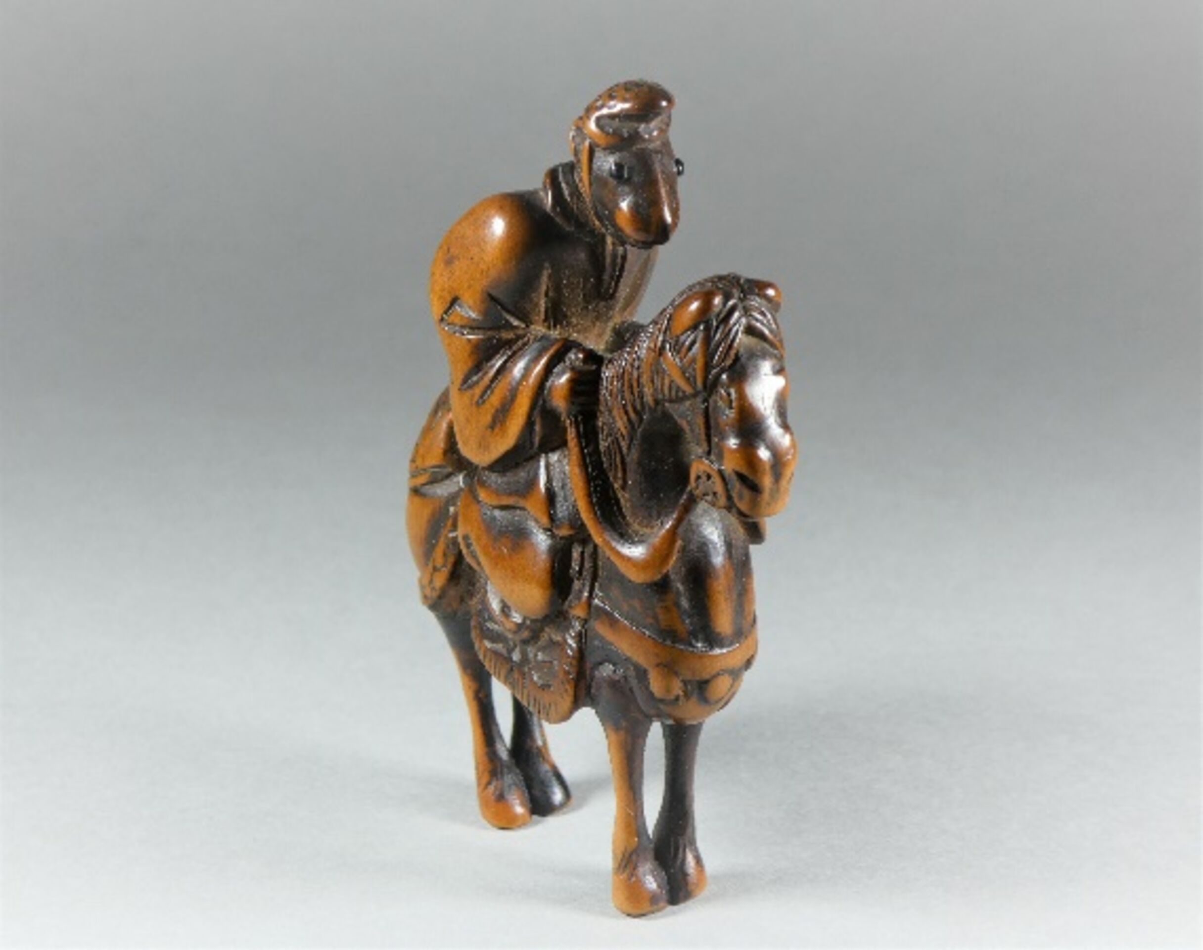 Holz-Katabori. Ein Affe sitzt auf einem gezäumten und gesattelten Pferd. Er ist gekleidet in ein wallendes Gewand und trägt auf dem Kopf die Hofmütze Eboshi. Seine Augen sind in dunklem Material, vermutlich Horn, eingelegt. Er hält die Zügel in den Händen und blickt aufmerksam und erwartungsvoll nach vorn. Das Pferd steht versammelt da. Es ist aufwändig und einigermassen kostbar geschmückt. Grosse, gut gebohrte Himotoshi rechts hinter dem Reiter auf dem Rücken des Pferdes und unten auf dessen Bauch. Schöne Alterspatina, Reste einer schwarzen Bemalung. Auf der rechten Gesässbacke des Pferdes eine etwas grob gravierte, für mich nicht zu entziffernde Signatur, die vermutlich nachträglich eingefügt wurde. Höhe 66mm, Alter: ca. 1. Hälfte 19.Jh.