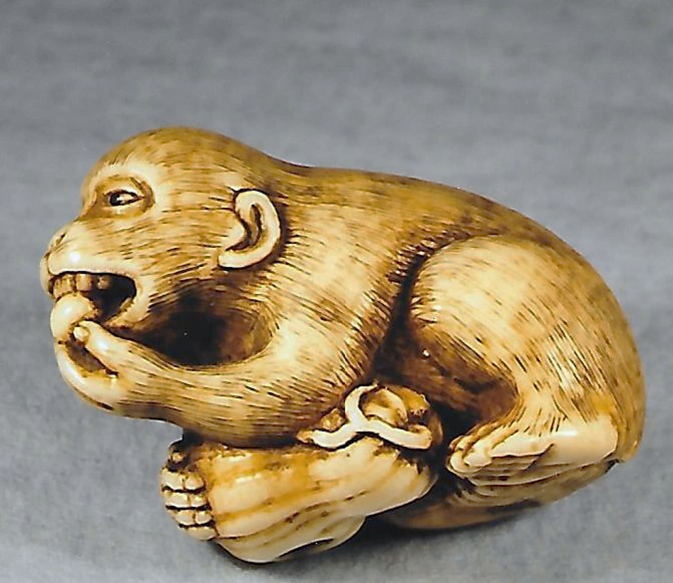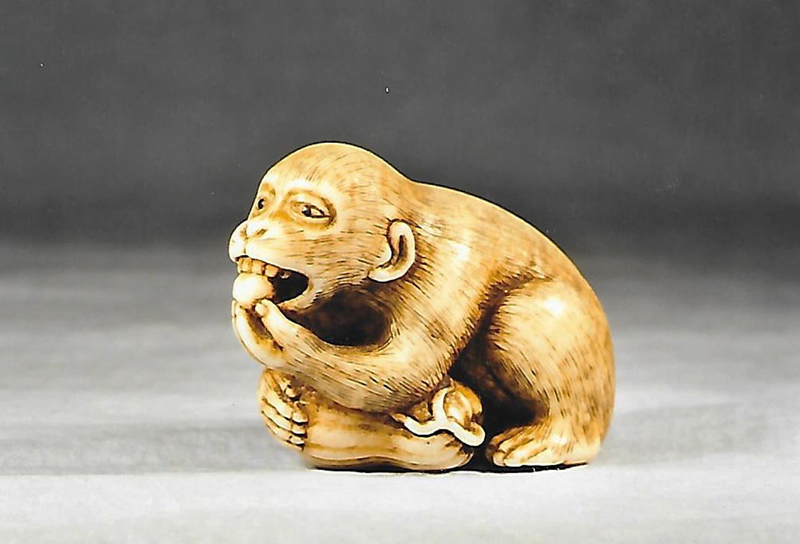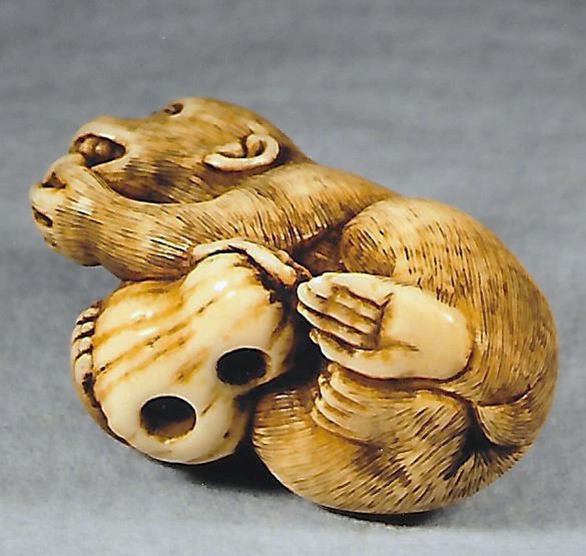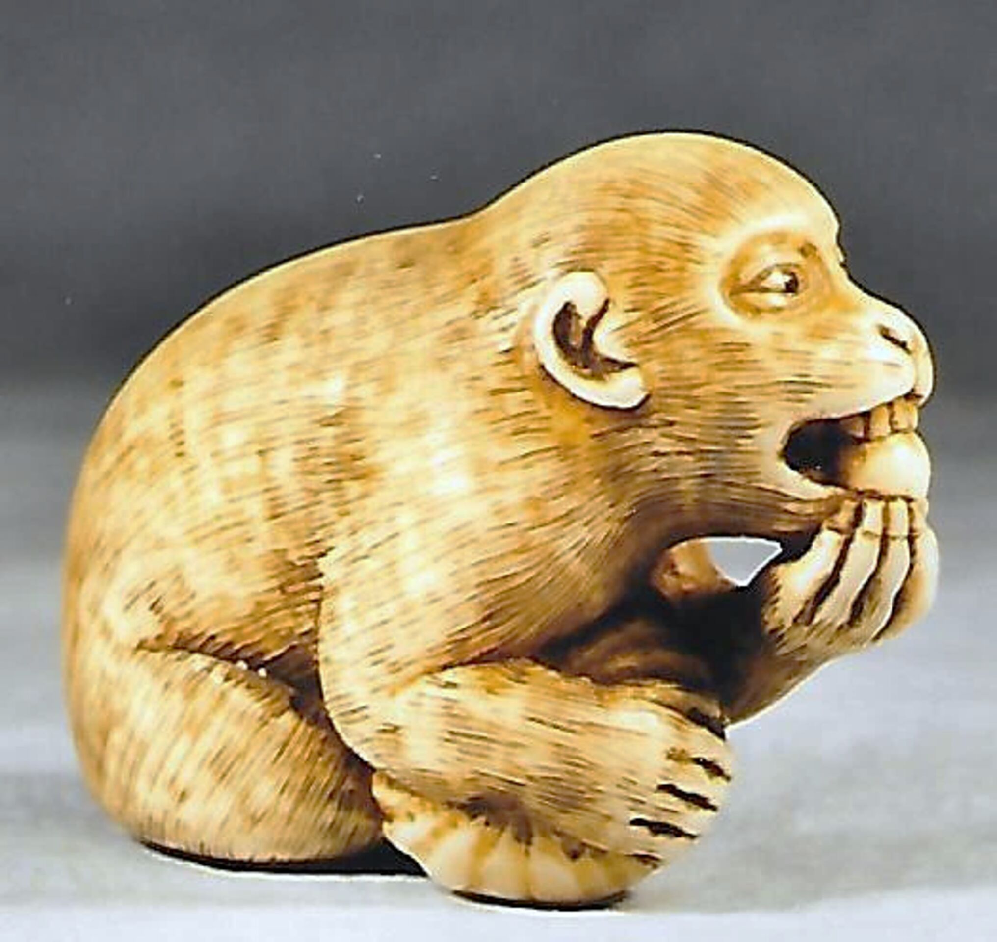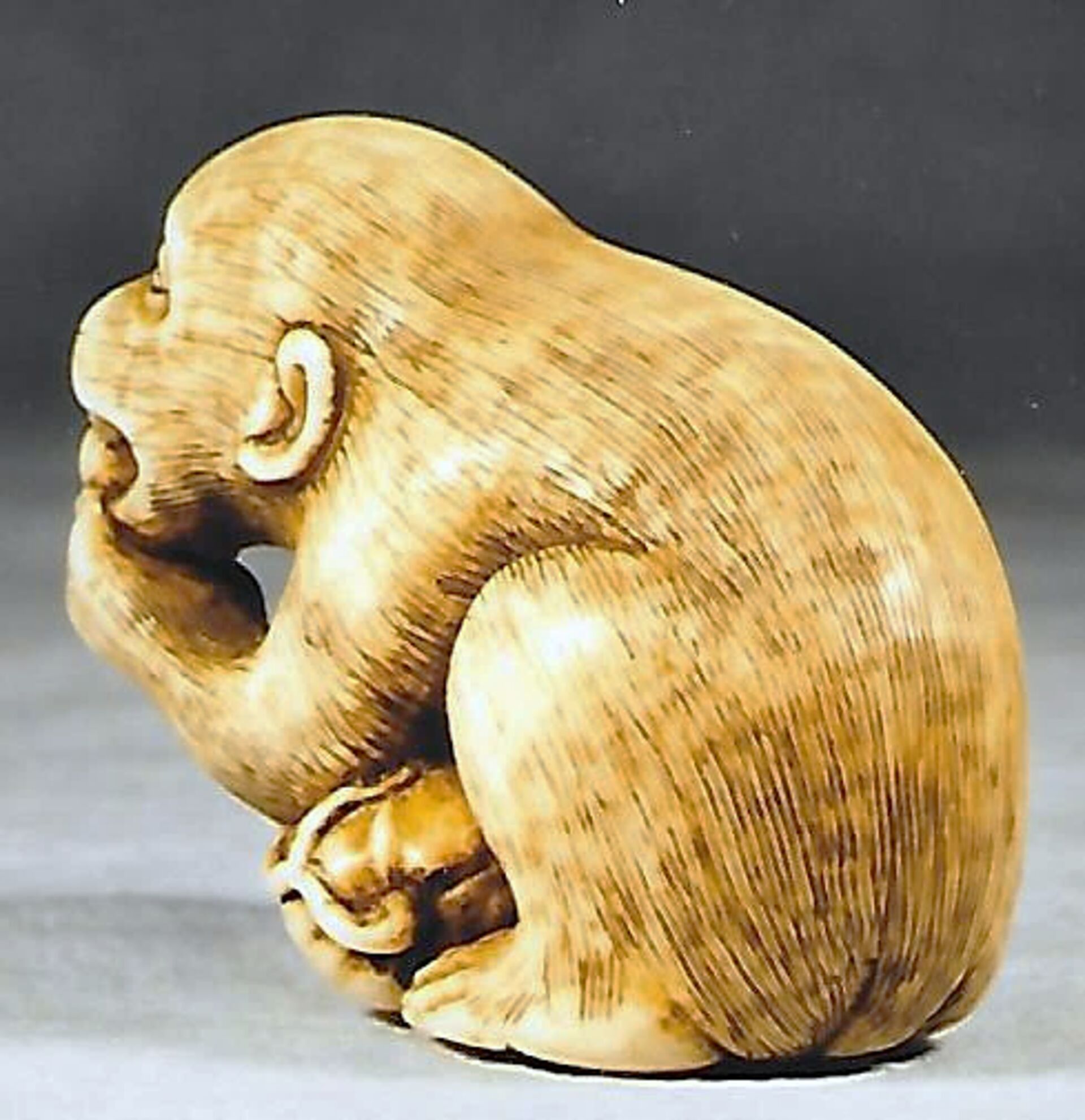 Elfenbein Katabori. Der Affe mit schöner Fellzeichnung kauert über einem Hiôtan-Kürbis und frisst eine kleine runde Frucht, vielleicht einen Pfirsich. Der Gesichtsausdruck ist tierisch gierig. Die Pupillen sind aus einem anderen dunklen Material. Auch die Unterseite ist sorgfältig gearbeitet. An der Unterseite des Kürbis zwei kleine Himotoshi mit Gebrauchspuren und schöner Glanzpatina. Länge 42mm, Alter nach Angaben von Zacke 1. Hälfte 19,.111. Keine Signatur. Die umseitig abgebildeten Parallelbeispiele lassen eine Herkunft aus dem Umkreis von OKATOMO vermuten.