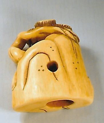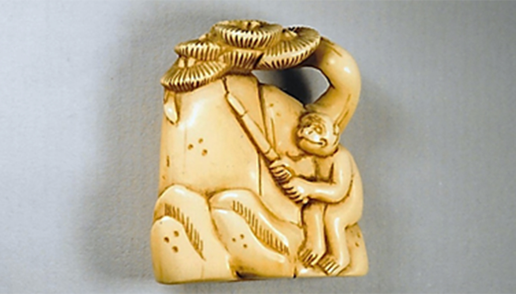 Kleines Katabori aus einem Tierzahn, vermutlich nicht Elfenbein. Eberzahn? Der geschwänzte, recht menschenähnliche Affe sitzt auf einem Felsvorsprung. Mit beiden Händen halt er einen Bambusstab, so als wollte er dreinschlagen (oder angeln?). Der Gesichtsausdruck ist erwartungsvoll, listig, die Stirn ist in angespannte Falten gelegt. Uber dem Felsen krümmt sich eine Schirmföhre und bildet eine Art Dach. Zwei ungleich grosse Himotoshi, gut gebohrt, auf der Rückseite und unterseitig. Rohe 3,5 cm. Alter: ca. M.19.Jh. Gebrauchsspuren. Rückseite dunkler als Vorderseite.