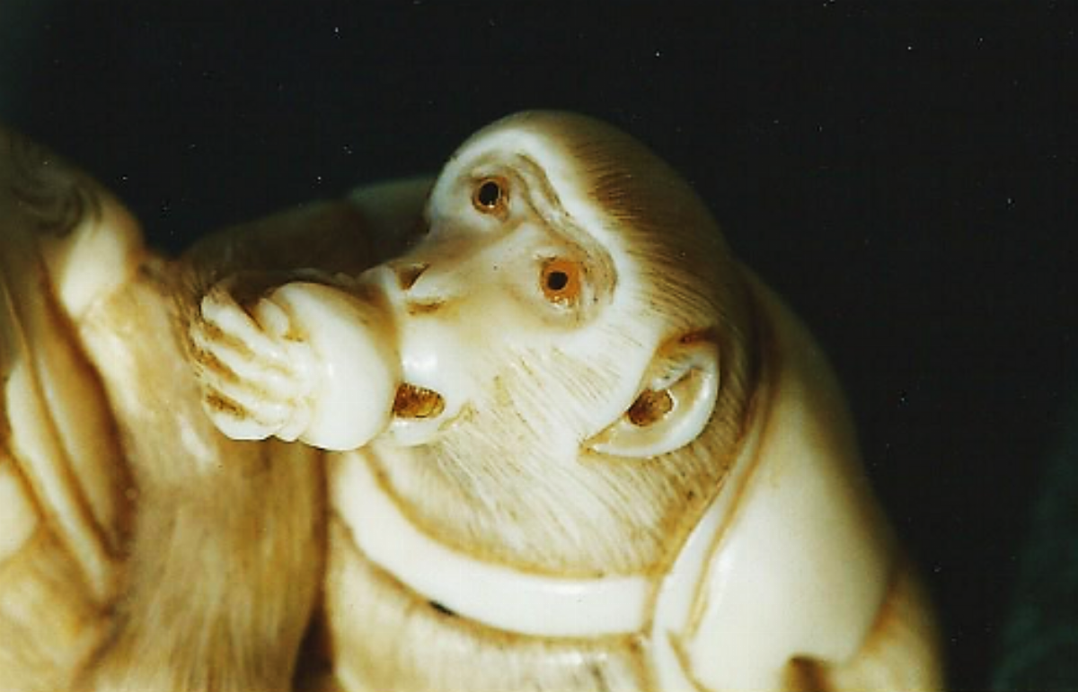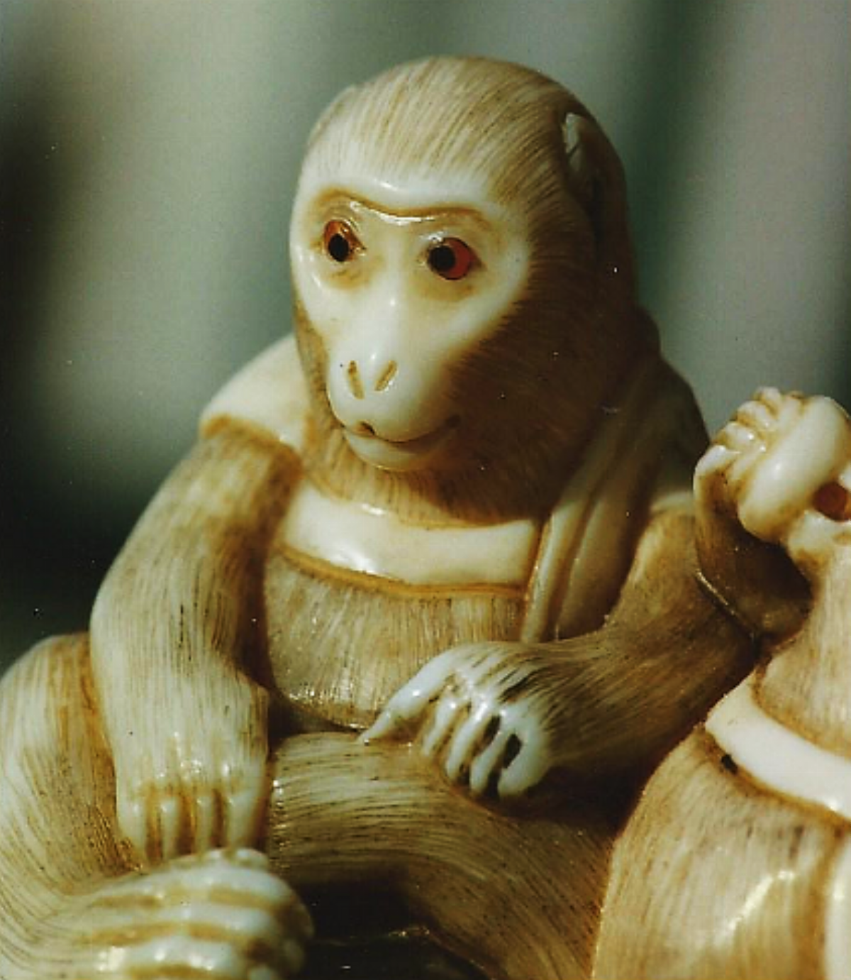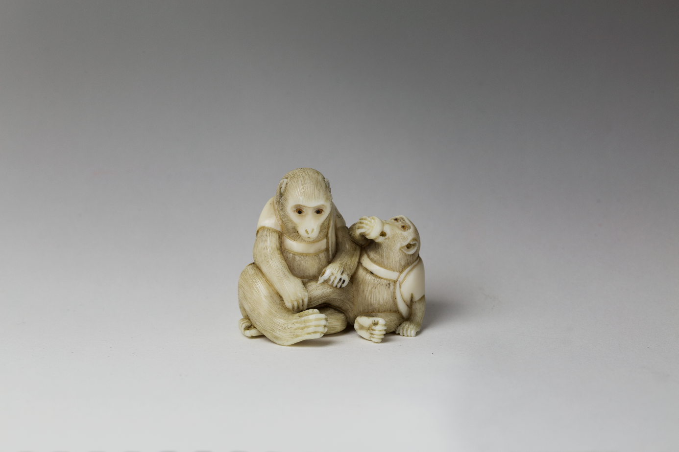 Elfenbein-Katabori. Die Affenmutter und ihr Junges sitzen nebeneinander, beide angetan mit kurzen, spärlich dekorierten Jäckchen. Die Mutter floht das Bein ihres Kindes, während dieses eine Khakifrucht frisst. Kompakte Gruppe, lebhafter Ausdruck in den Gesichtern, feine Fellzeichnung, gut gebohrte Himotoshi im Rücken der Affenmutter. Signatur auf dem Rücken des Jungen: IKKÔ (K141, K229) ?MASA-KOKU (K191, K250). Höhe 36mm, Alter: ca. 2.Hälfte bis spätes 19.Jh.