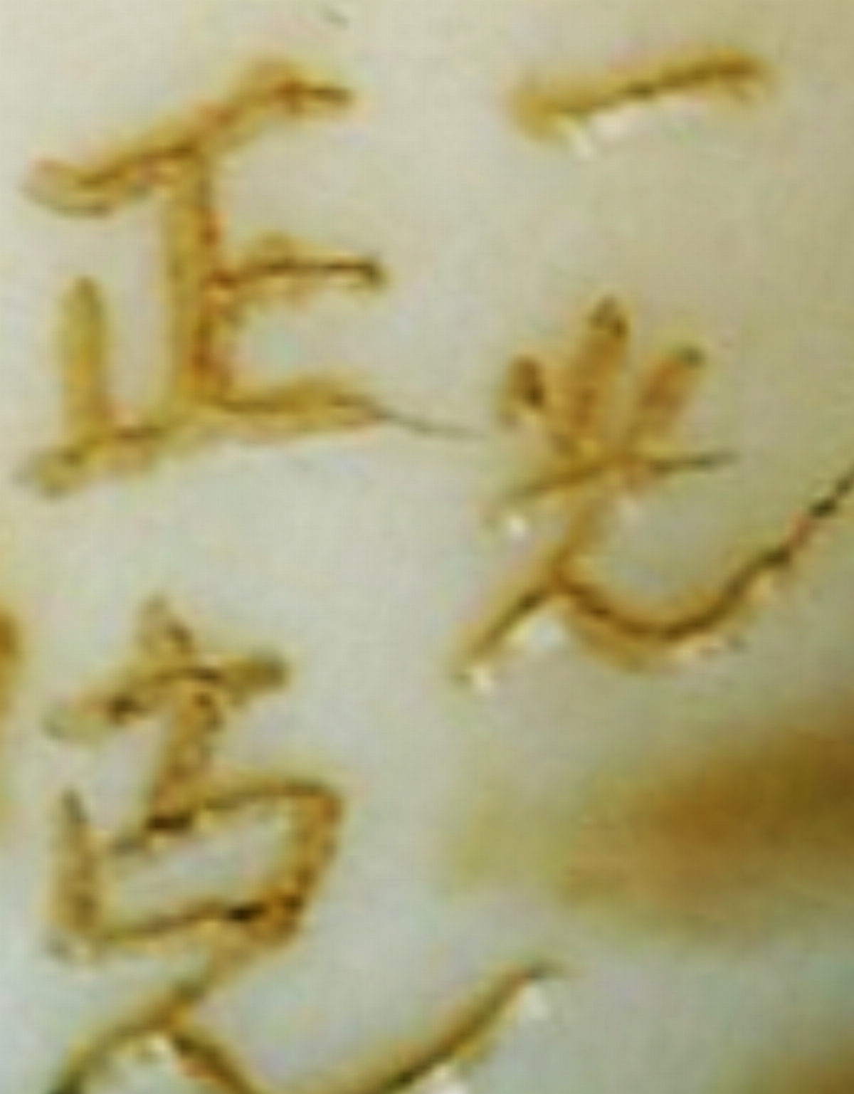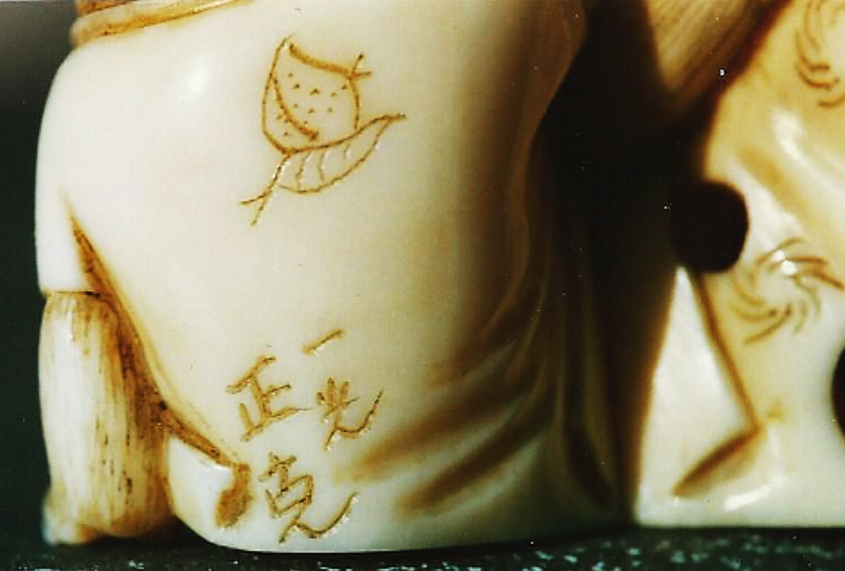 IKKÔ – Der Meinertzhagen Card Index p.225 führt sieben Netsukeschnitzer des Namens Ikkô auf, die sich alle derselben Signatur bedienten wie auf diesem Stück. Die Machart dieses Netsuke lässt auf einen späten Meister dieses Namens schliessen.