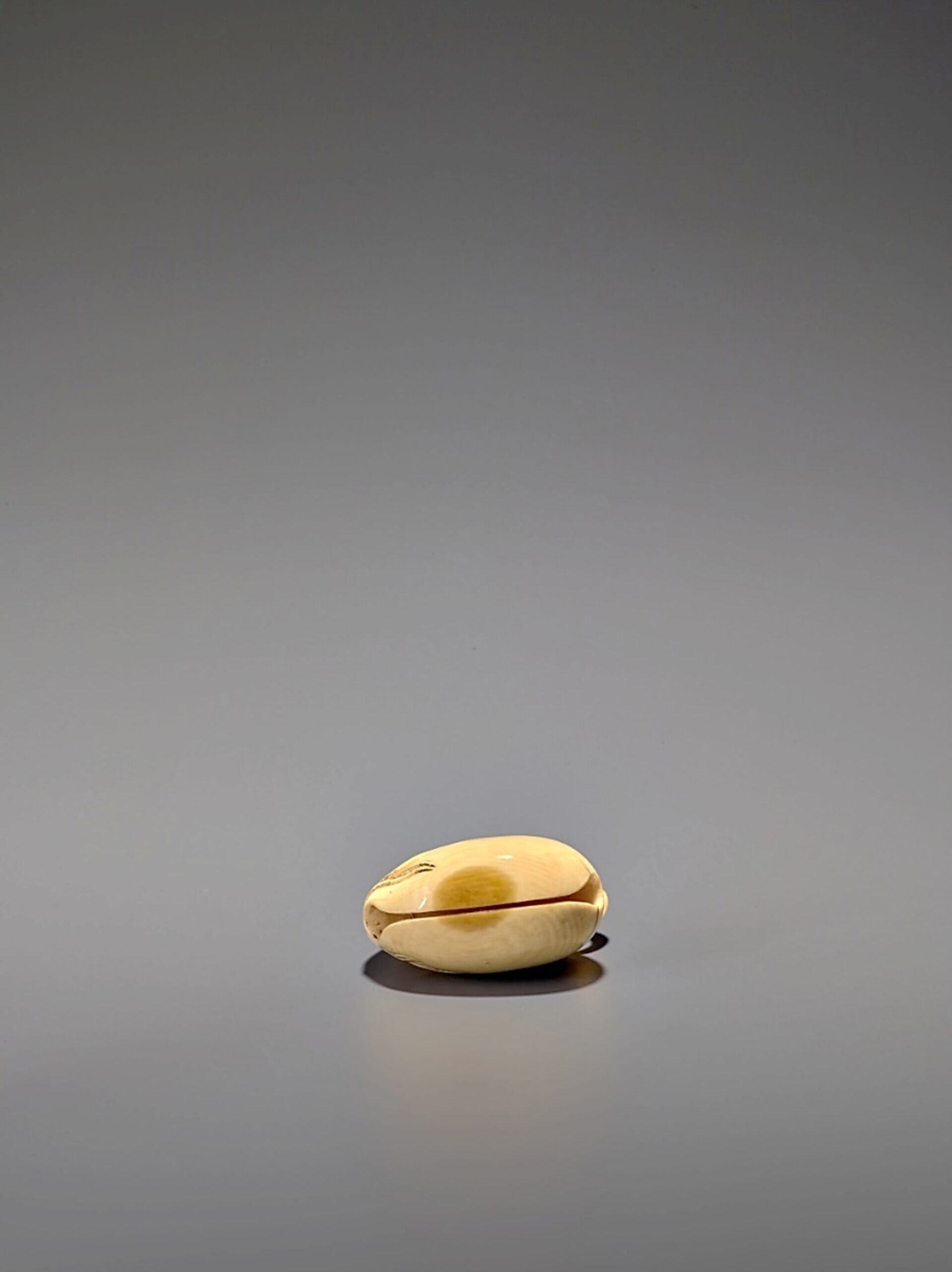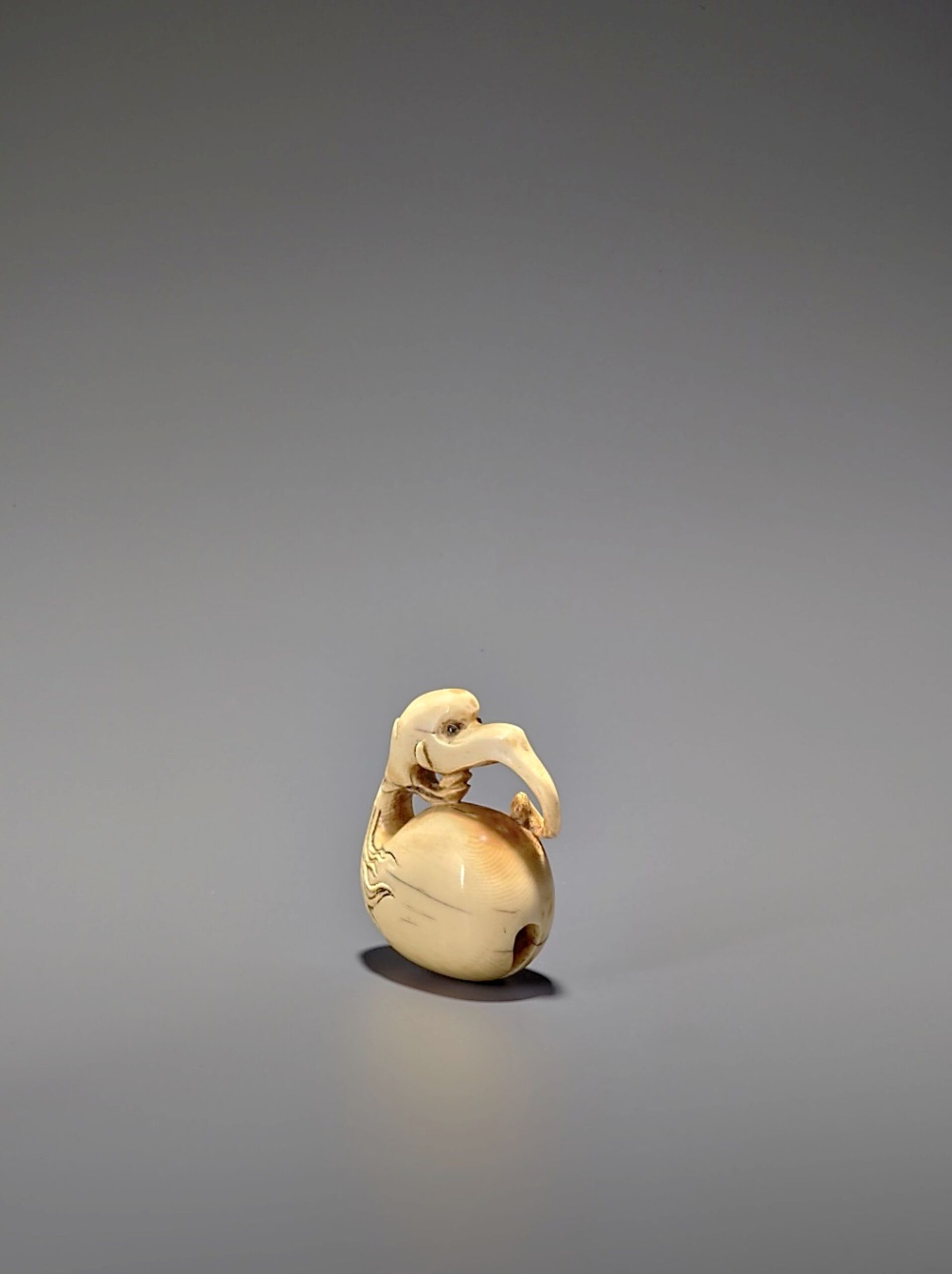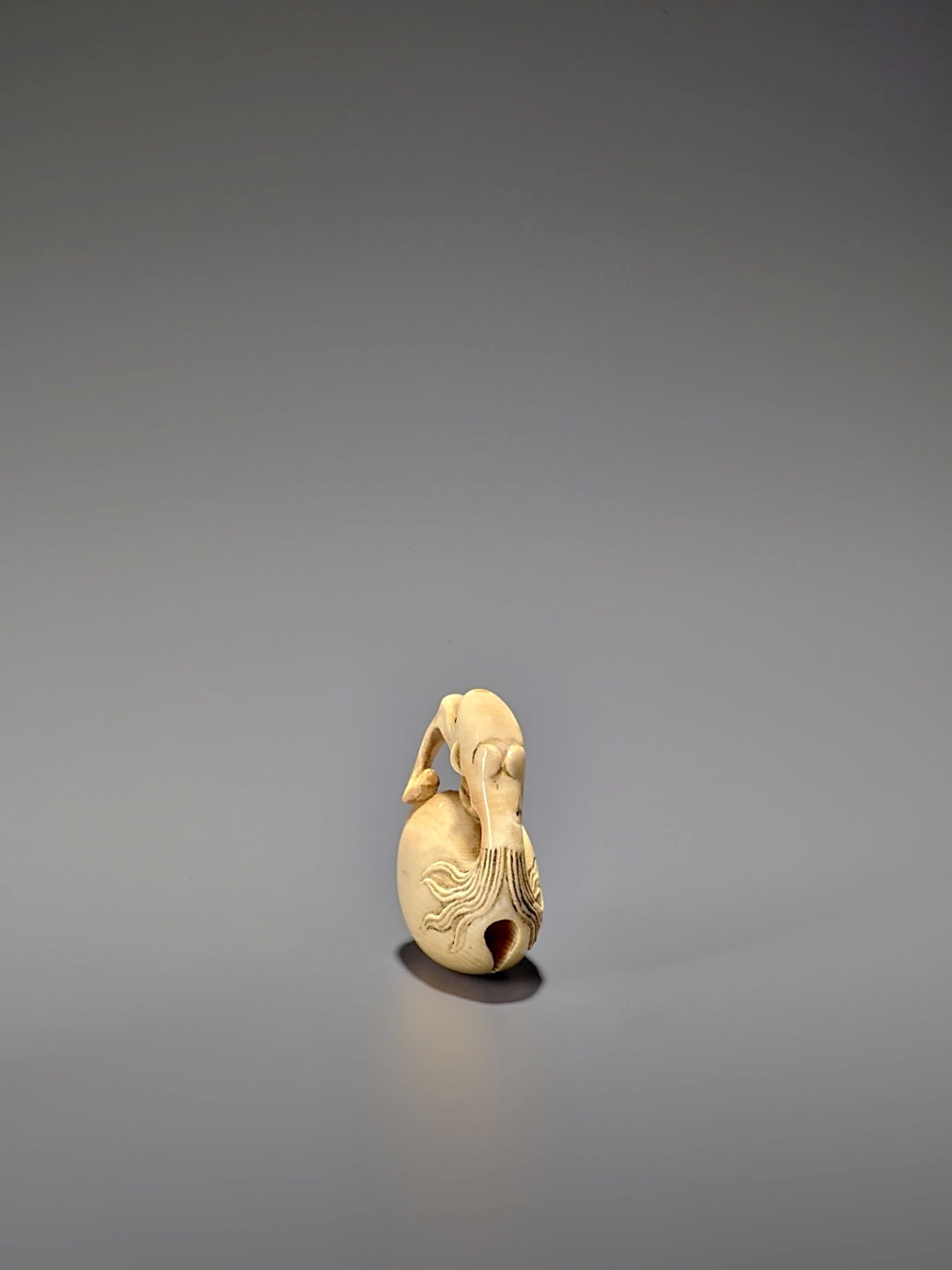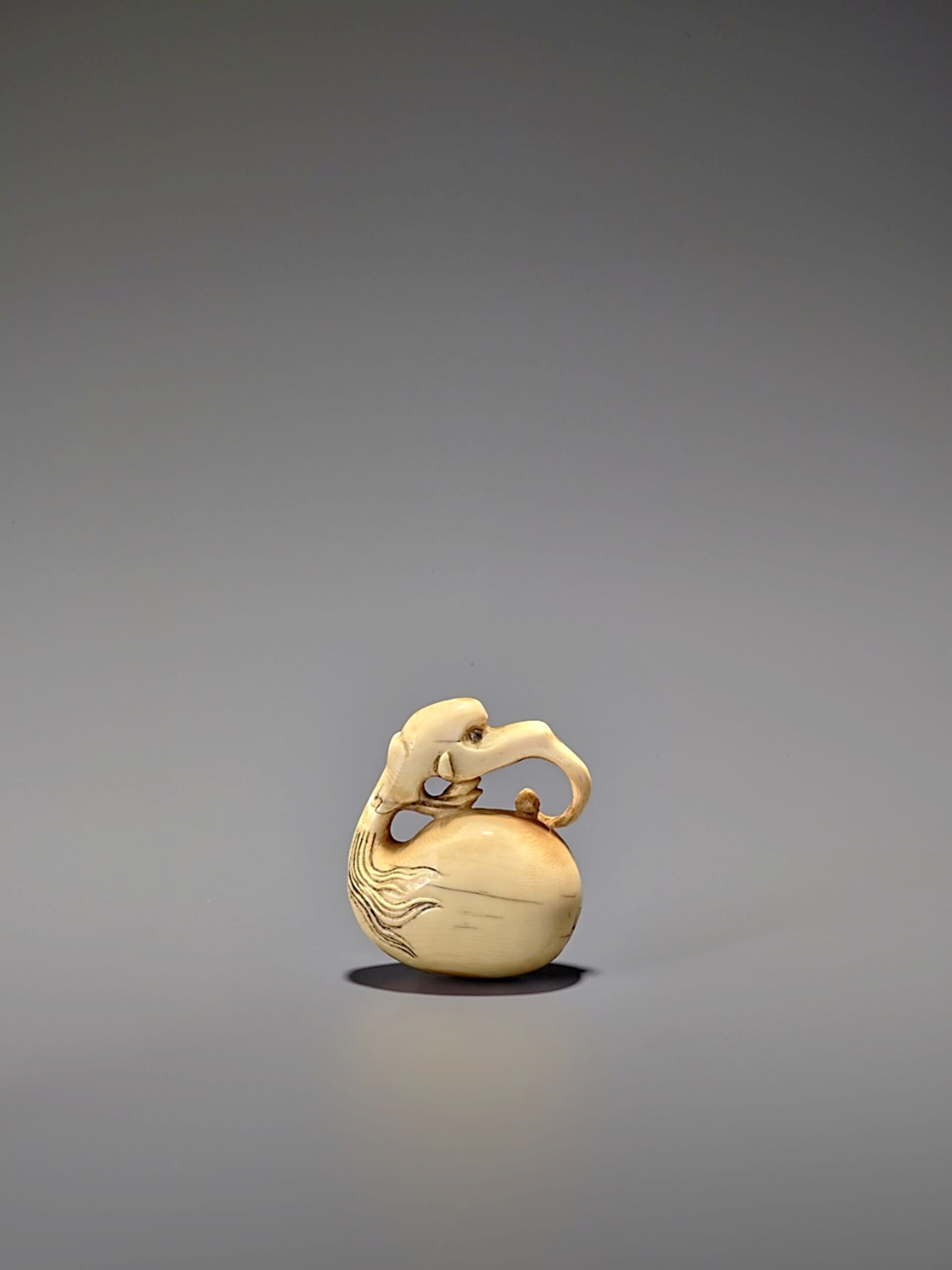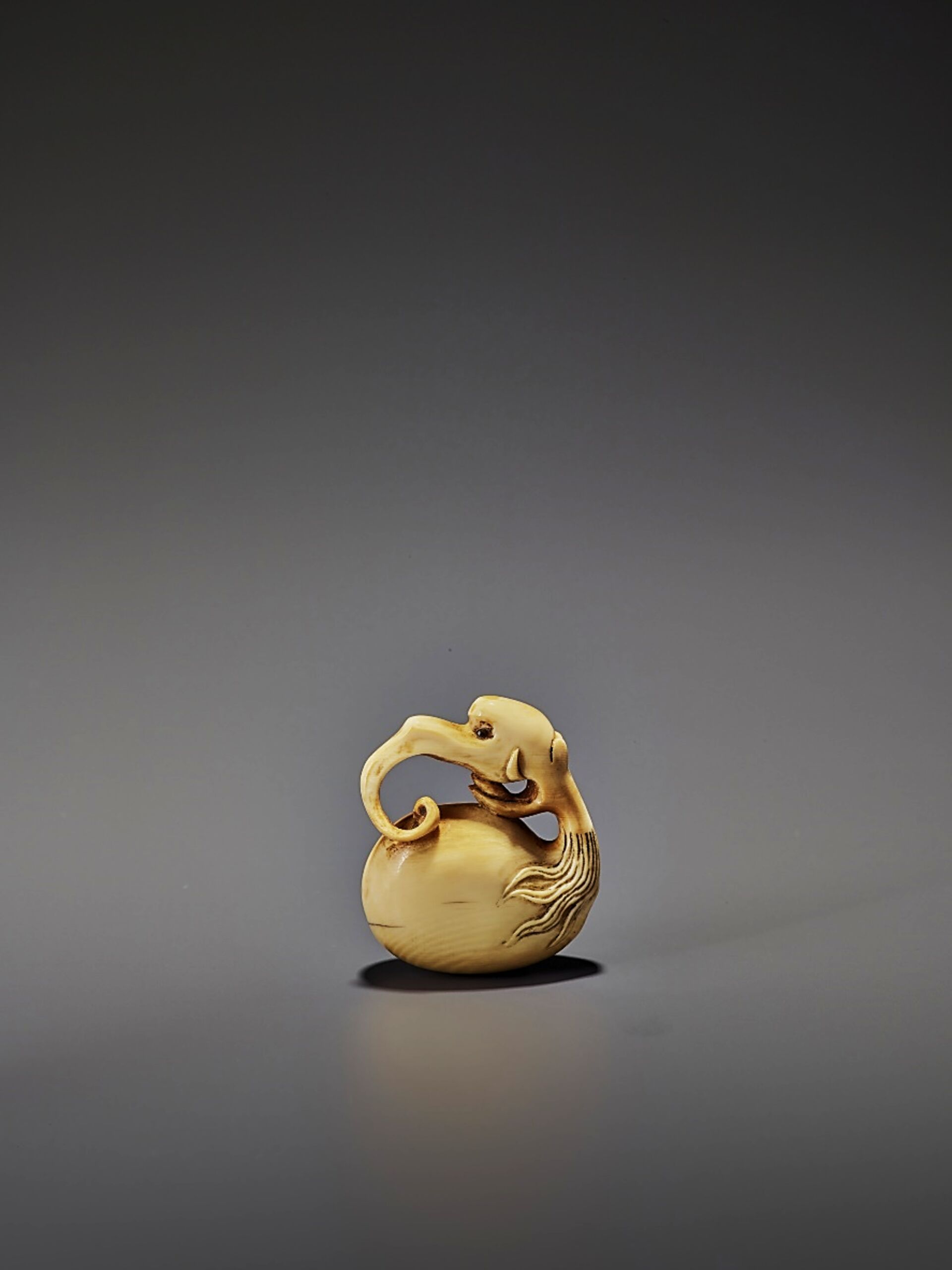 Elfenbein-Katabori. Der Tempelgong Mokugyo, unterseitig versehen mit einem Schlitz der an beiden Seiten in eine runde Öffnung mündet, hat auf der Oberseite, quasi als Griff, Hals, Kopf und Rüssel eines Baku. Dessen Augen sind in dunklem Material eingelegt. Originell, witzig, frech, sehr handschmeichlerisch, mit einer schönen glatten Oberfläche, stellenweise mit goldbrauner Alterspatina und einigen feinen horizontalen Alterssprüngen. Höhe 48mm, Breite 44mm, Dicke 24mm. Nicht signiert Alter: 2. Hälfte 19.Jh, Asakusa-Schule, Tôkyô, im Stil von Kokusai/Gyokumin.