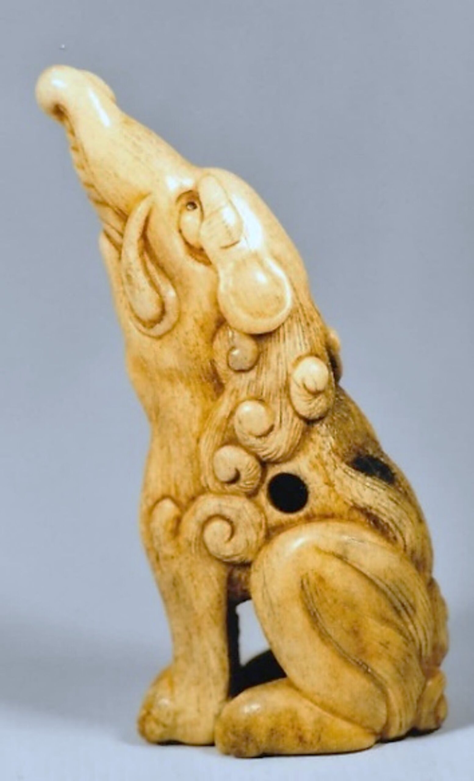 Hirschhorn-Katabori. Das Fabeltier mit Elefantenrüssel, Eberzähnen, Rinderohren, Löwenmähne, 4 Klauen an jeder Extremität und Flammen, die aus seinem Hinterteil kommen, hat im Sitzen die vier Beine eng beisammen und blickt erwartungsvoll und nicht unfreundlich gen Himmel. Höhe 80mm. Himotoshi durch die linke Flanke und den Bauch, die natürliche Höhlung des Knochens ausnützend. Unterseitig auf der linken Hinterpfote die Signatur KOGETSU (K332, K183).