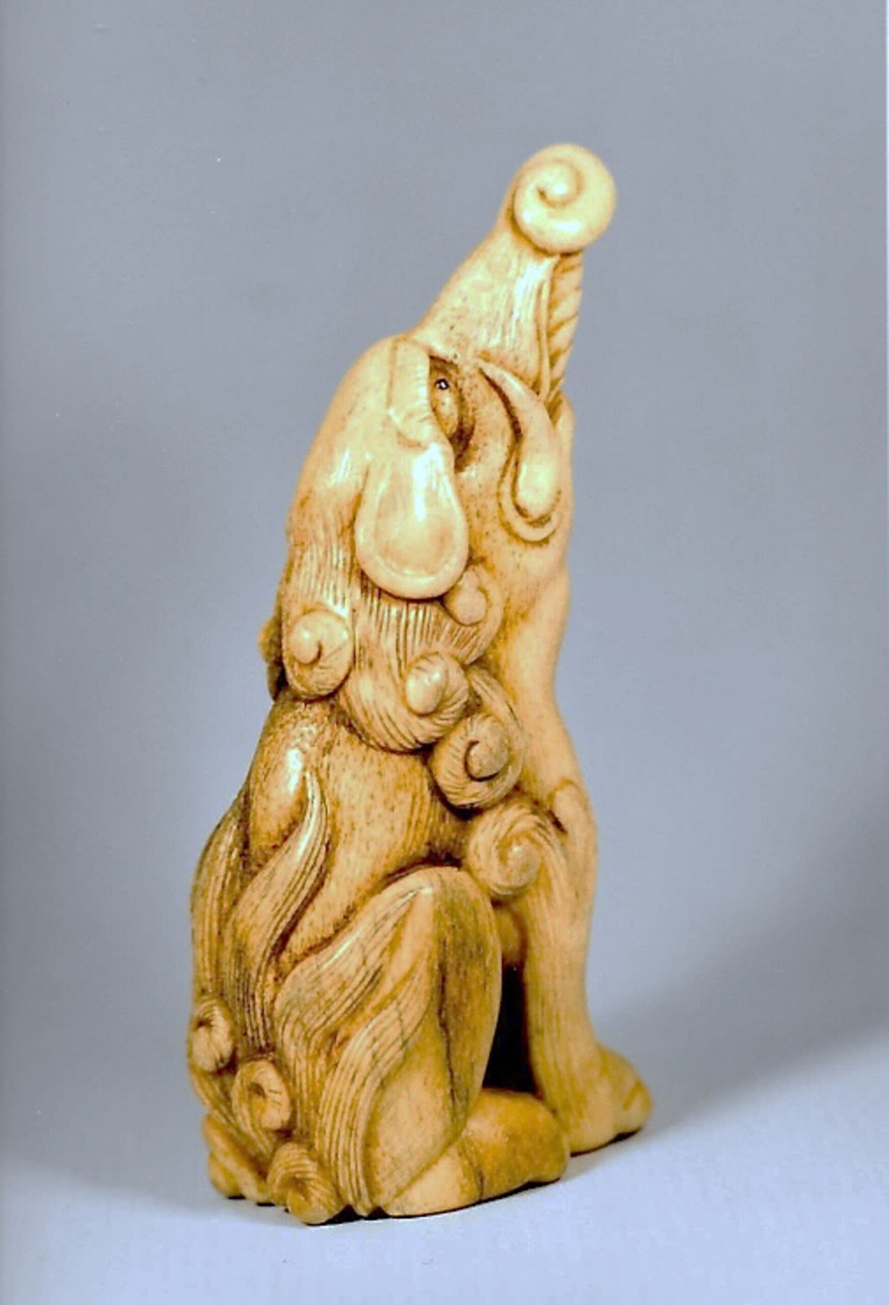 KÔGETSU: Mindestens vier Schnitzer dieses Namens sind bekannt. Lazarnick, N&IA, S.634, gibt diese Signatur wieder. Ueda Reikichi Nr. 507 weist den Schnitzer der mittleren Periode zu. Neil Davey verzeichnet ihn unter Nr. 1181 und reiht ihn zeitlich als „early“ ein. Jonas, S.139 ordnet ihn dem 18.Jh. zu. Die etwas makabre Gestaltung und die Verwendung von Hirschhorn könnten für eine Nähe zur Asakusa-Schule, Tôkyô, im 19.Jh. sprechen.