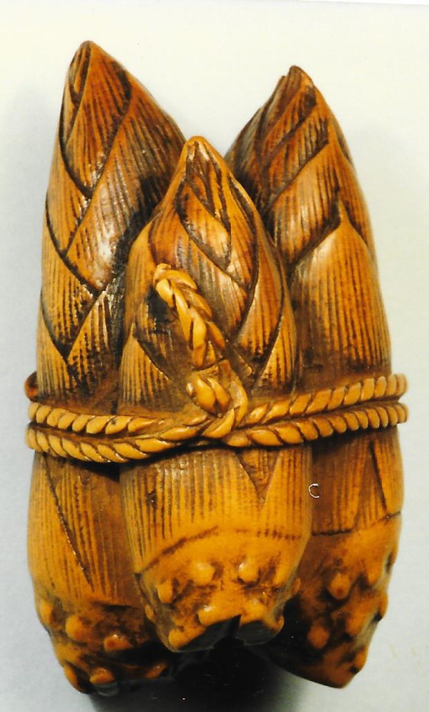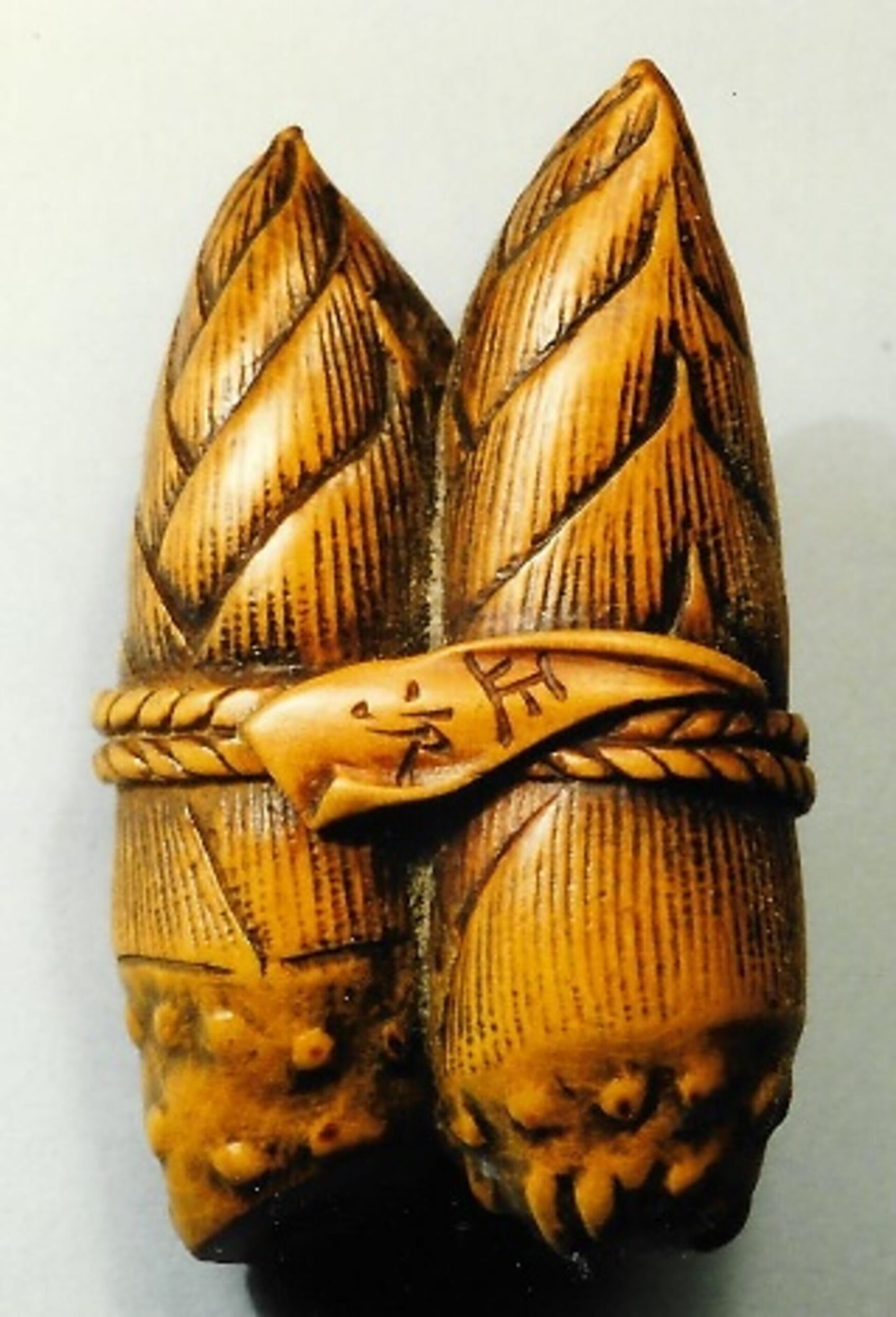 Holz-Katabori. Drei Bambussprossen sind mit einem doppelt geschnürten Seil zusammengebunden. Die Himotoshi ergeben sich in den Zwischenräumen zwischen Seil und Bambussprossen. Auf einem aus dem Seil herausragenden Stück Stoff die Signatur: MASATSUGU (K191, K211). Schöne Glanzpatina, gut abgegriffen und doch sehr gut erhalten. Höhe 45mm. Alter: 19.Jh.,
