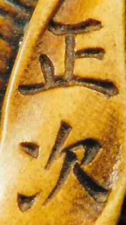 MASATSUGU: Davey/Hindson S.1489 erwähnt sechs Schnitzer, die mit dieser Signatur signierten, Lazarnik MCI S.481 sieben Schnitzer. Von jeweils einem der vielen sagen sie, er habe in Holz gearbeitet, Davey datiert diesen ins 18.Jh., MCI in die erste Hälfte 19.Jh. Daneben gibt es noch den grossen Kaigyokusai Masatsugu, Mitte bis 2. Hälfte 19.Jh., für den dieses Stück aber untypisch ist.