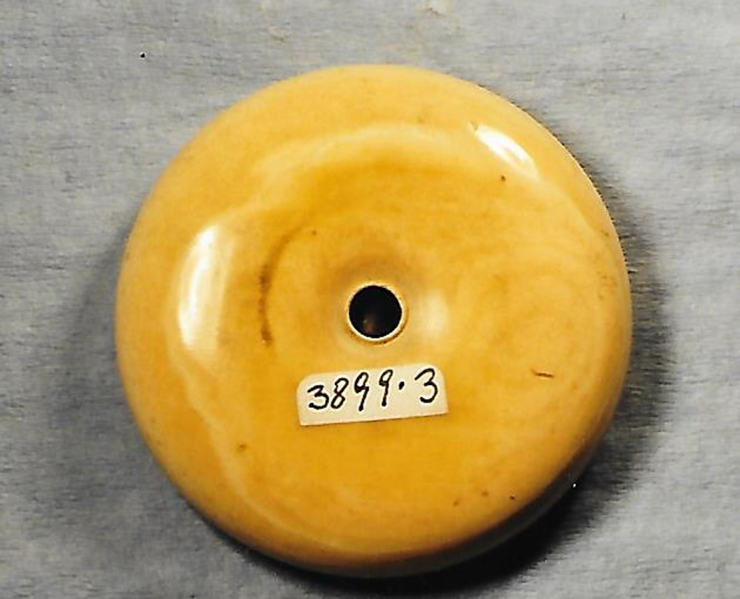 Kagamibuta, die Kapsel aus Elfenbein, die Platte Shibuichi, mit Silber- und Goldauflagen. Durchmesser 42mm. Zu sehen ist ein Teil des Gesichtes und die rechte Schulter einer grossen Buddhastatue. Die Meinungen in der Literatur gehen auseinander, ob es die Statue in Kamakura oder die in Nara ist. Beide sind sehr gross. Ein vergleichsweise kleiner Mann, vermutlich ein Pilger, den Strohhut trägt er auf dem Rücken, hat bereits die Schulterhöhe erklommen. Er reicht seinem Gefährten, der sich noch weiter unten befindet, ein Tuch, auf dass dieser es ergreife und leichter nach oben steige. — Von diesem Motiv gibt es etliche Netsuke, siehe umseitig. —Alter ca. Mitte bzw. zweite Hälfte des 19. Jh. Nicht signiert. Alle umseitig aufgeführten Stücke sind ebenfalls nicht