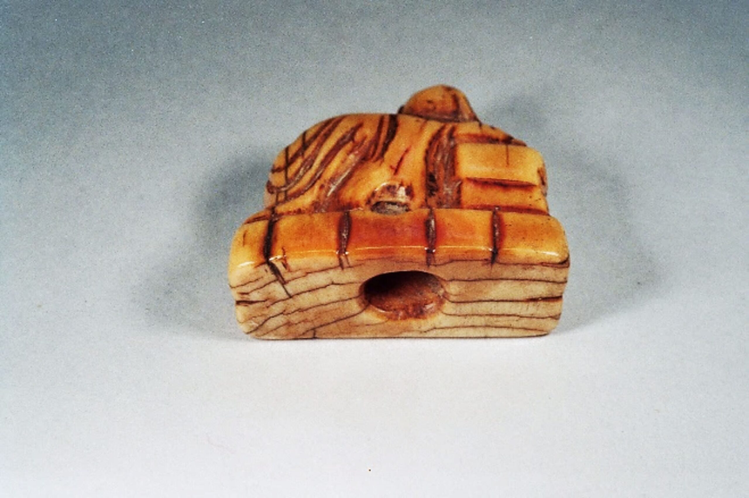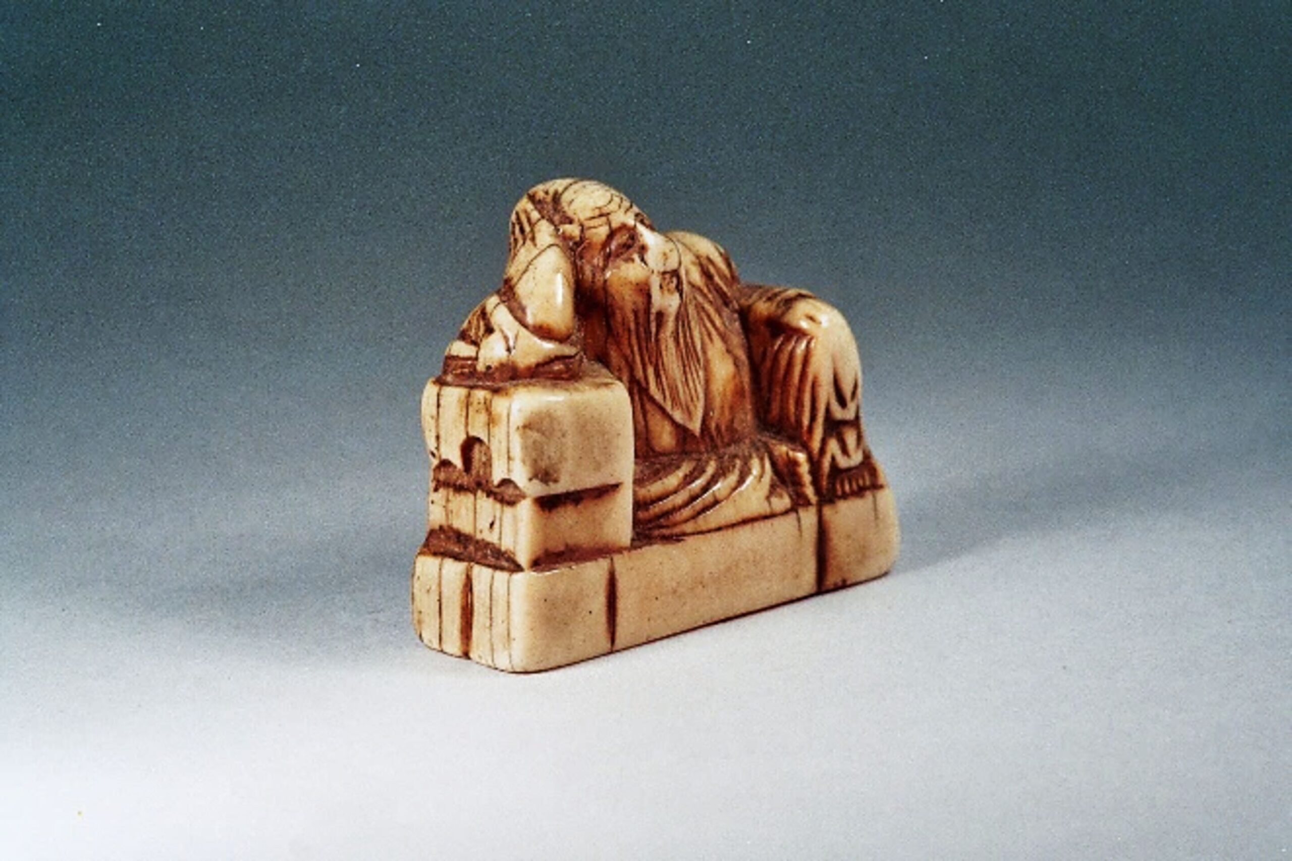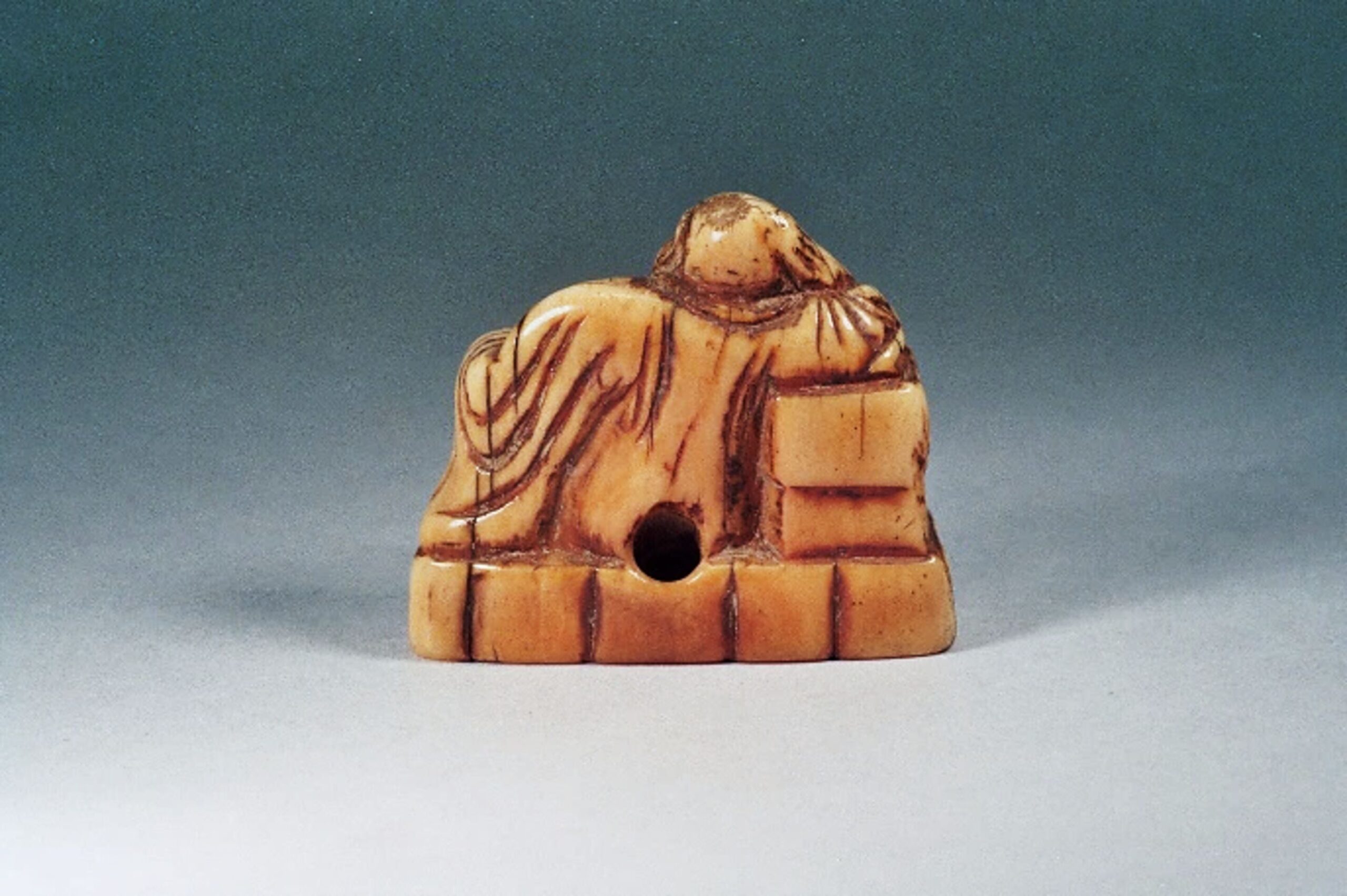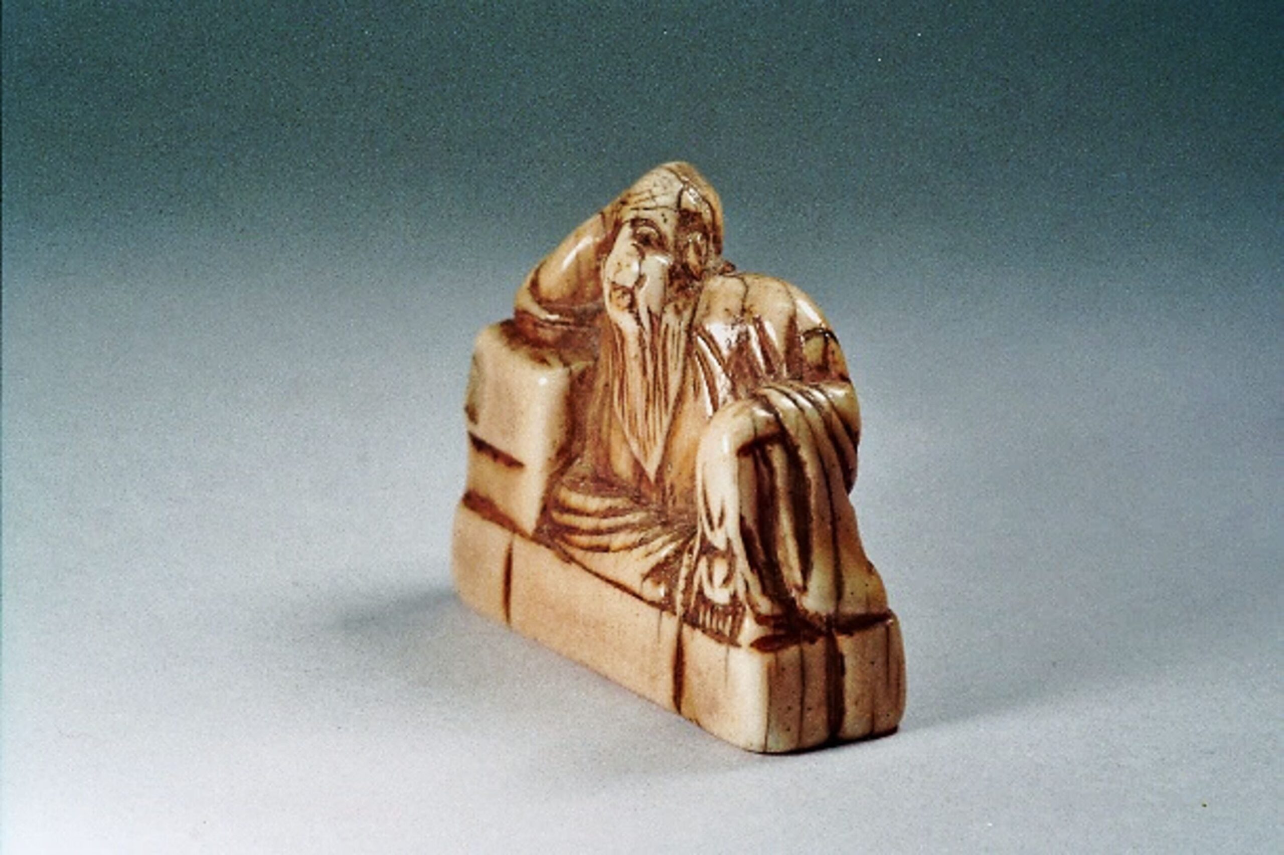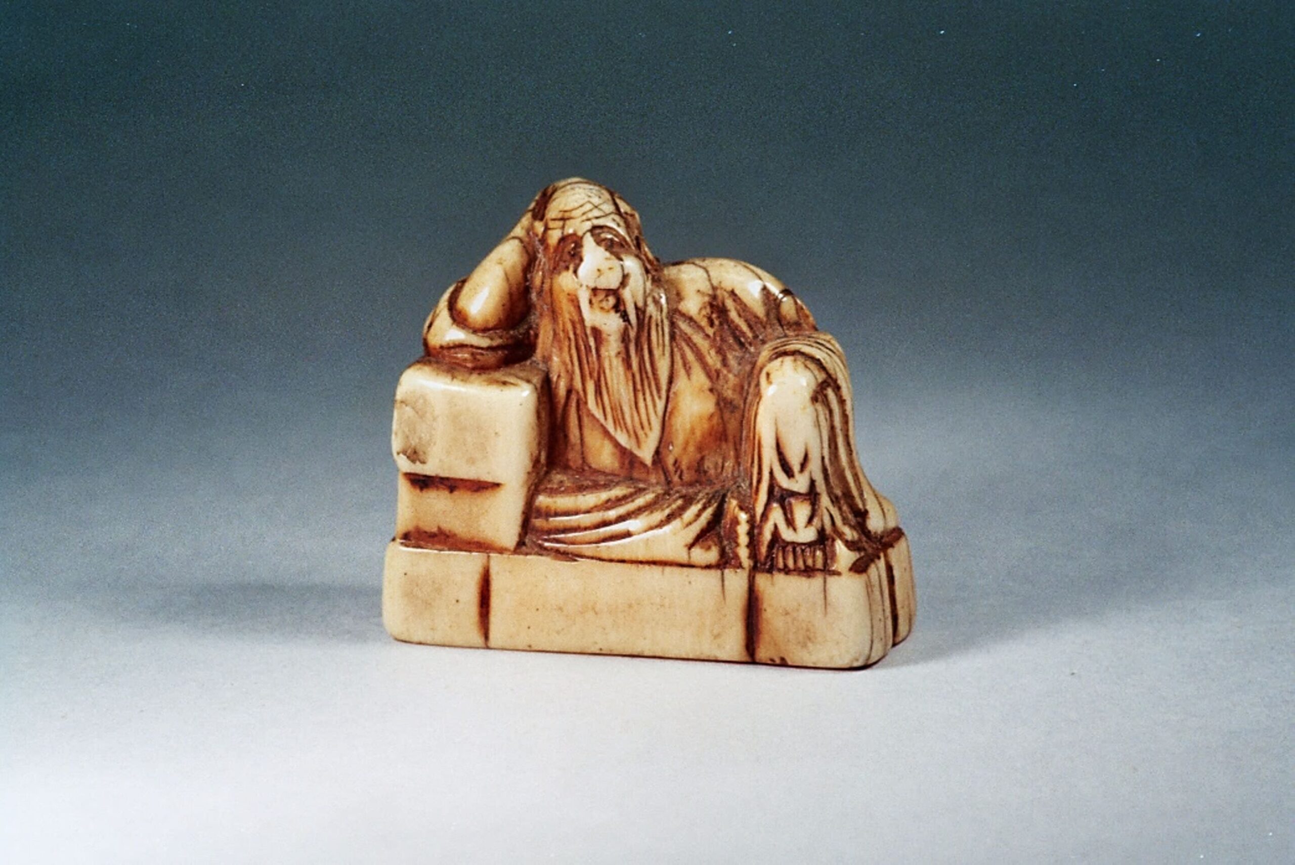 Elfenbein-Katabori. Gewöhnlich wird dieser Netsuketypus als Weiser oder als Chinese bezeichnet, der seinen rechten Arm auf ein niederes Tischchen abstützt. Der alte Mann sitzt auf einer vertikal gerippten Basis. Er scheint gelassen in die Ferne zu blicken, vielleicht nachzudenken. Die Linke liegt auf dem aufgestellten linken Knie, das wie die Nase von vielem Gebrauch abgenützt ist. Der lange Bart ist betont dreieckig geschnitten. Nicht nur der Mann ist alt, auch das Elfenbein weist zahlreiche Alterssprünge auf. Das Tischchen ist aussen mit einem Dreiblattmotiv beschnitzt, das in etwa an ein Wappen erinnert. In der Basis ein grosses Himotoshi, im Rücken ein kleineres. Rückseitig sehr beeindruckende bernsteinfarbige Alterspatina. Gut abgegriffenes altes Stück. Breite 38mm, Höhe 32mm. Alter: vermutlich um 1700. Nicht signiert.