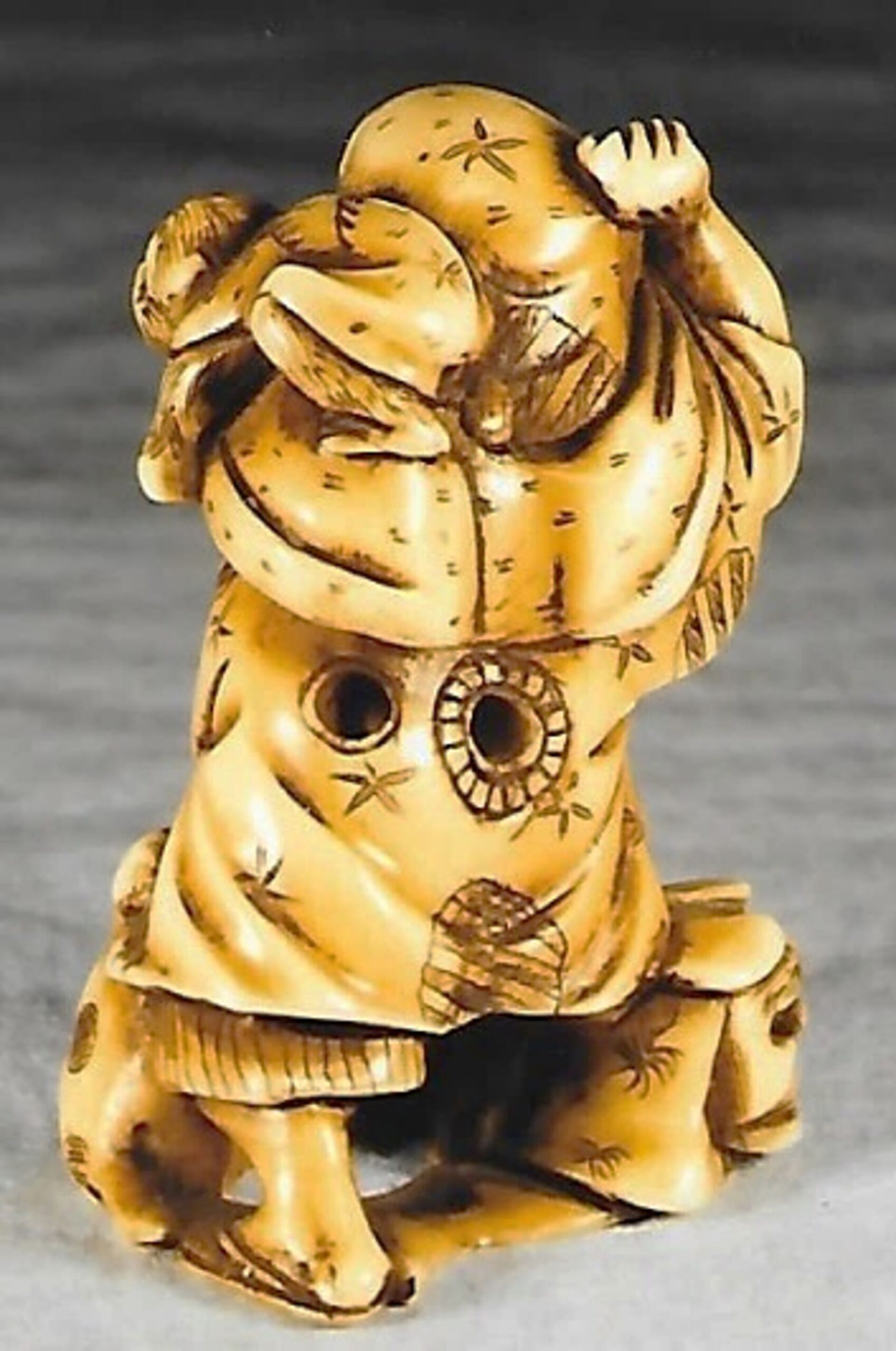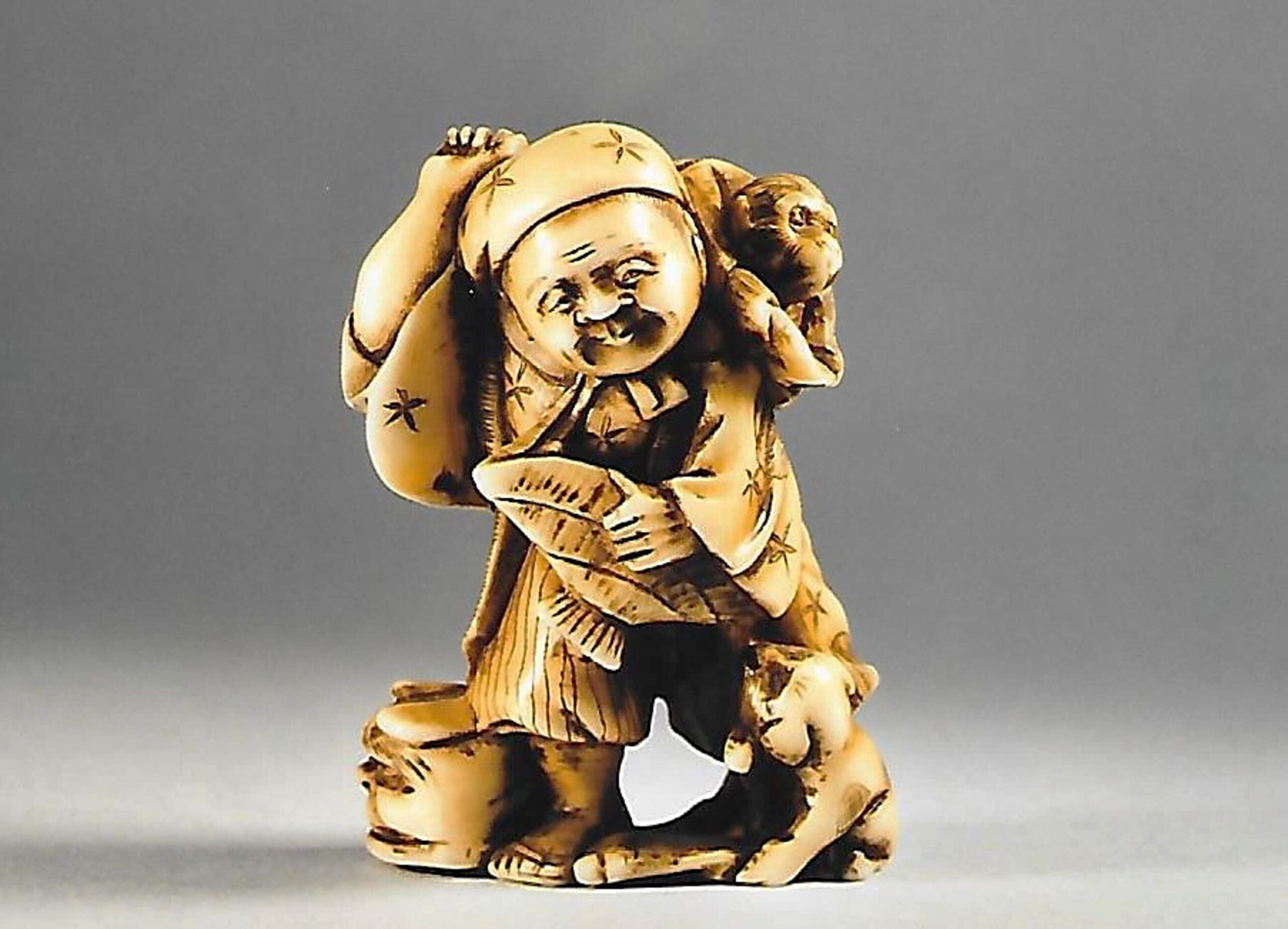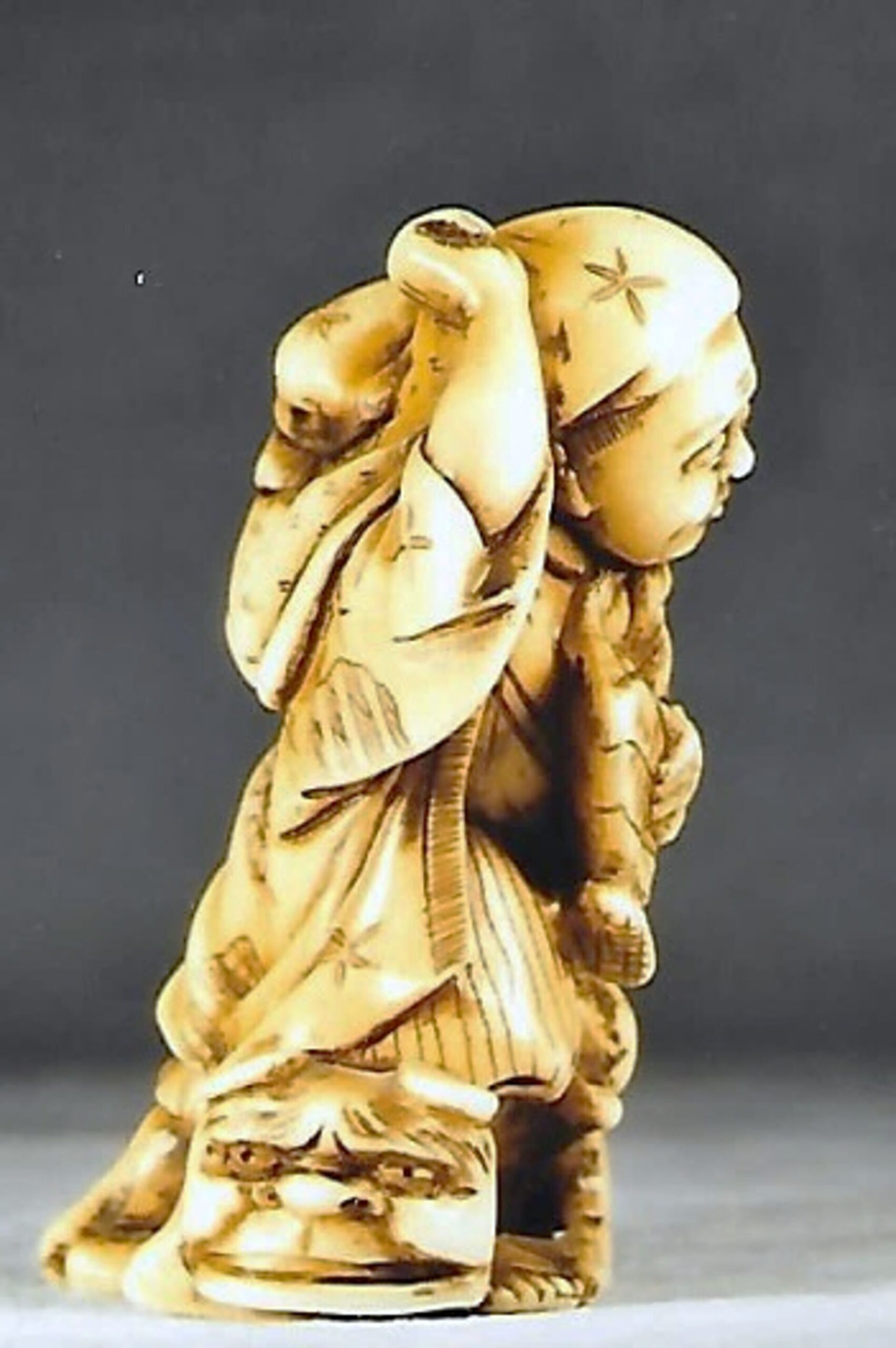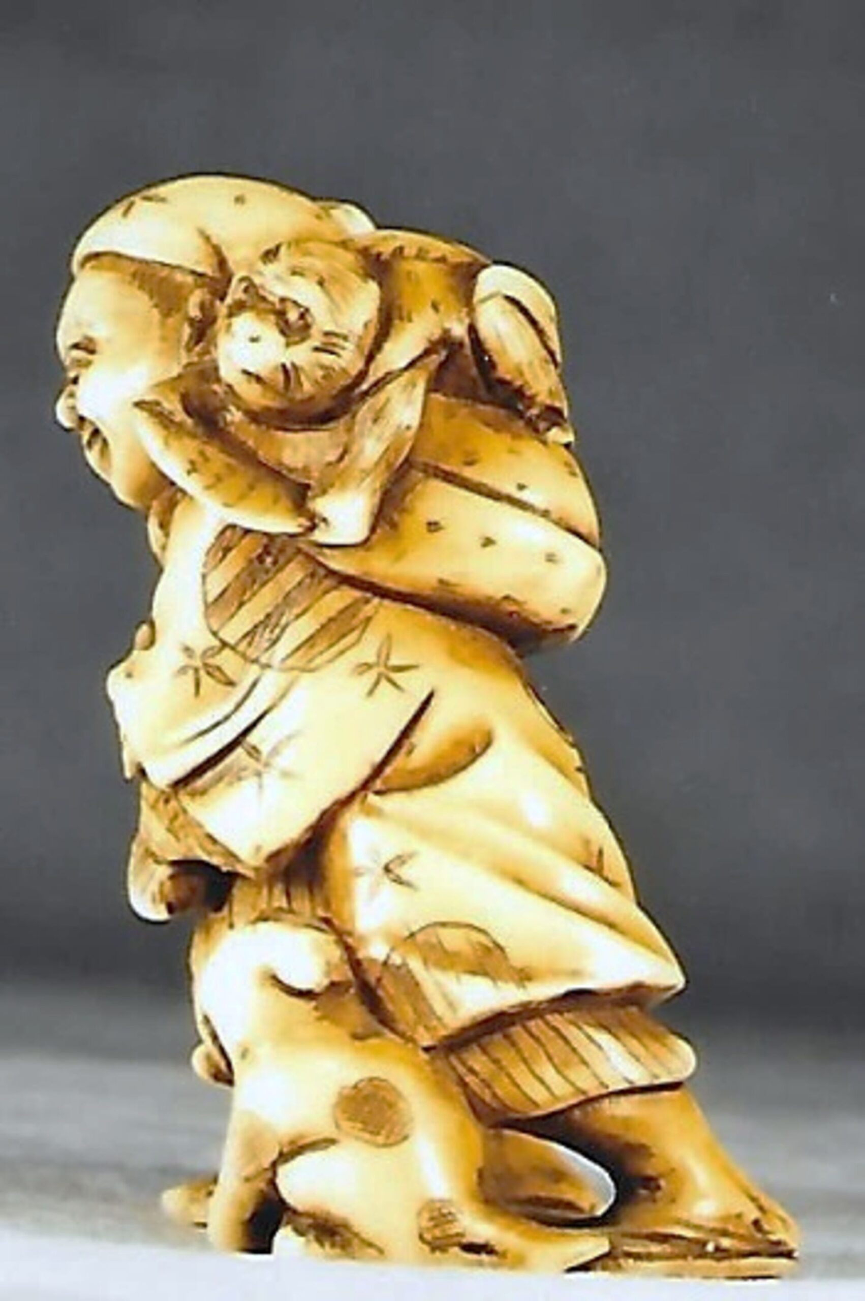 Elfenbein-Katabori. Der Glücksgott Daikoku, Schutzgott der japanischen Nation, zu erkennen an der typischen Schlappmütze, schreitet kräftig aus. In der linken Hand hält er einen zusammengefalteten Strohhut, was dafür spricht, dass er sich auf Wanderschaft befindet. Das Äffchen auf seiner Schulter kennzeichnet ihn als Affenschausteller, Sarumawashi. Die üblichen Sarumawashidarstellungen lassen das Äffchen Frachte aus dem Reisekorb ihres liegend schlafenden Herren stehlen. Hier nicht so. Das Äffchen liest aus einer Schriftrolle, was an den gelehrten Affen Songoku denken lässt. Es scheint nicht abwegig, dass der Gott von einem besonderen Affen mit besonderen Begabungen begleitet wird. Sarumawashi genossen in der Edo-Zeit (1615-1868) das Privileg ungehindert reisen zu dürfen, weshalb sie gerne als Kundschafter und Spione eingesetzt wurden. Aktuell hat der Glücksgott die Rechte erhoben, eine Geste, die gewöhnlich als Bohnenwerfen zu Neujahr gegen Dämonen interpretiert wird. Tatsächlich befindet sich auf dem Boden eine Dämonenmaske, der die Aktion gelten mag. Begleitet wird Daikoku von einem kleinen gefleckten Hund, der zu seinen Füssen sitzt und sich eben mit der rechten Vorderpfote an der linken Backe krault. Daikokus Gewand ist mit Sternen dekoriert. Das kreisförmige Zeichen mit hellen und dunklen Streifen könnte ein Wappen sein. — Alles in allem also ein sehr vielfältiges Netsuke und eine ungewöhnliche Darstellung Daikokus, der sonst in allen möglichen Situationen und Verkleidungen dargestellt wird. — Höhe 42rnm. Im Rücken zwei kleine umrandete Himotoshi. Keine Signatur. Alter: die Grösse, die kleinteilige Schnitzarbeit, das ungewöhnliche Sujet und die kleinen ungebrauchten Himotoshi lassen eine Entstehung im späten 19 .Jh. vermuten.