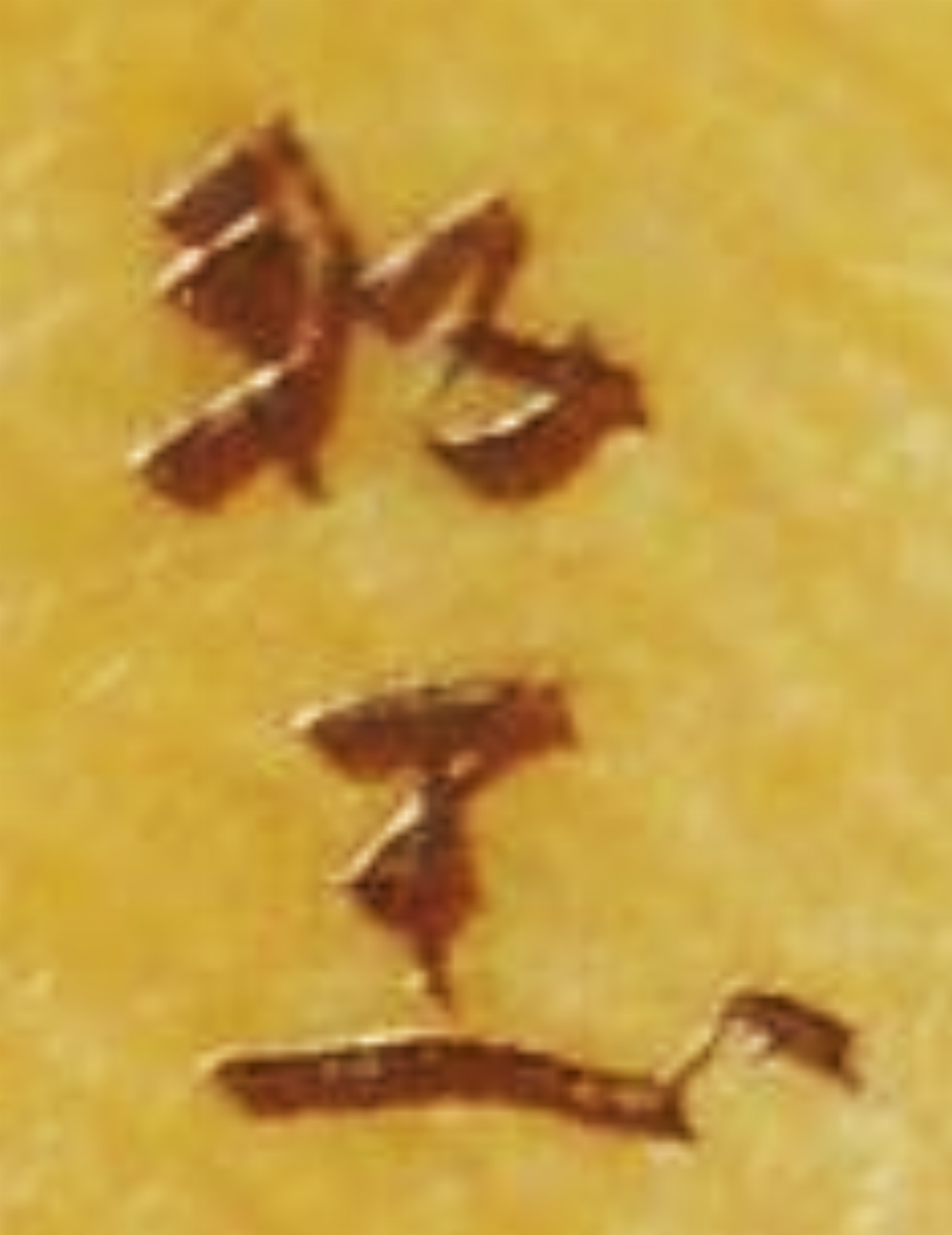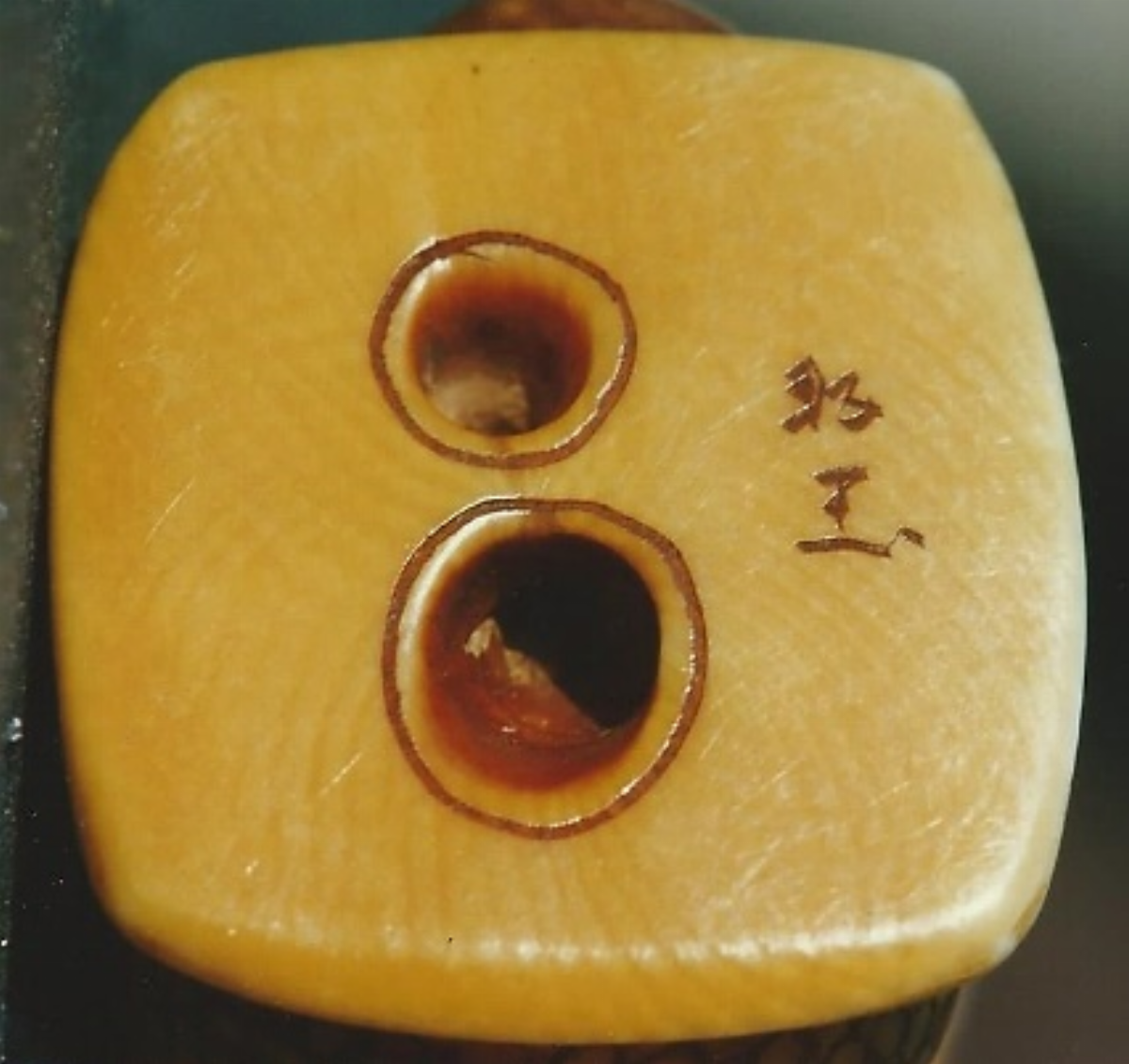 Flasche ihre Wohltaten aus. Augen, Brauen und Haare sind schwarz gefärbt. An den exponierten Stellen entfärbt und glänzend. Unterseitig die umrandeten Himotoshi. Dort auch die Signatur: -GYOKU oder –TAMA. Alter: 20. Jh.