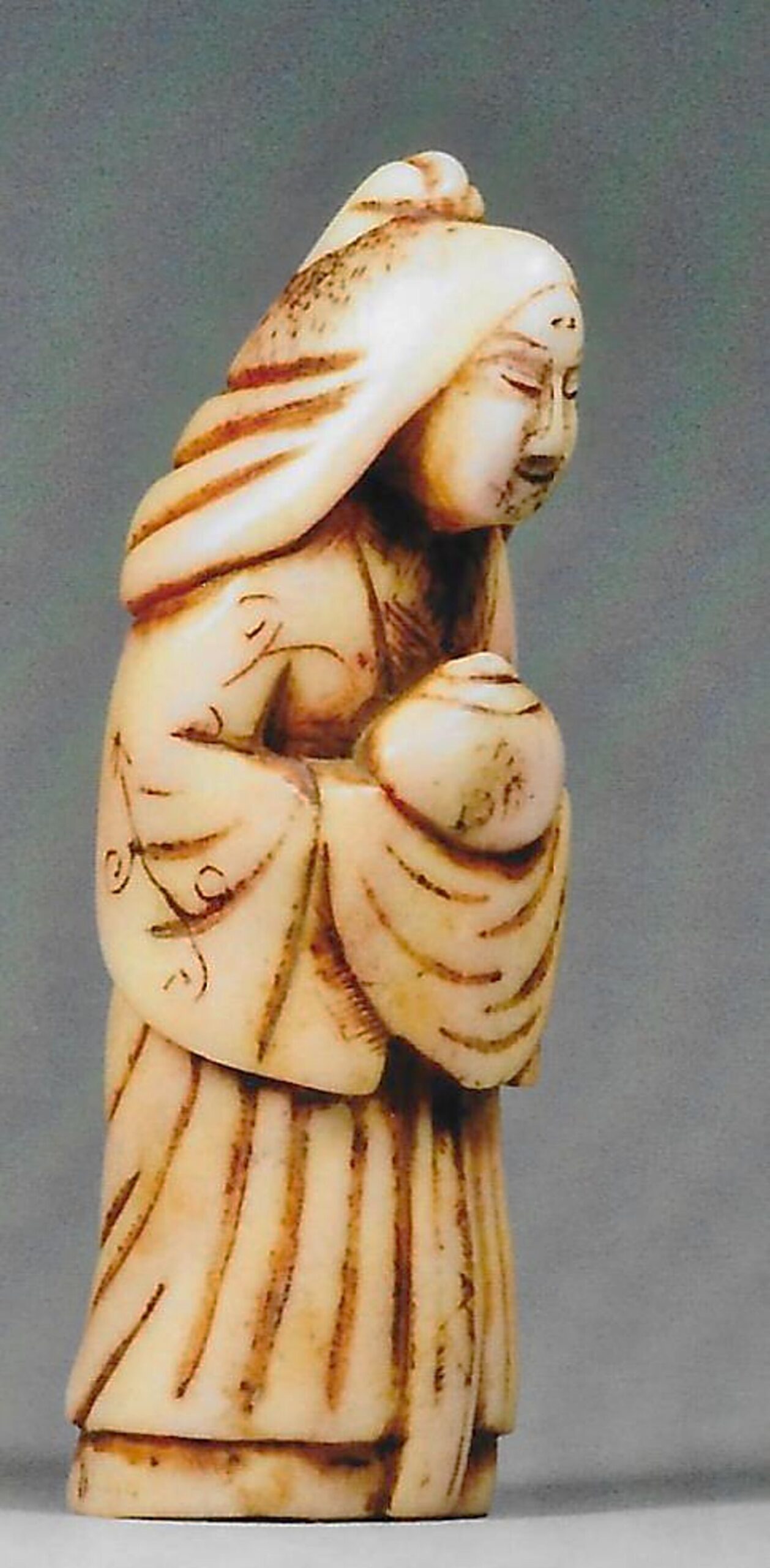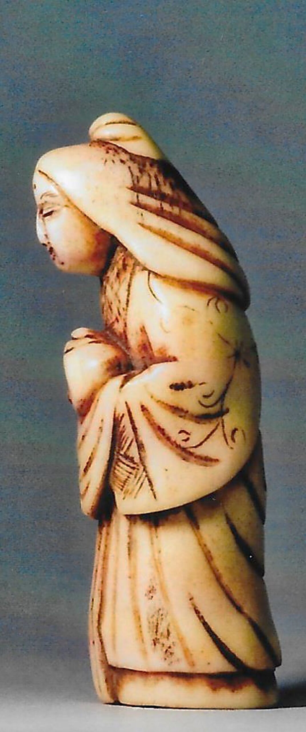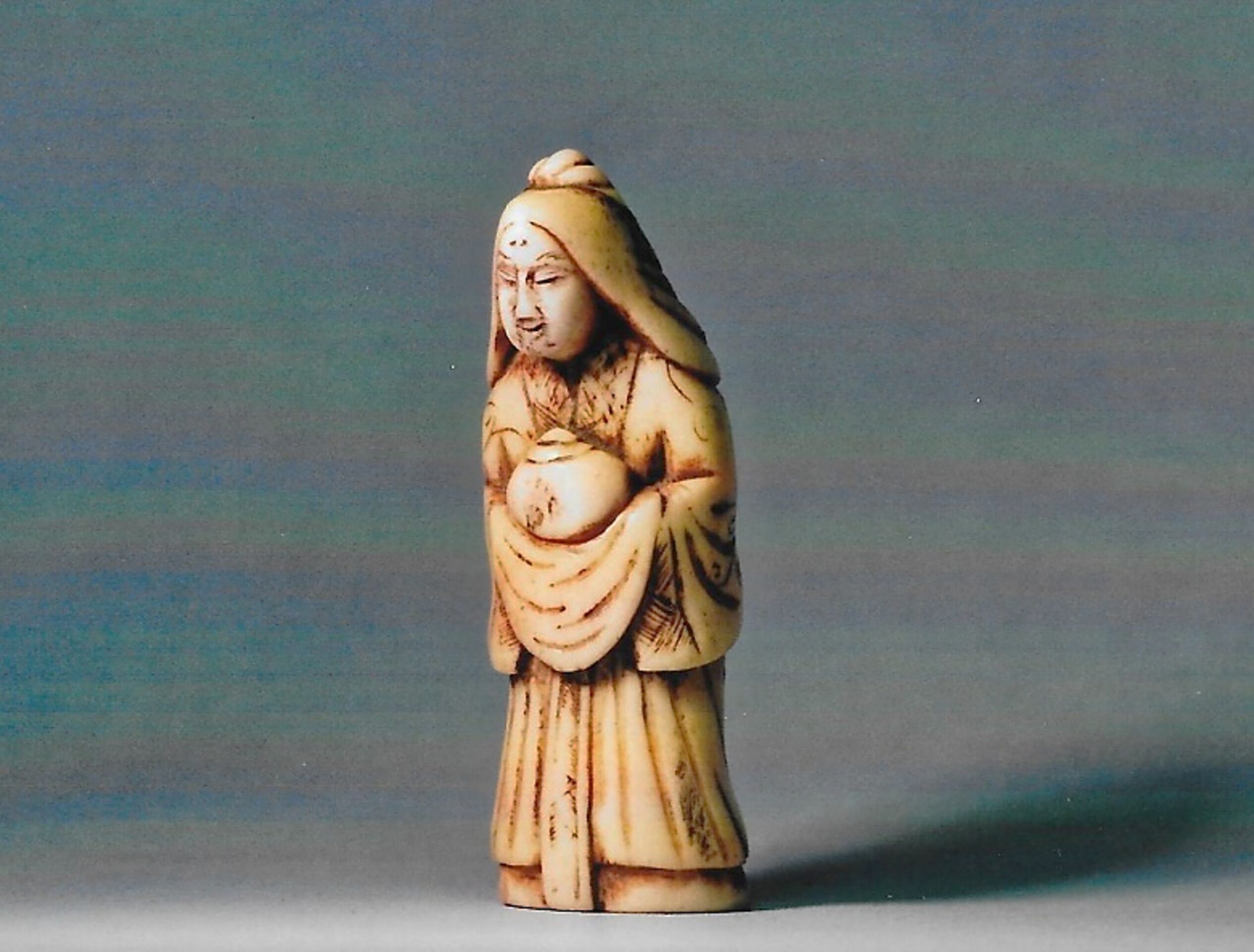 Dieses Motiv ist als Netsuke sehr selten. Bei der dargestellten Figur könnte es sich um Kannon, Benten, Okame oder einer der Töchter des Meeresgottes Ryüjin handeln.