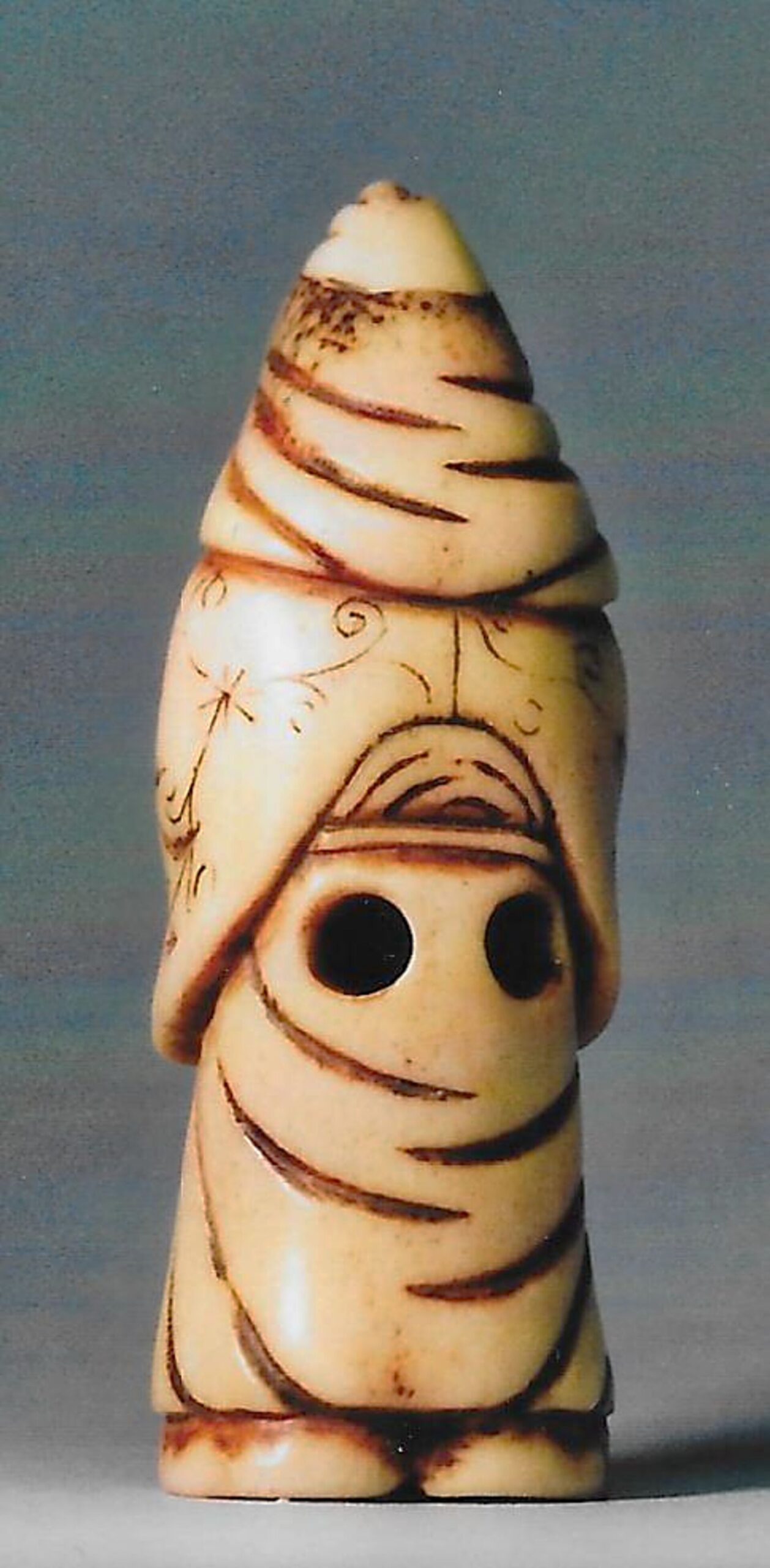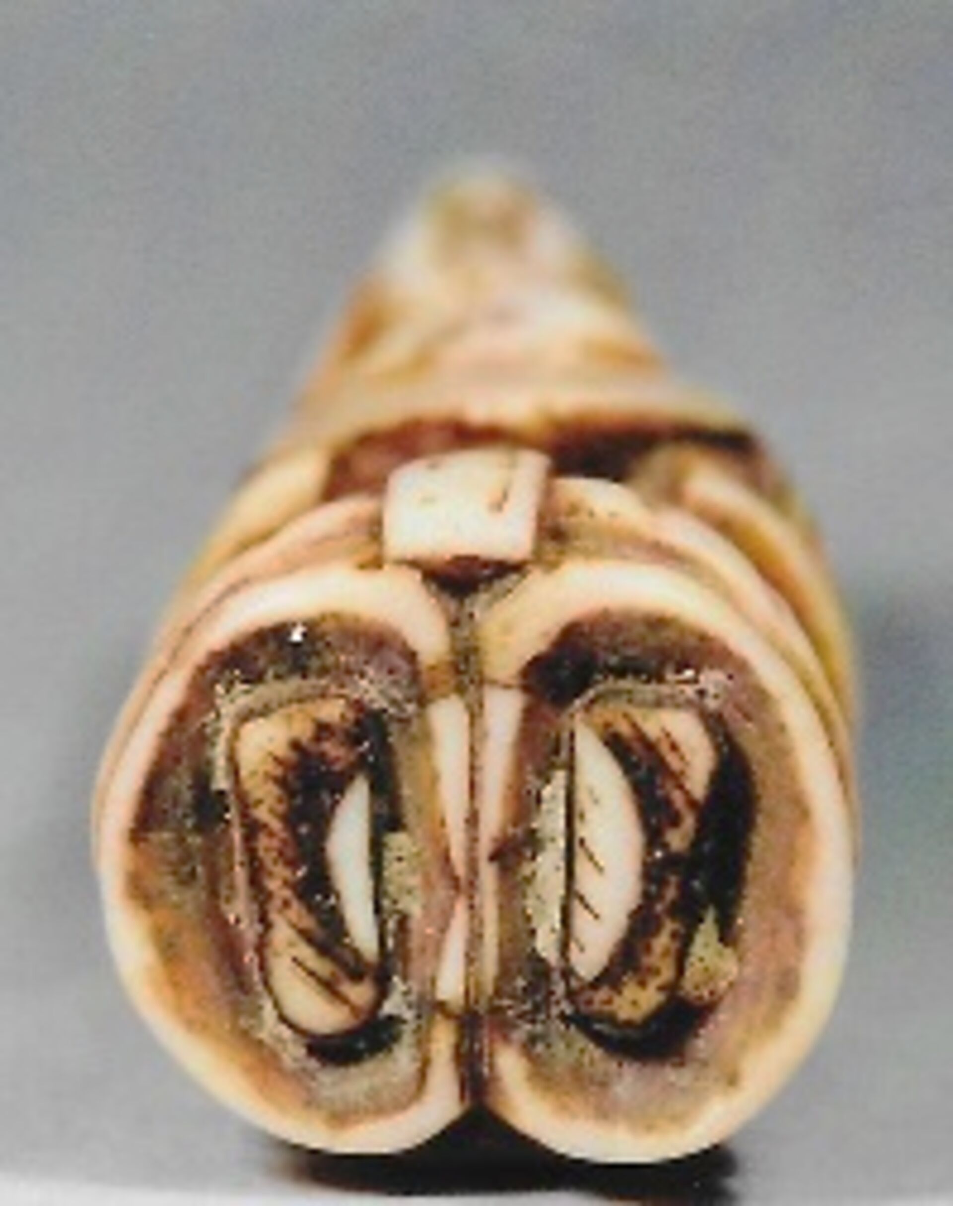 Hirschhorn-Katabori. Die Figur, in Haltung und Kleidung als Dame erkenntlich, steht etwas vorgeneigt in langem Gewand und hält vor sich das Glücks-/Wunschjuwel Tama. Das Gewand ist mit zartem Rankenmotiv dekoriert. Höhe 62mm, nicht signiert. Die zentrale Spongiosa ist oben und unten mit einem Stopfen kaschiert und verschlossen. Rückseitig zwei gleichgrosse Schnurlöcher Himotoshi. Alter: ca. Mitte 19.Jh.