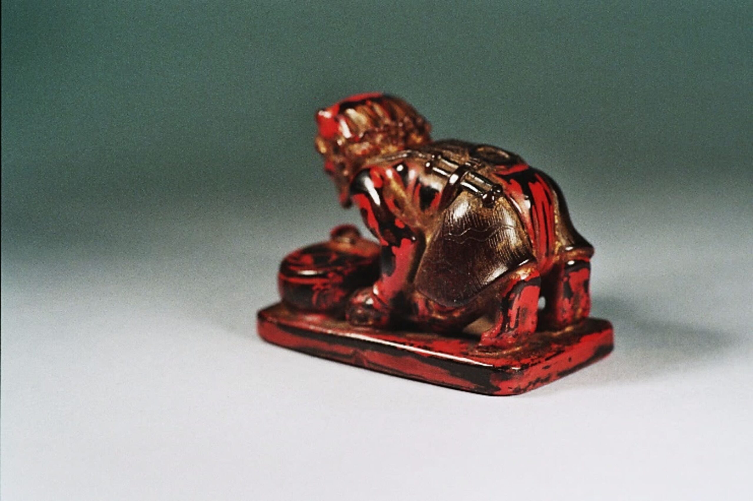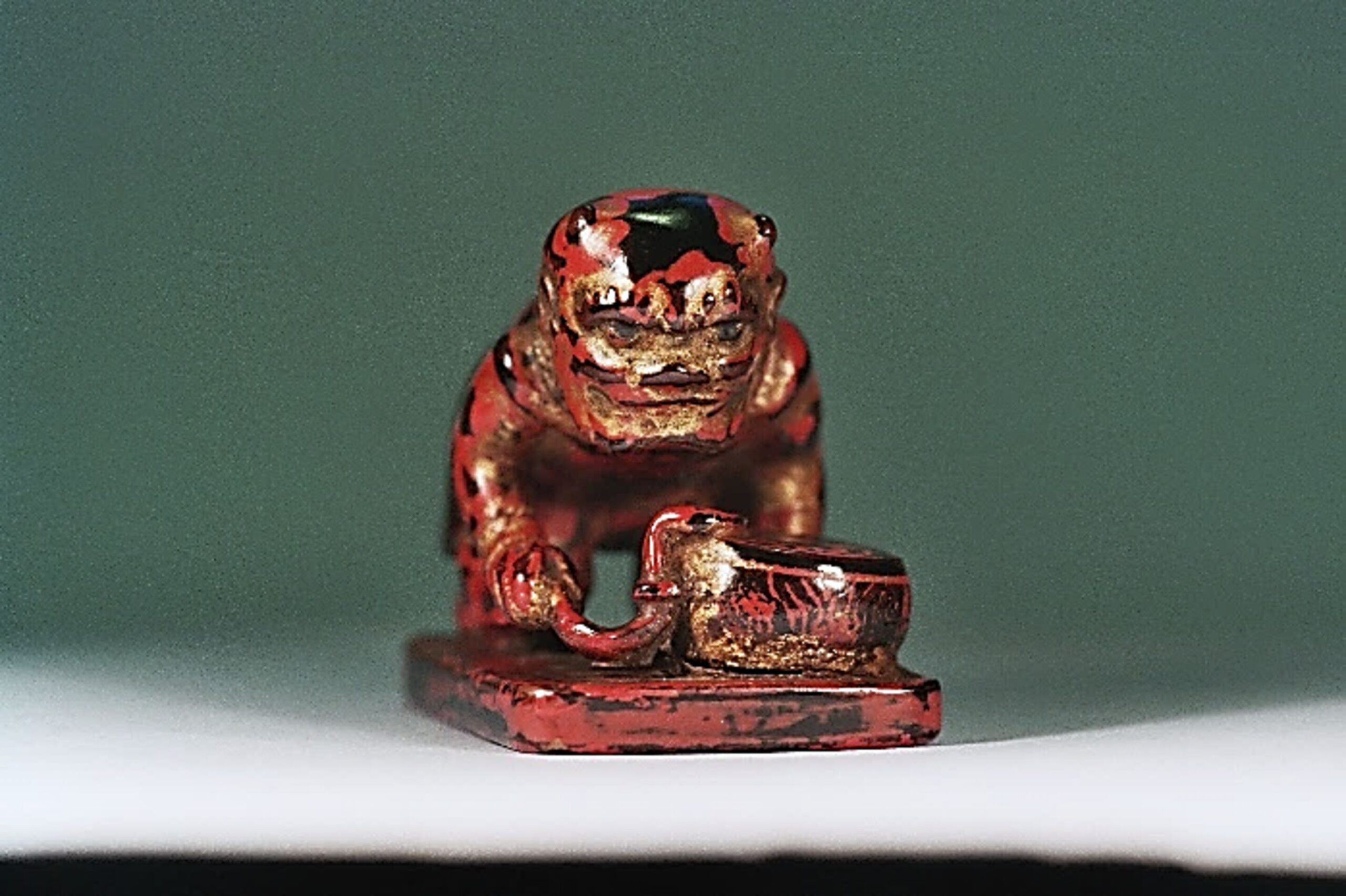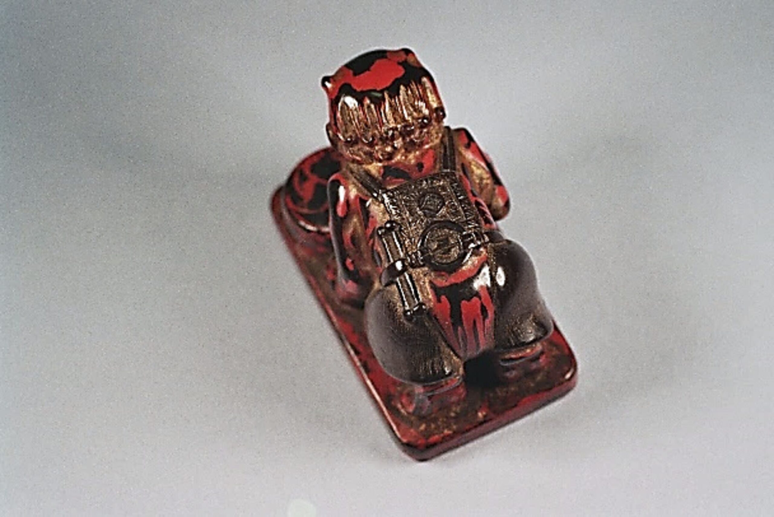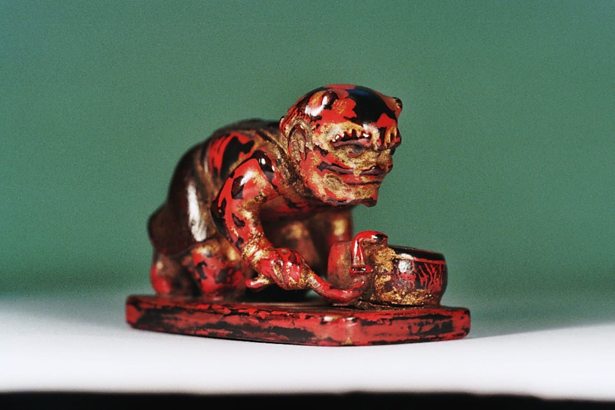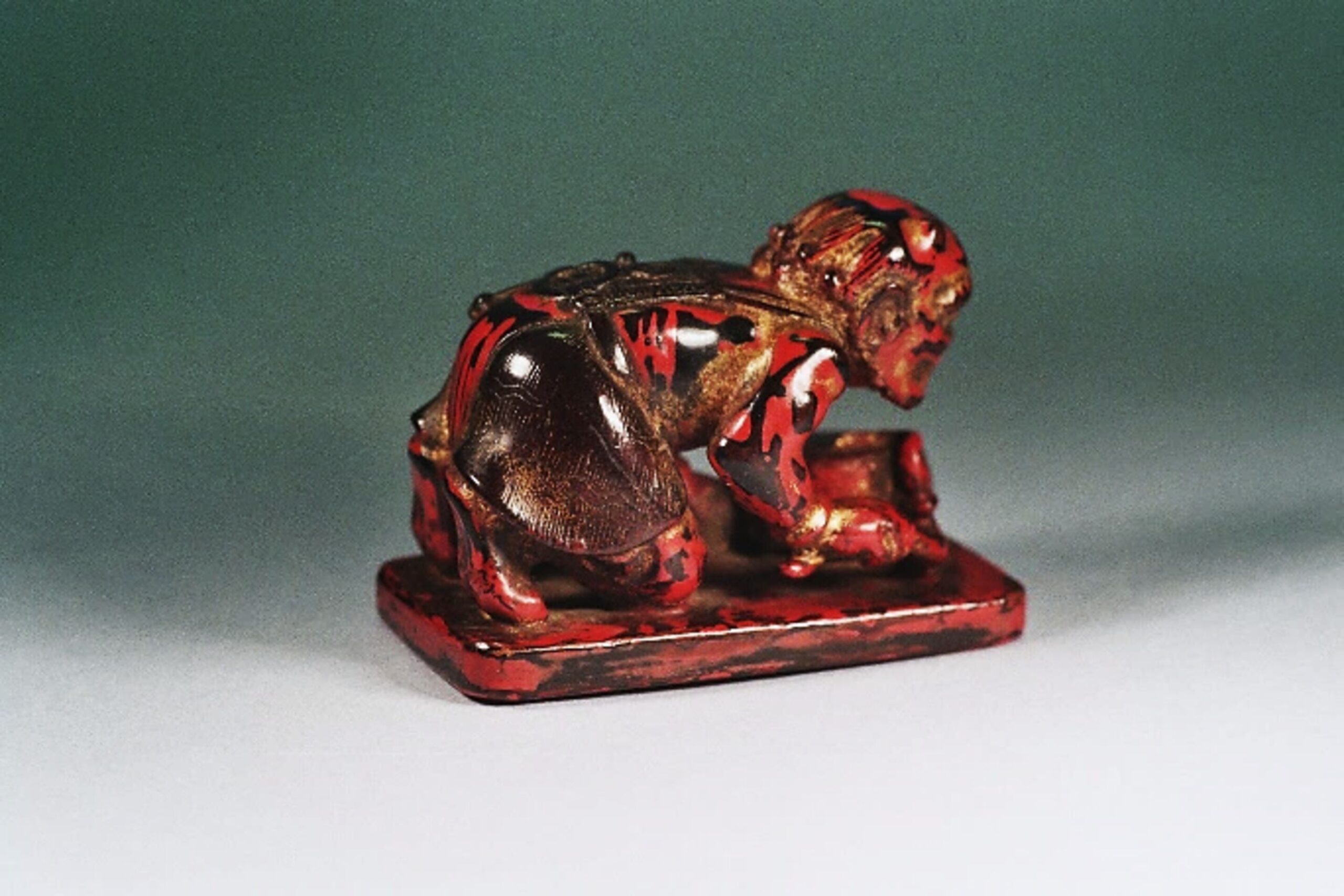Katabori, Negoro-Lack mit Resten von Goldlack. Die auf einer viereckigen Platte kniend vorgebeugte Figur ist an den Hörnern und der Trommel zu erkennen als der Donnergott Raiden, auch genannt Raijin. Er blickt aus himmlischen Höhen hinunter auf die Erde. Das Nackenhaar läuft in kleine gepflegte Löckchen aus. Bekleidet ist der Gott nur mit einer kurzen Hose, die dekoriert ist mit einem Wellen- oder Wolkenmotiv. Die Hose ist gehalten sowohl durch einen Gürtel, der hinten mit einem grossen Ring geschlossen ist, wie mit Hosenträgern, die hinten durch ein dekoriertes Rückenteil verbunden sind. Im Gürtel hinten links stecken zwei Trommelschlegel. In der rechten Hand hält der Donnergott eine Art Peitsche, vermutlich um damit Knallgeräusche zu erzeugen. Knallgeräusche mit der Peitsche, Donnergeräusche mit der Trommel? Auf der Trommel ist das Mitsu-Tomoe-Motiv graviert, bestehend aus drei gekrümmten Kommas, die unendliche Bewegung, die Elemente Luft, Feuer und Wasser, die Konkretisierung von Ordnung aus dem Chaos symbolisierend. Ein zentrales Schnurloch Himotoshi durch die Bodenplatte. Rot- und Schwarzlack, Reste von Goldlack. Länge 40mm, nicht signiert, Alter ca. 1. Hälfte 19.Jh.