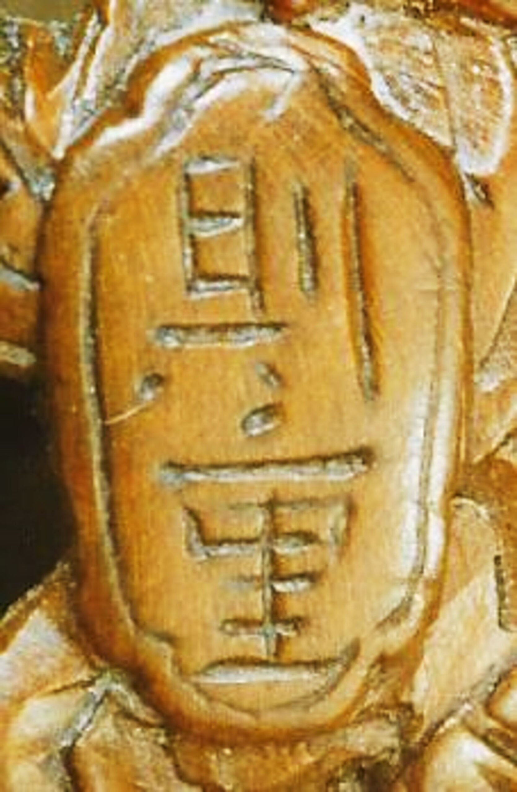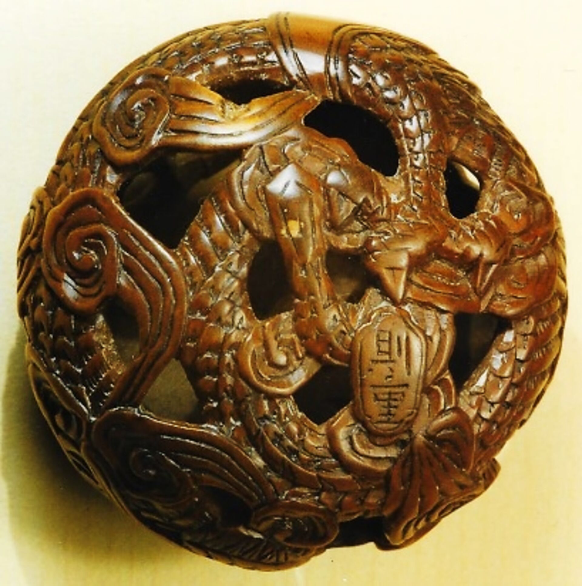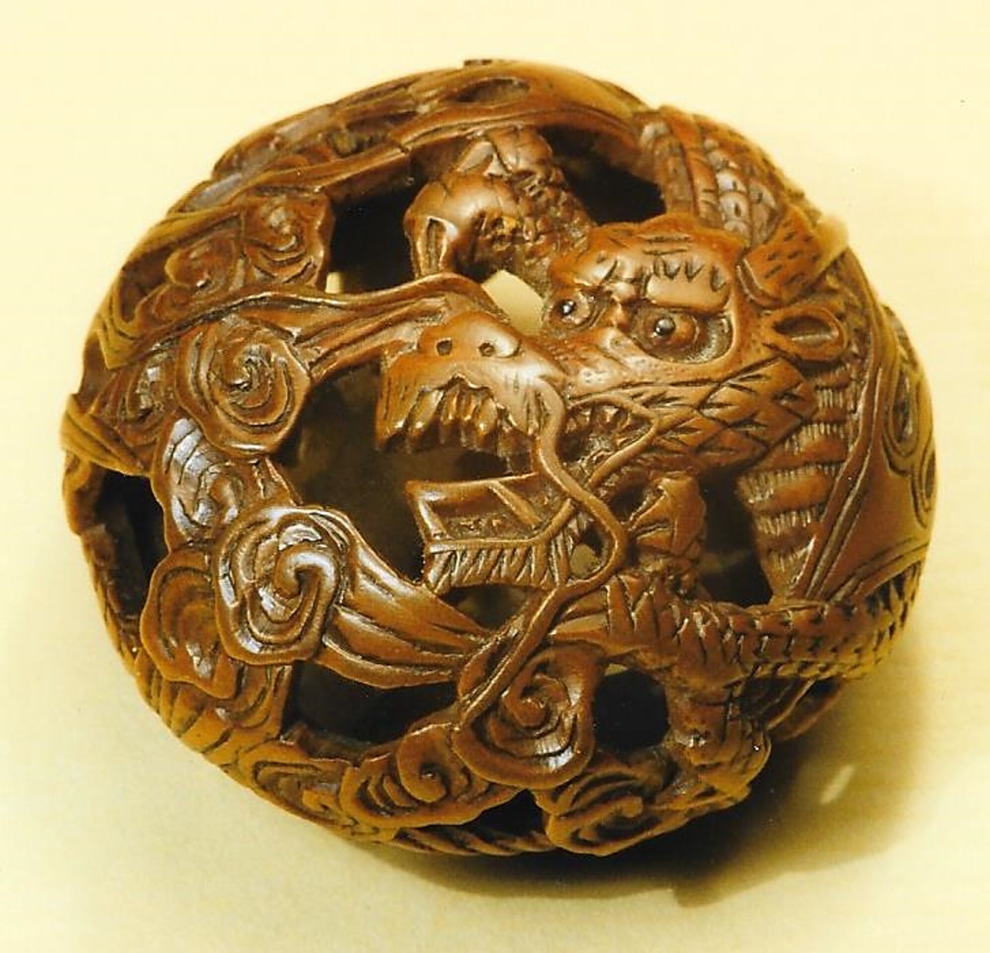 Holz-Ryûsa, Der Drache, um sich selbst geschlungen, mit Flammen, inmitten von Wolken, Augen schwarz eingelegt, im Inneren frei bewegliche Kugel. Unterseitig in einer unregelmässig umrandeten Reserve die Signatur: NORISHIGE (K304, K308). Durchmesser 40mm. Schöne Glanzpatina. Alter: vermutl. Anfang 19 Jh.