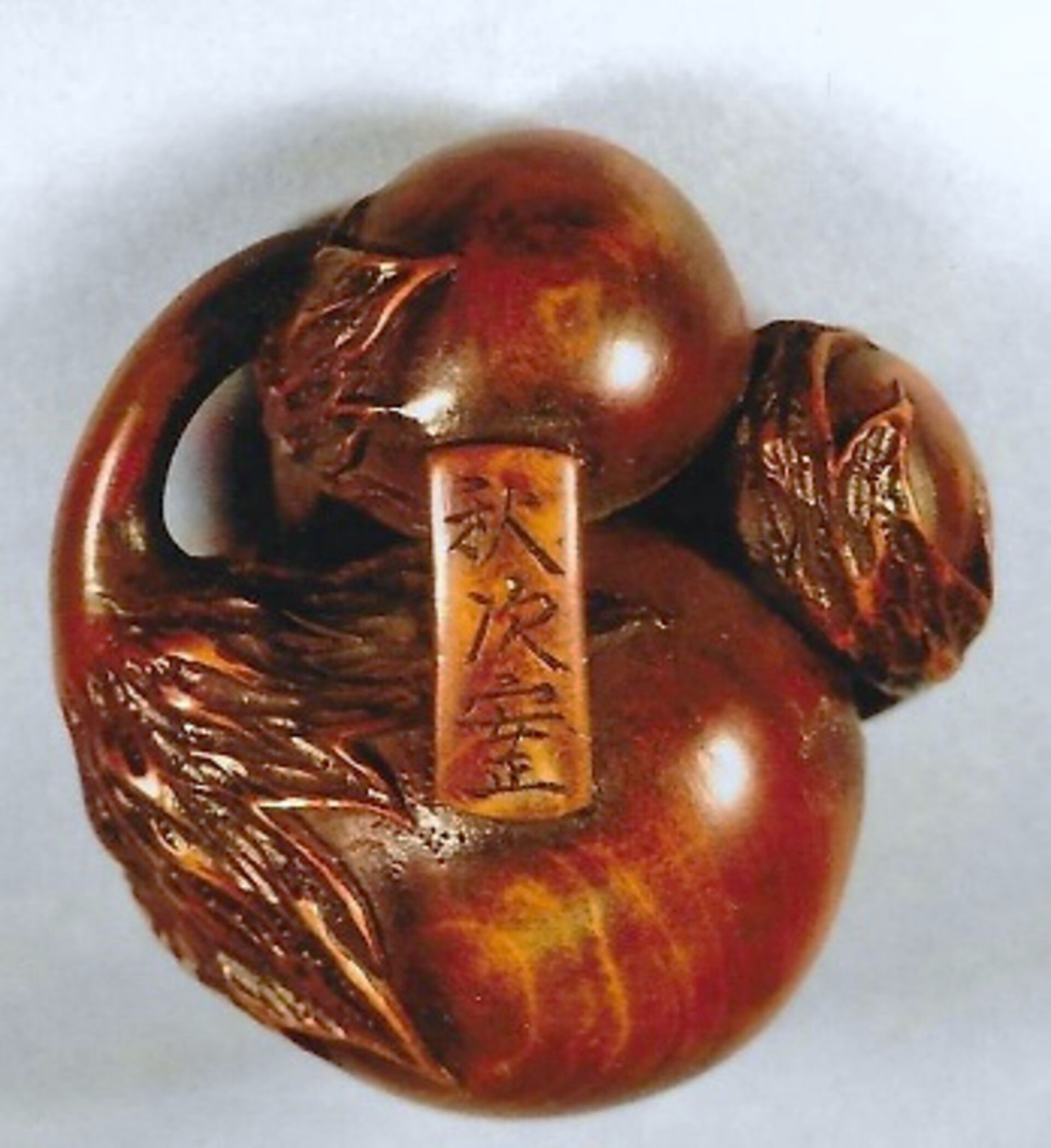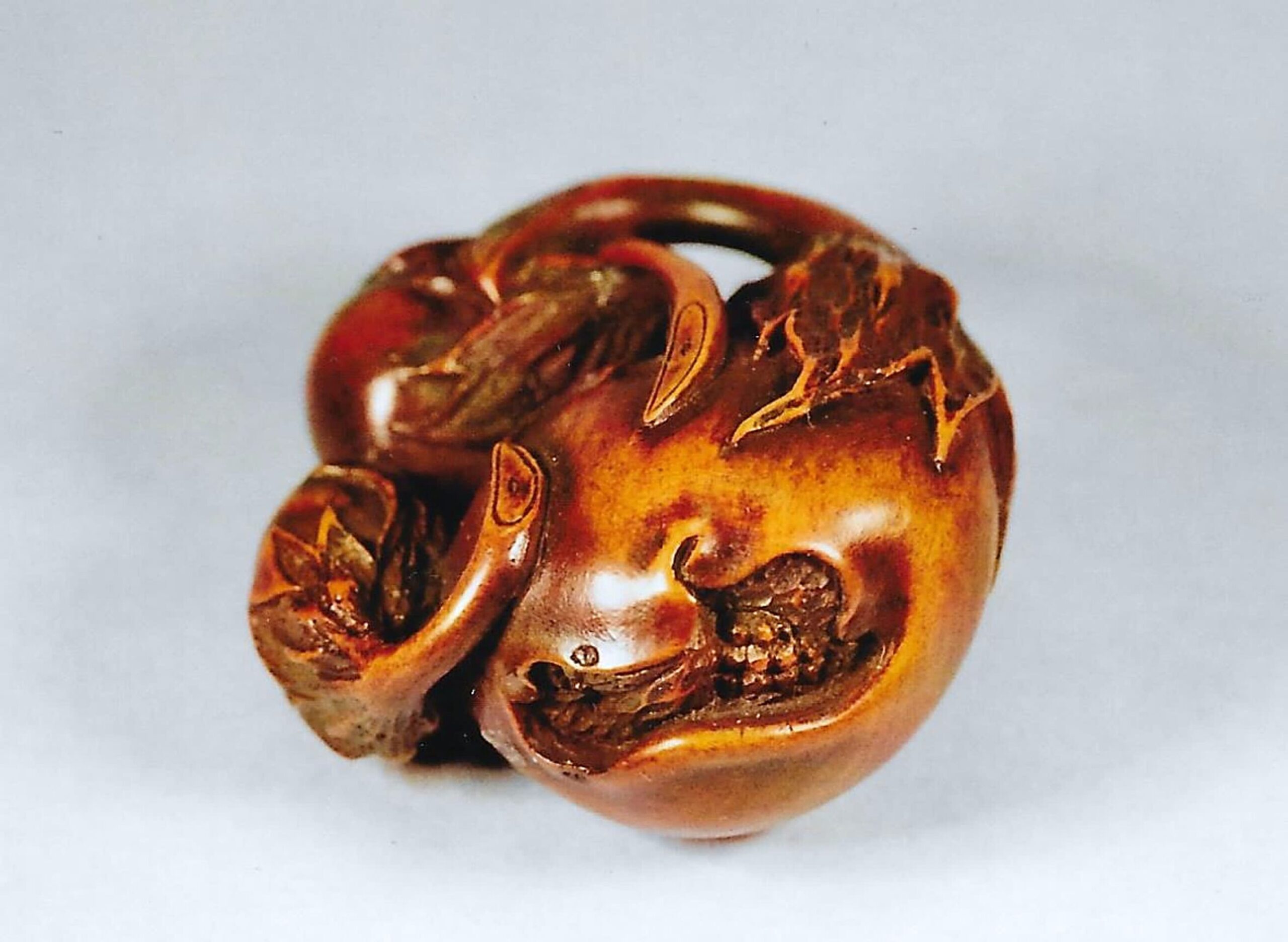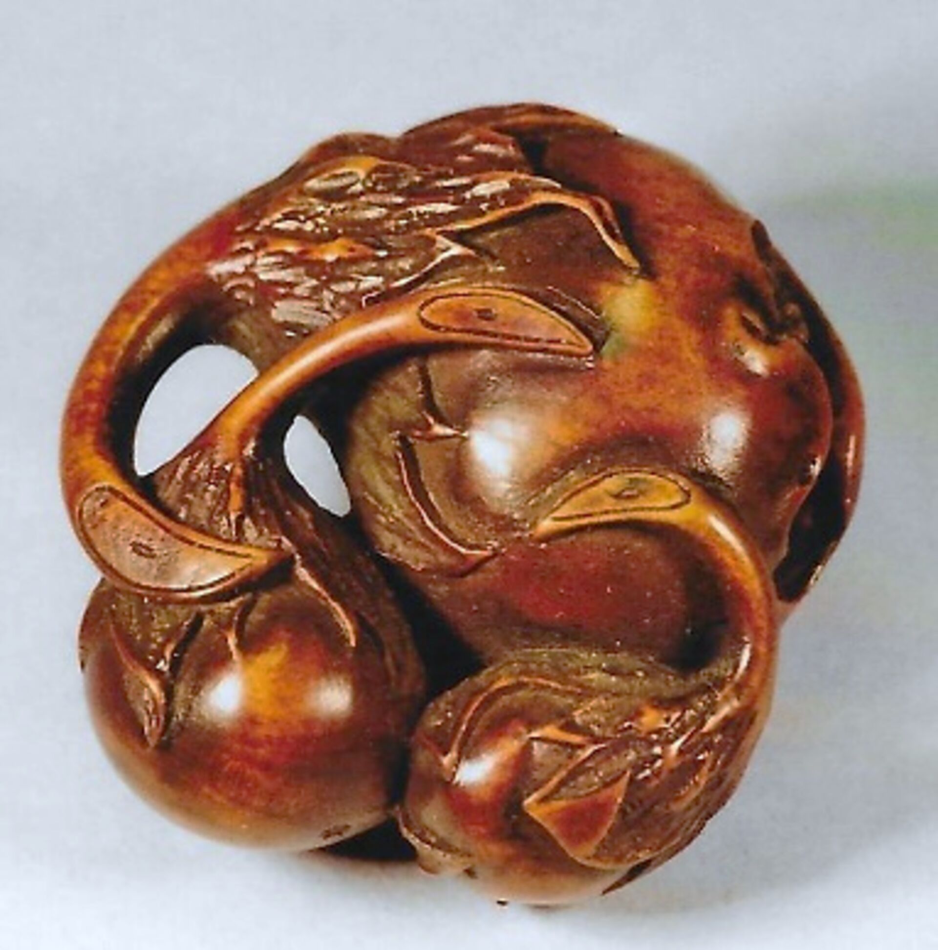 Holz-Katabori. Eine kompakte Gruppe von drei Auberginen, eine grosse, zwei kleine, mit gekrümmten Stielen. Die grosse Frucht ist aufgeplatzt und lässt innen das Fruchtfleisch und zahlreiche Kerne sehen. Unterseitig eine viereckige Plakette mit der Signatur SHÛJI YASUMASA (K301, K211, K225, K191). Grösse 39mm. Sehr guter Erhaltungszustand, schöne Glanzpatina, natürliche Himotoshi. Alter ca. Mitte 19.Jh.