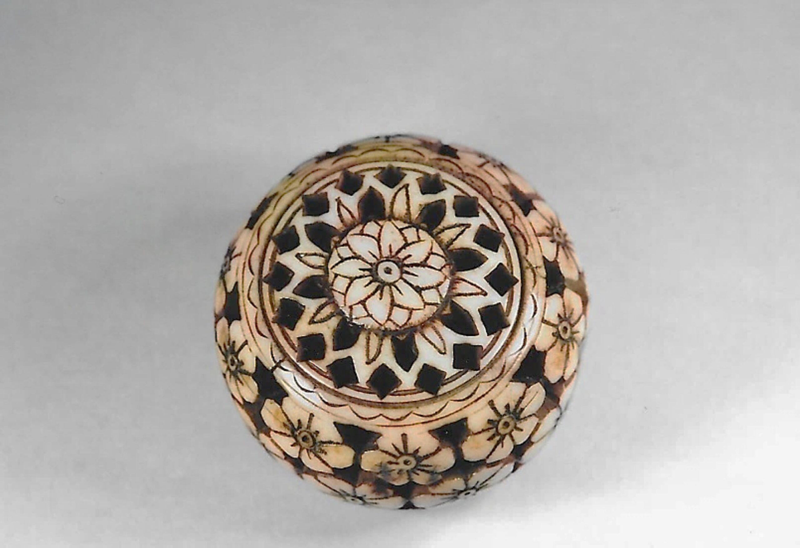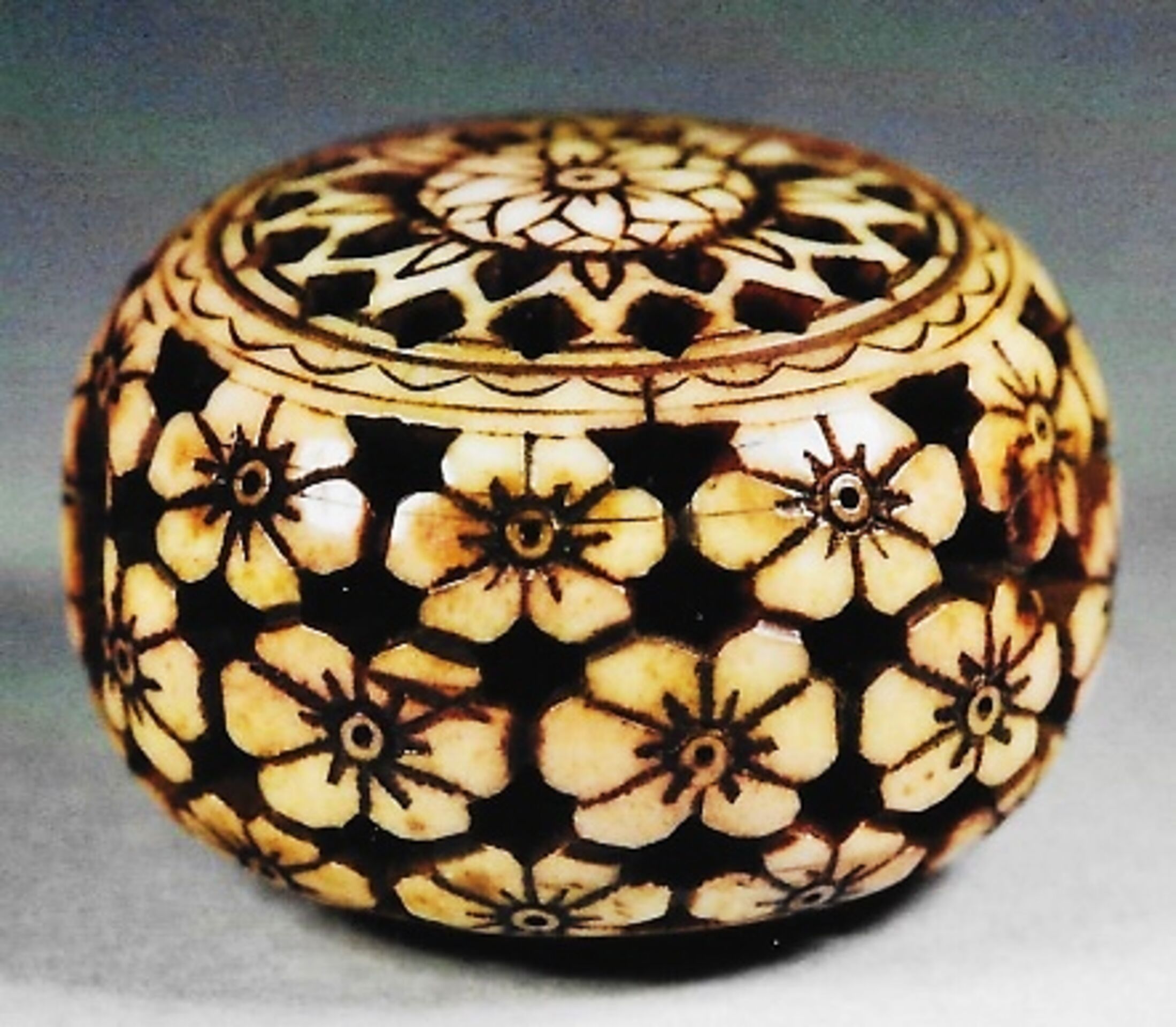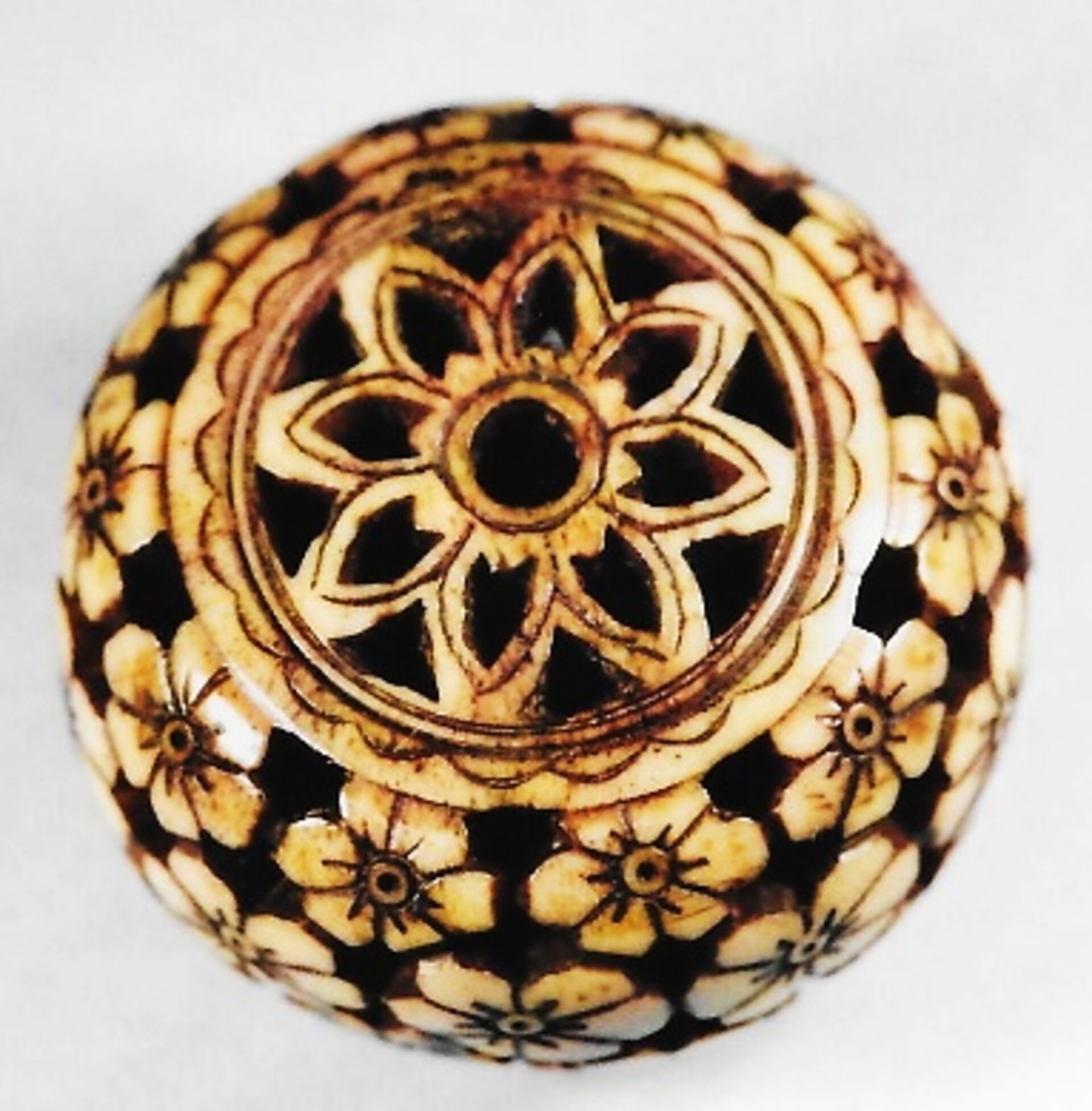 Hirschhorn-Katabori. Allseits durchbrochen gearbeitete, vertikal etwas flachgedrückte Kugel. Oben zentral eine Chrysanthemenblüte, umgeben von durchbrochenem sternförmigem Muster. Seitlich rundum sechsblätterige Blüten. Unterseitig eine zentrale achtblätterig durchbrochen gearbeitete stilisierte Blüte. Durchmesser 34mm. An der Peripherie zwei dunkelbraune eingedellte Stellen, die wahrscheinlich von der Schnur bzw. den Knoten herrühren. Alter, ca. 2. Hälfte 19.Jh.