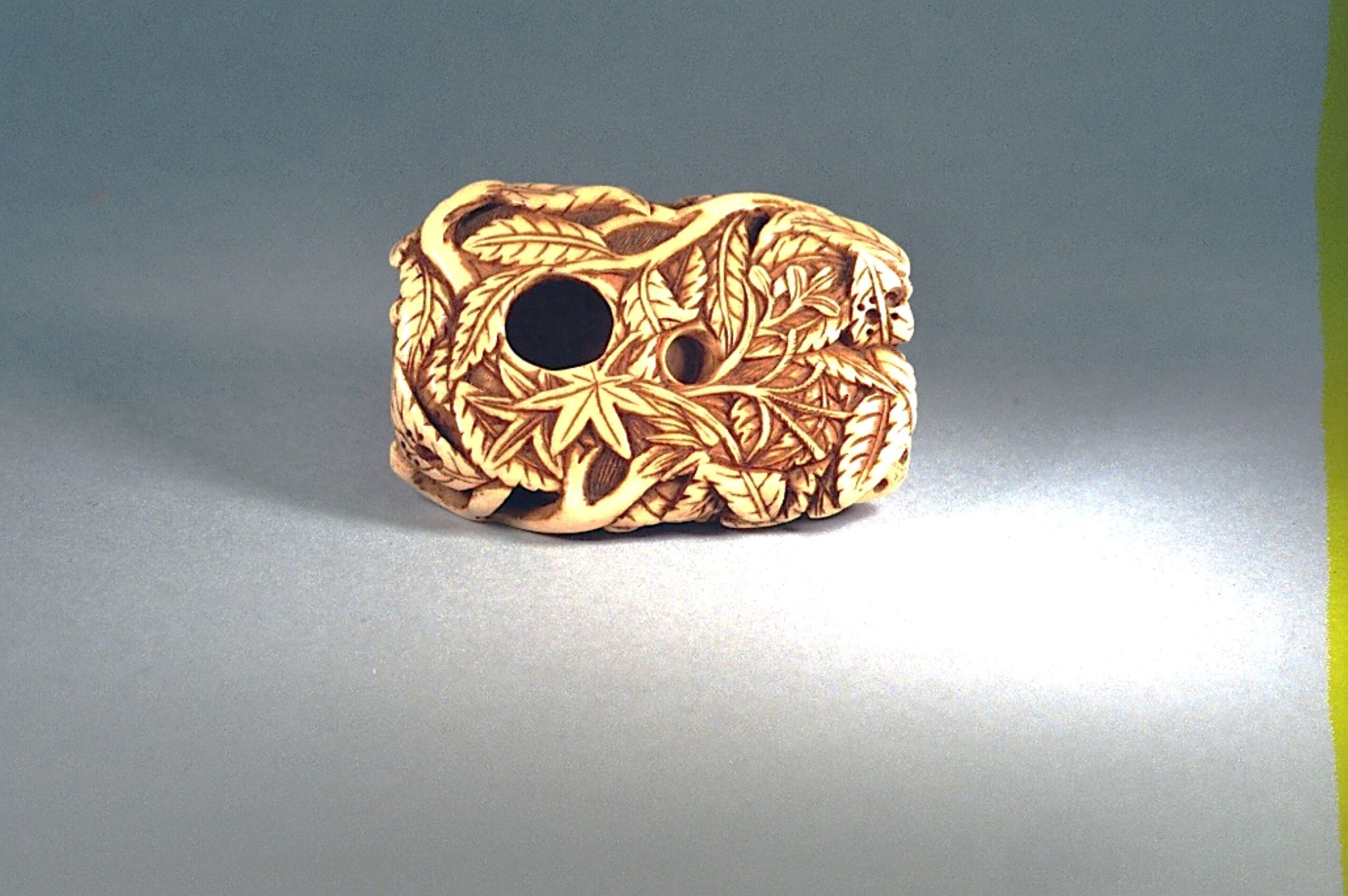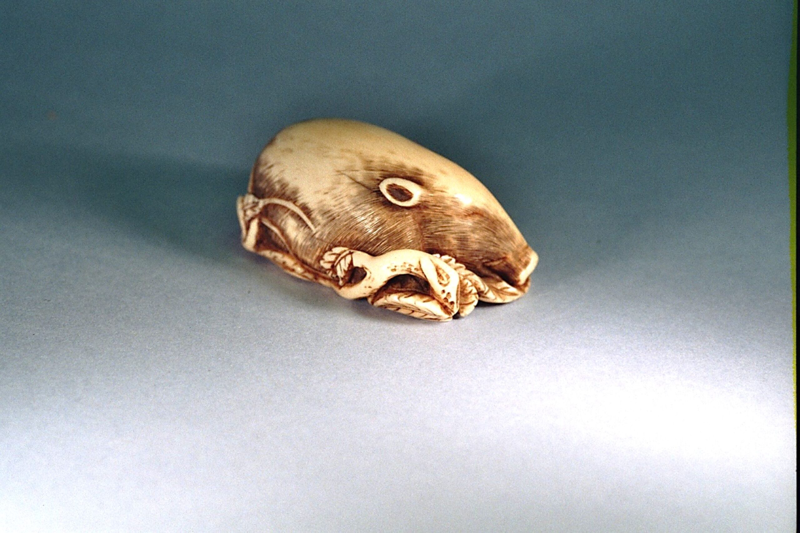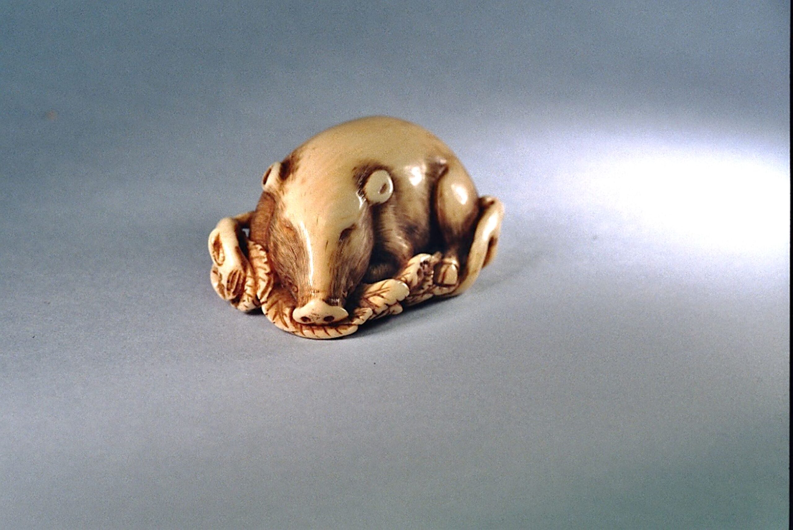 Elfenbein-Katabori. Schlafender Eber, leicht nach links gewendet liegend auf einem Bett aus Ästen und verschiedenen Blättern. Der Rücken des Tieres ist vom Tragen glattpoliert, das Fell ist dort nicht mehr zu sehen. Während die Oberseite sehr gemütlich und friedlich wirkt, ist die reichhaltige Unterseite mit Ästen, Blättern und den ungleich grossen Himotoshi geradezu aufregend. Länge 51mm, Alter 18.Jh., aus der Schule von Kyôto, im Stil von Tomotada. Nicht signiert. –