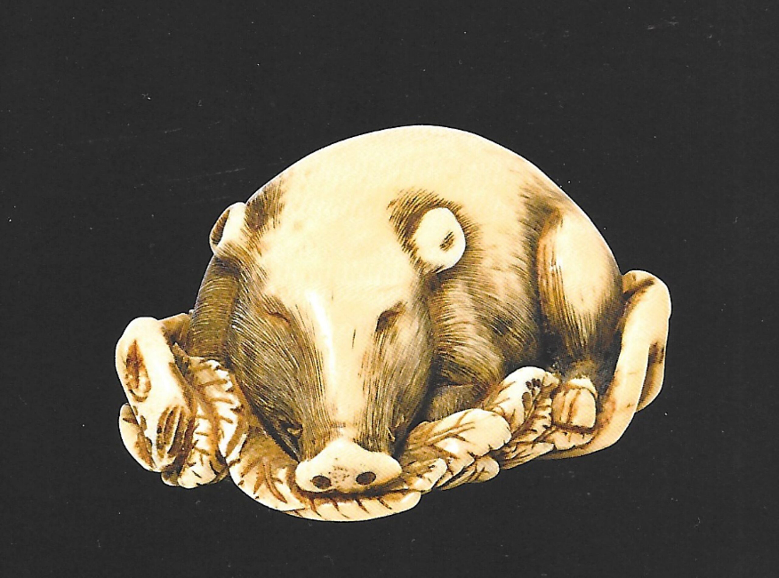 „Among the most attractive reclining renderings are those by Toyomasa, Hidemitsu, Tametaka and Minko, as well as boars sleeping on leaves as interpreted by the Kyoto School artists, some of which are among the finest netsuke in existence.”