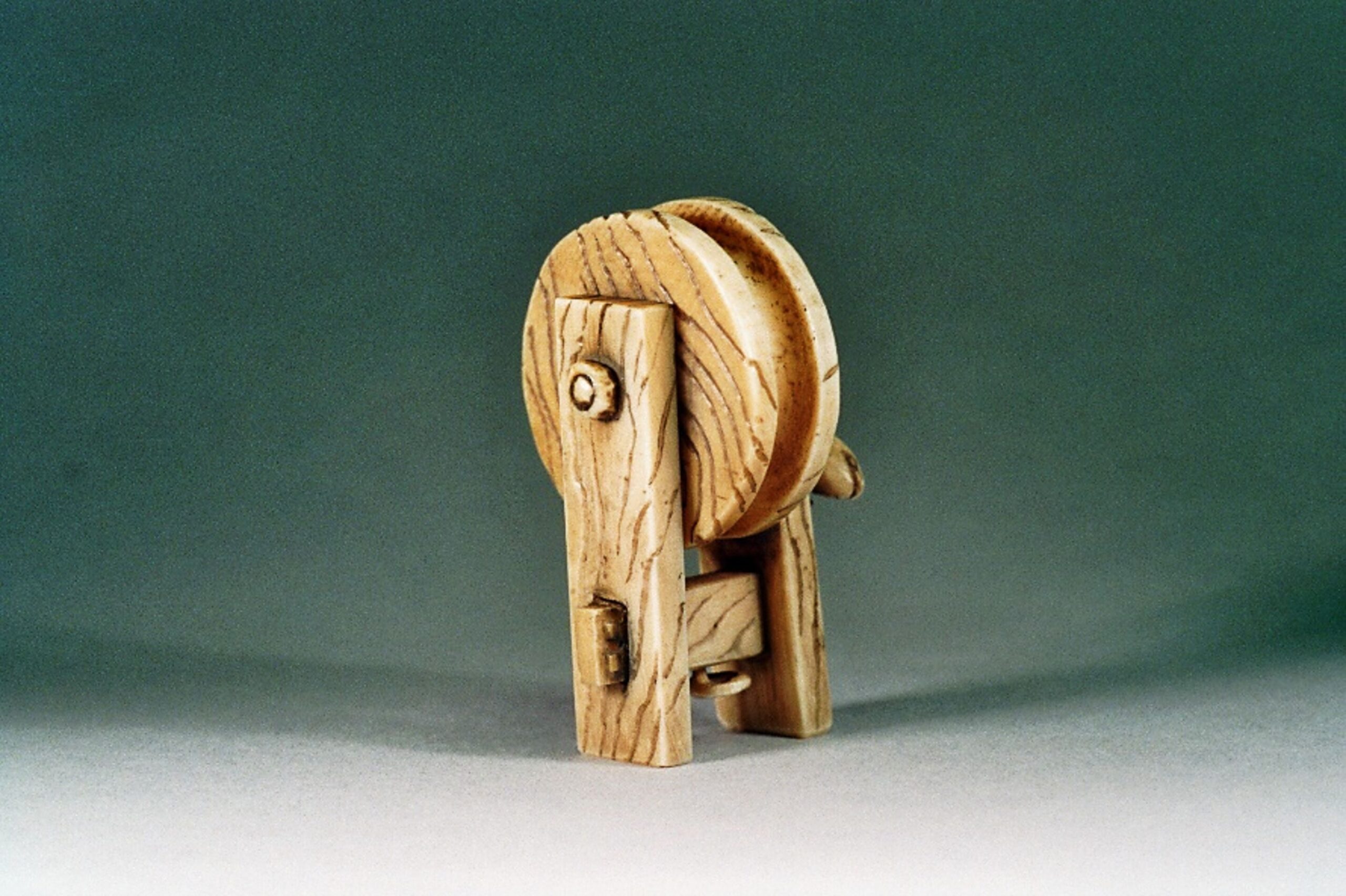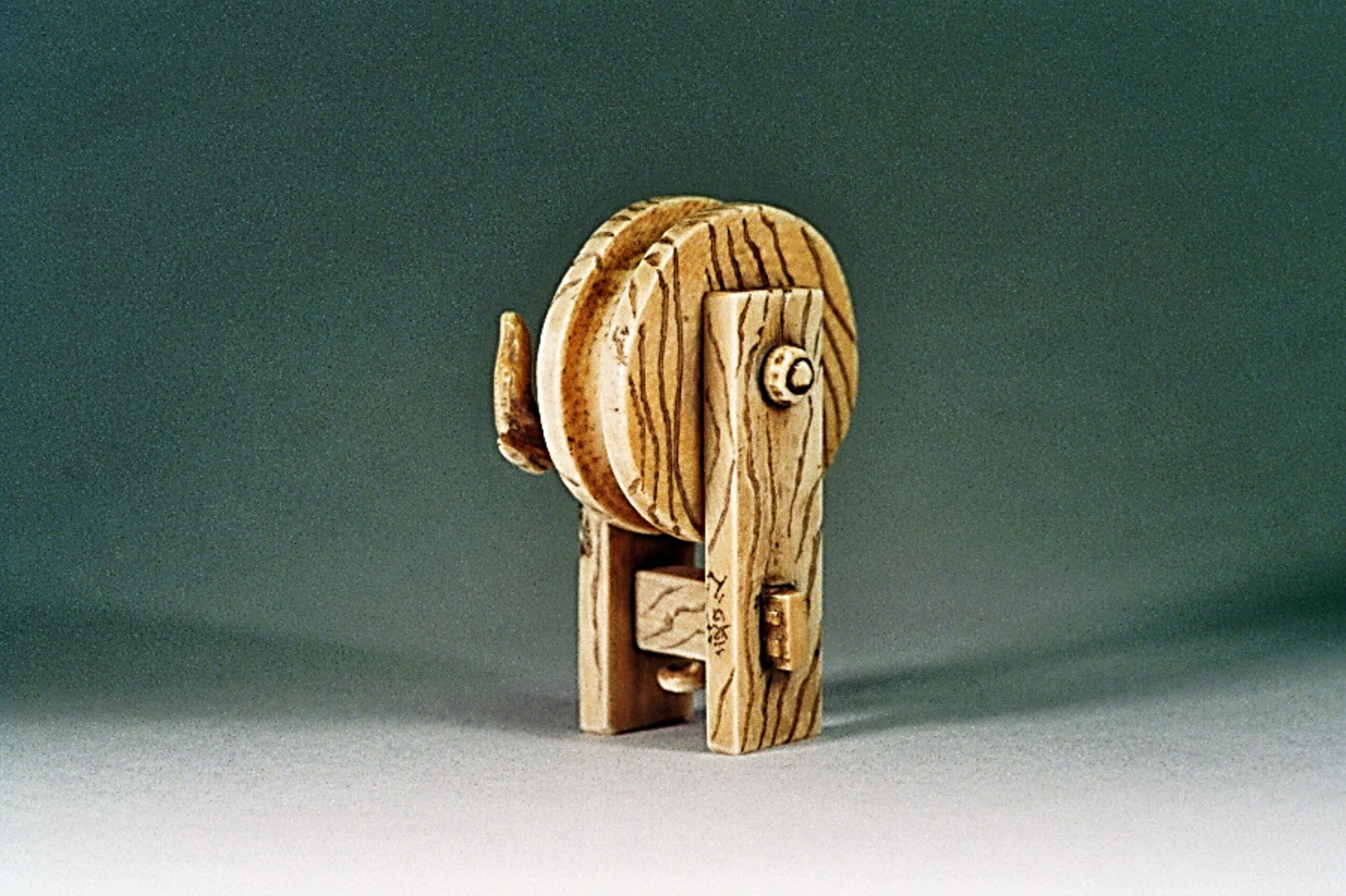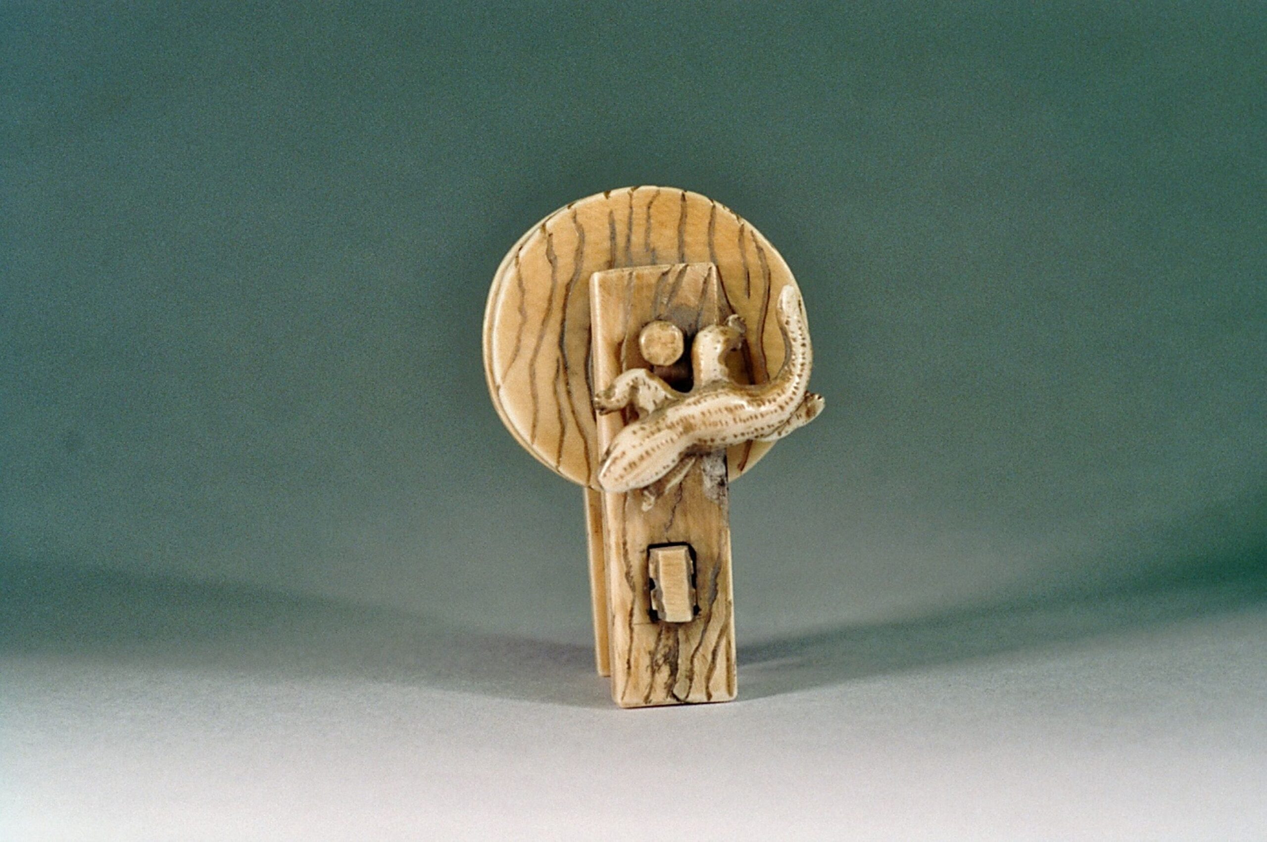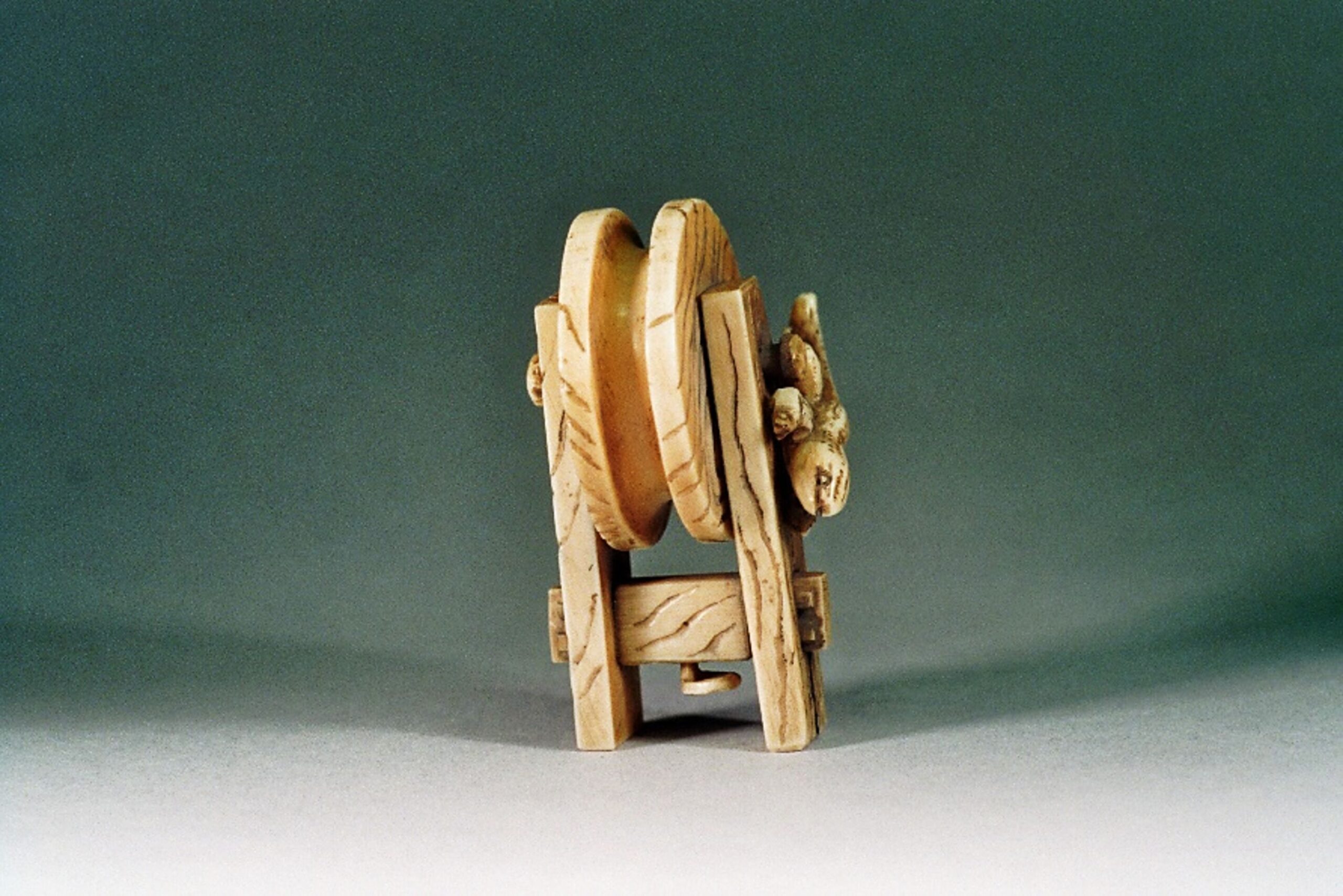 BRUNNENRAD. Dieses Motiv als Netsuke tauchte erstmals am 5.5.1999, Lot 293 bei einer Auktion von Sotheby’s auf und galt zunächst als Unikat (Int Netsuke Soc J 20/3, Fall 2000, p. 25 no.6). Doch schon am 27.11.1999, Lot 310 war ein sehr ähnliches Stück, ebenfalls in Hirschhorn an der Auktion von Trudel Klefisch in Köln. Beide Stücke vermutlich von derselben Hand. Seither sind noch einige wenige weitere Stücke bekannt geworden. Dieses Motiv ist sehr selten, besonders mit Echse.
