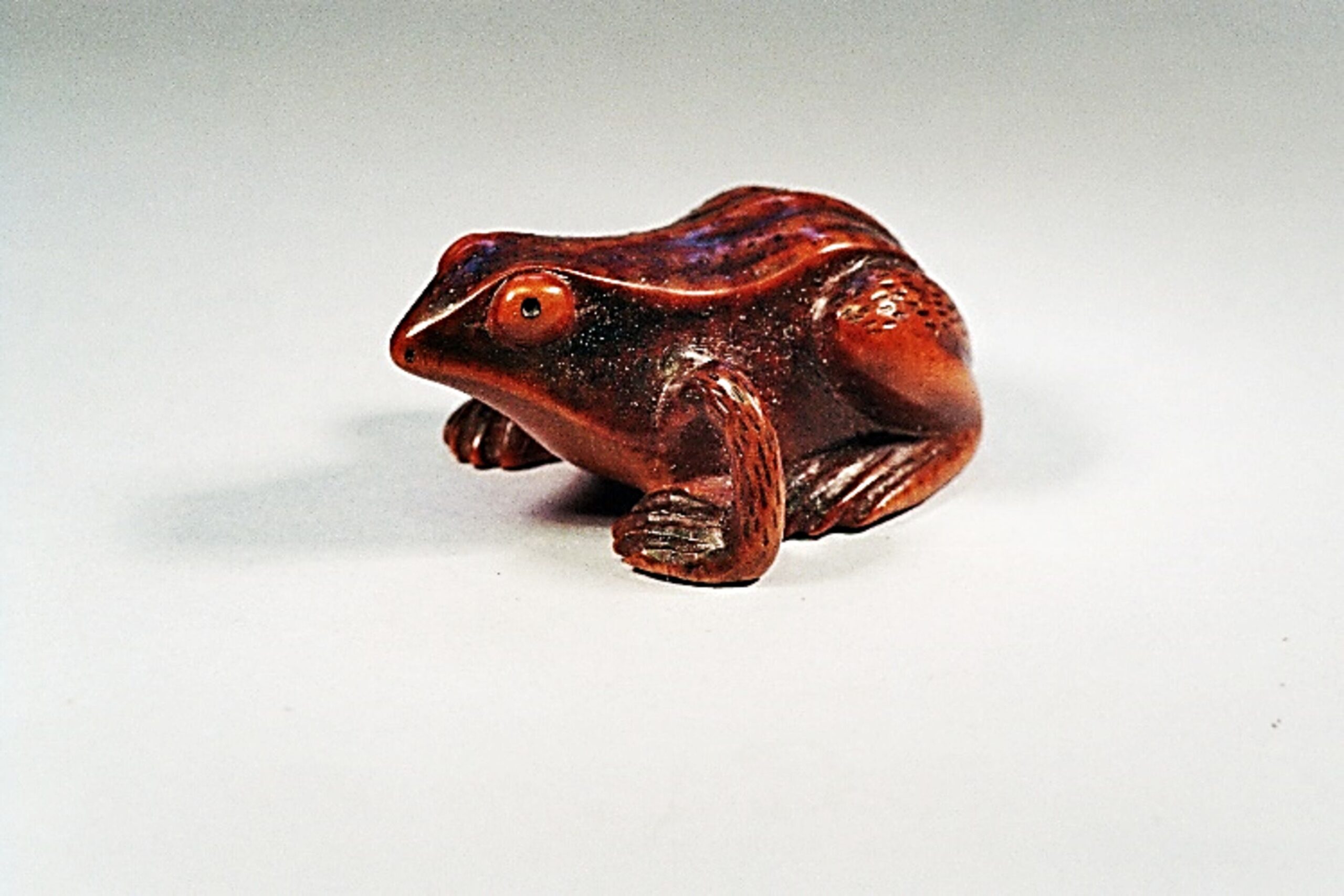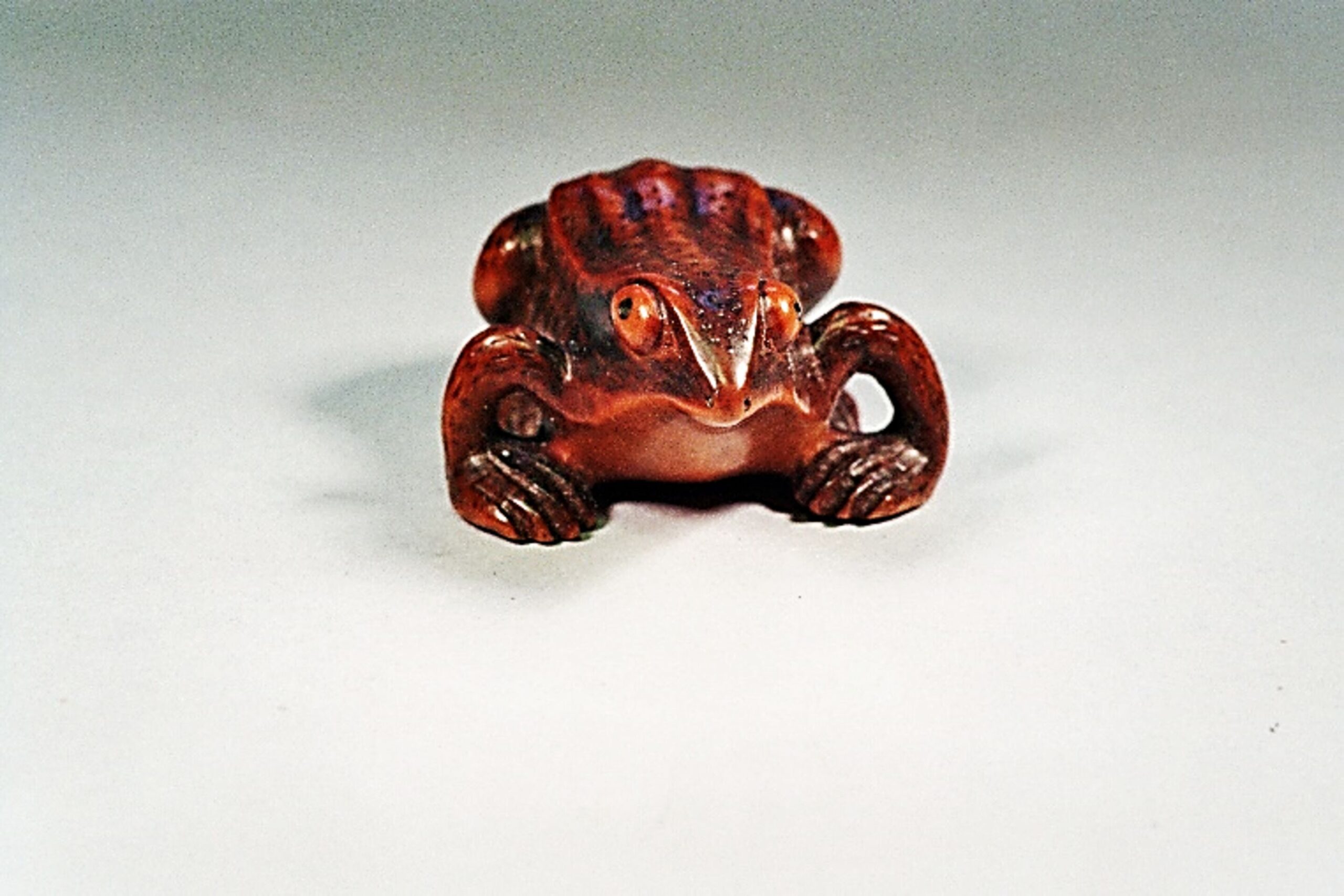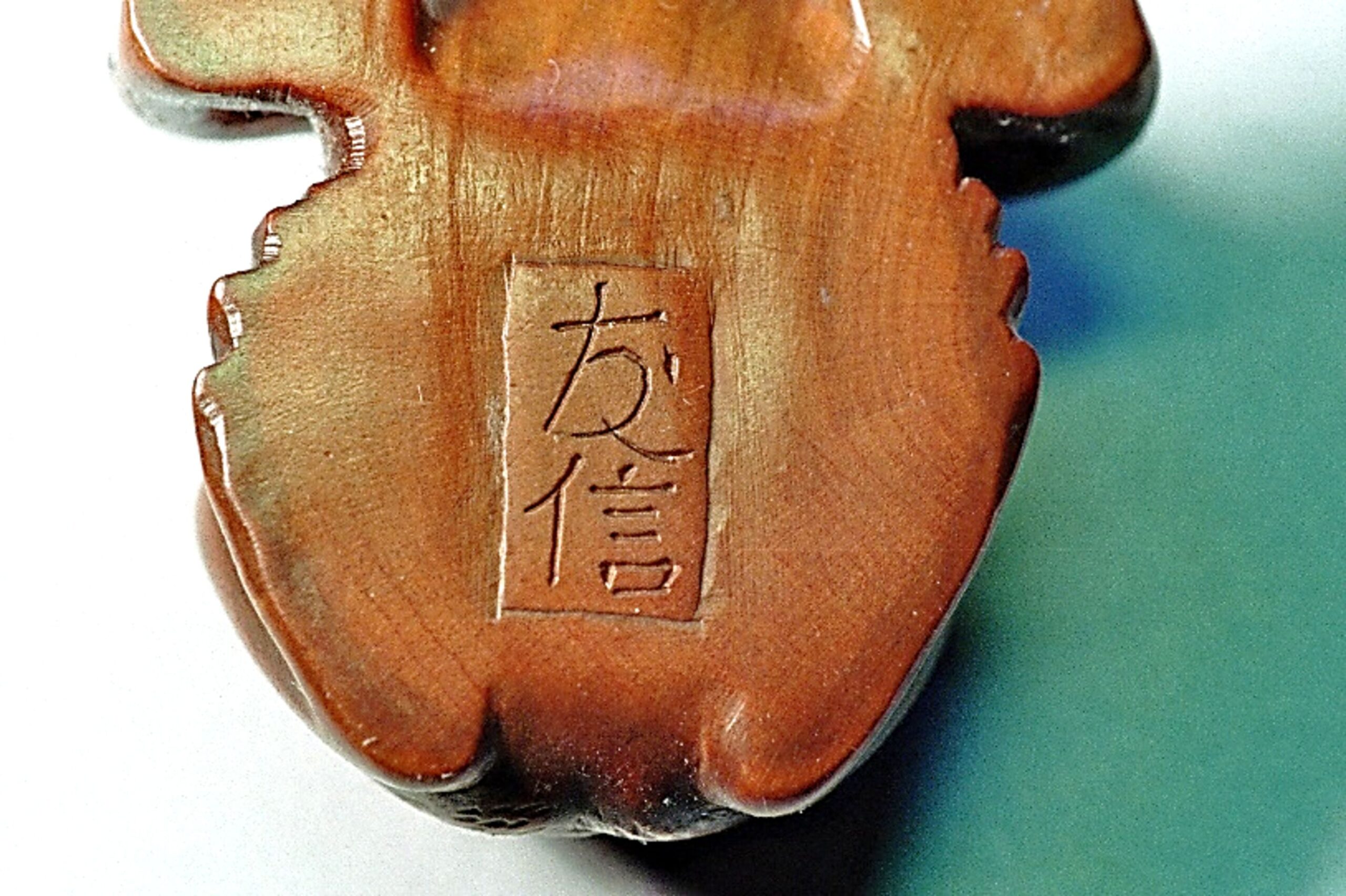Holz-Katabori. Fruchtholz? Das kleine Fröschchen sitzt aufmerksam und irgendwie erwartungsbereit da, grosse wache Glotzaugen, die Vorderbeine breit gespreizt, die Pusteln auf dem Körper in Ukibori-Technik. Natürliche Himotoshi. Länge 41mm. Auf der glatten Unterseite in viereckiger Umrandung die Signatur TOMONOBU (K179, K291). Alter: 1. Hälfte 19.Jh.