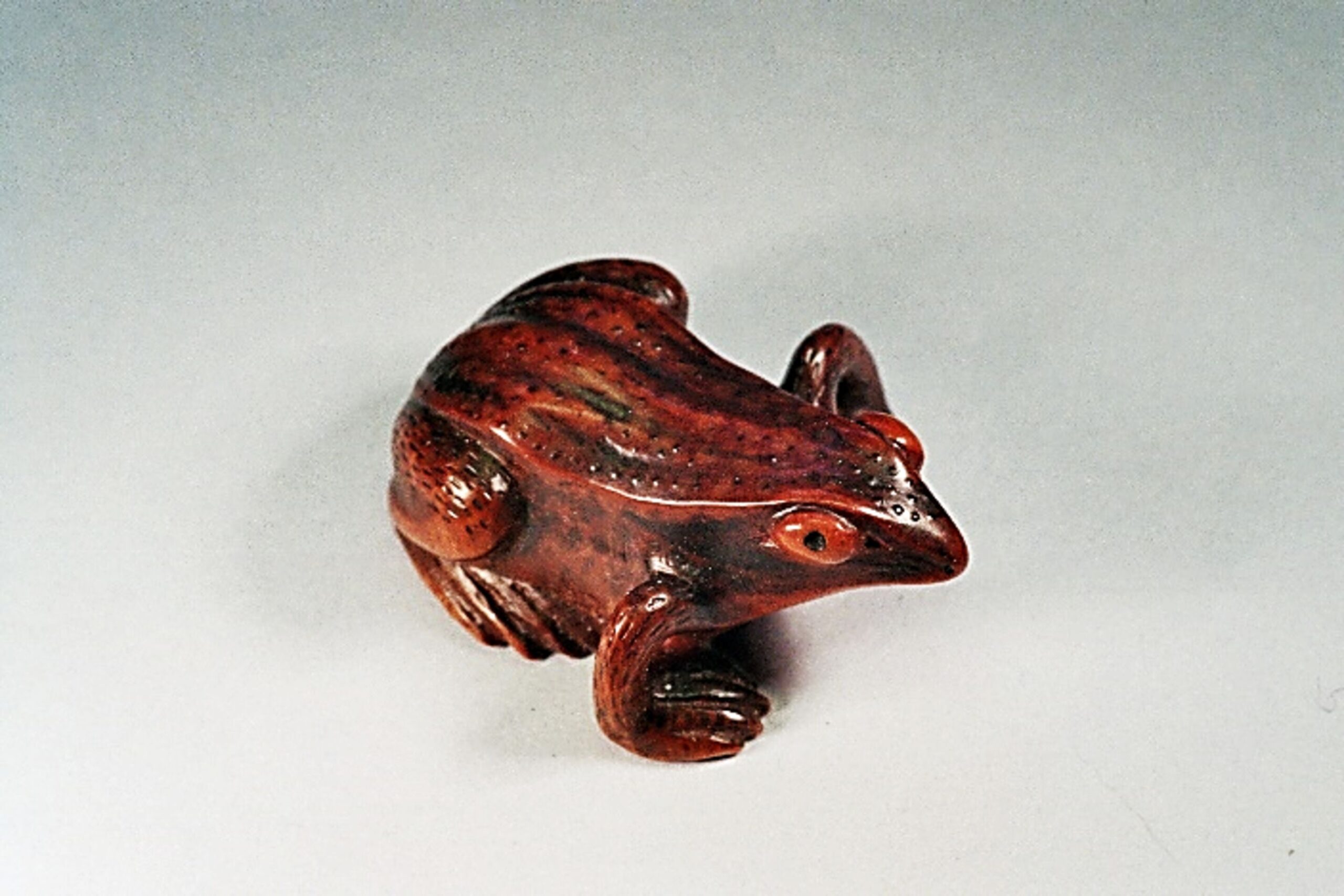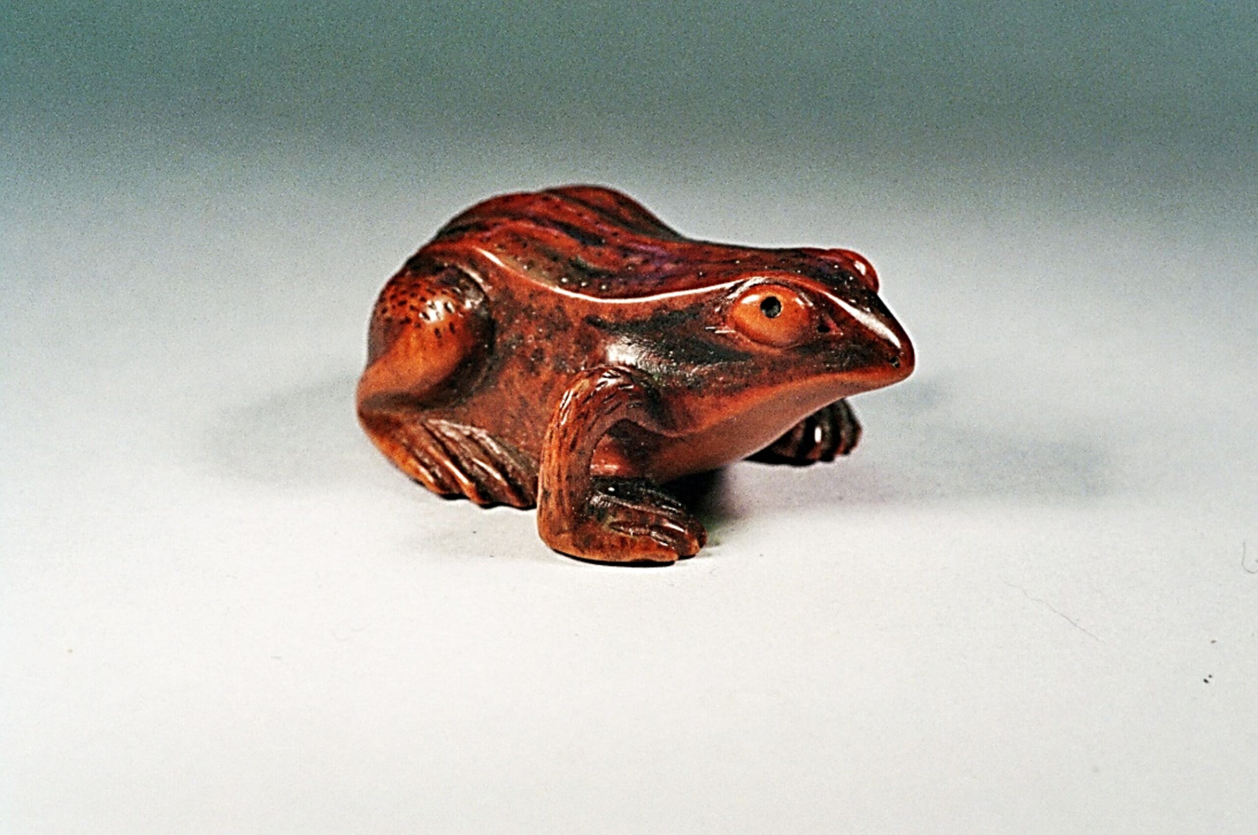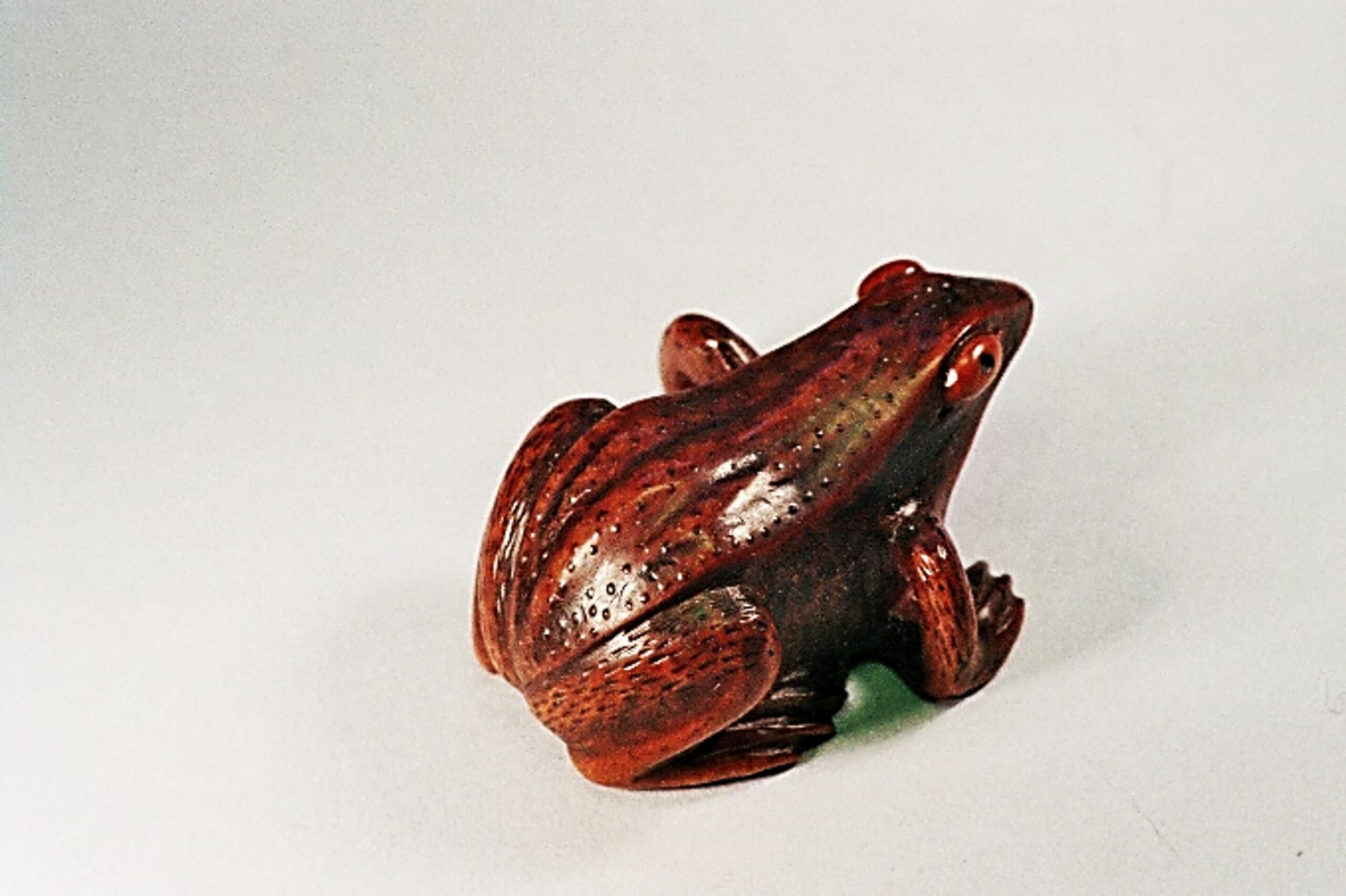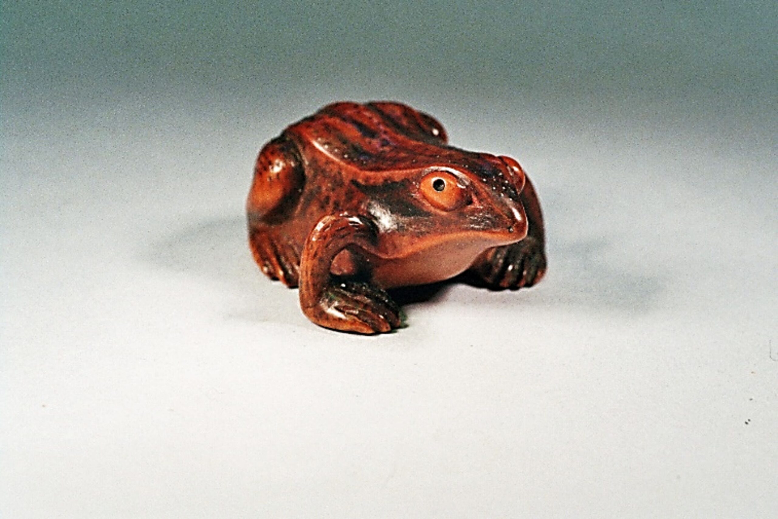 Holz-Katabori. Fruchtholz? Das kleine Fröschchen sitzt aufmerksam und irgendwie erwartungsbereit da, grosse wache Glotzaugen, die Vorderbeine breit gespreizt, die Pusteln auf dem Körper in Ukibori-Technik. Natürliche Himotoshi. Länge 41mm. Auf der glatten Unterseite in viereckiger Umrandung die Signatur TOMONOBU (K179, K291). Alter: 1. Hälfte 19.Jh.