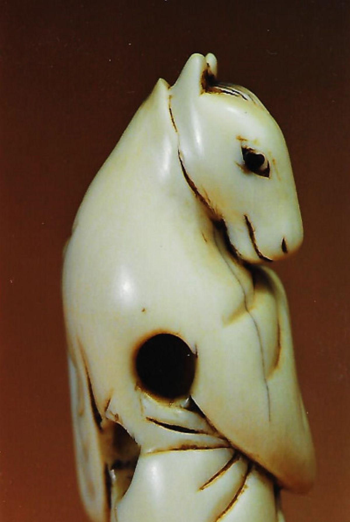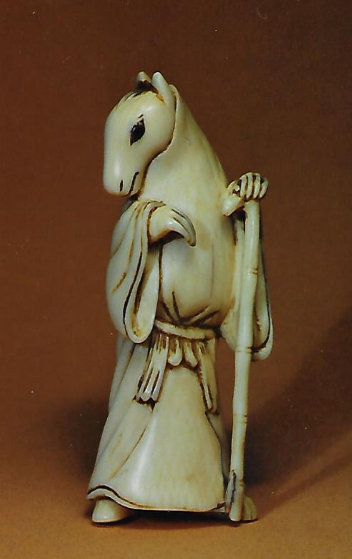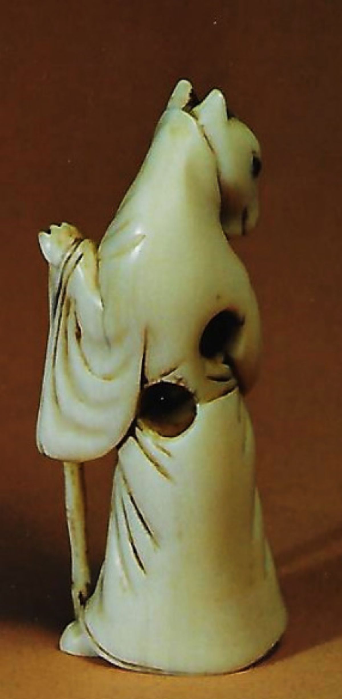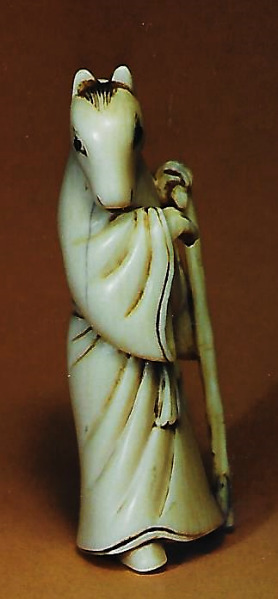 Maritimes Elfenbein-Katabori, aufrechtstehender Fuchs – der einem Pferd gleicht – mit langem Wanderstab, gekleidet in ein weitärmeliges, bodenlanges Gewand, das seine wahre Gestalt bis hinauf zu den Ohren verbirgt und unter einem Bäuchlein mit einer Masche gegürtet ist. Scheinheilig, verlogen, verschmitzter Ausdruck, demütige Haltung, verführerisch, mit den Beinen ausschreitend, schon wieder unterwegs zu neuen Schelmereien. Helles Elfenbein, schöner Faltenwurf, einige feine Altersrisse, gut abgegriffen, grosse Himotoshi mit Benützungsspuren im Rücken. Augen schwarz eingelegt. Höhe 6 cm, nicht signiert. 19. Jh. – Die Ähnlichkeit mit einem Pferd mag daher kommen, dass der erste Tag des zweiten Monats, der „erste Tag des Pferdes“, zugleich der Tag des Reisgotts, der Fuchsgottheit Inari ist.