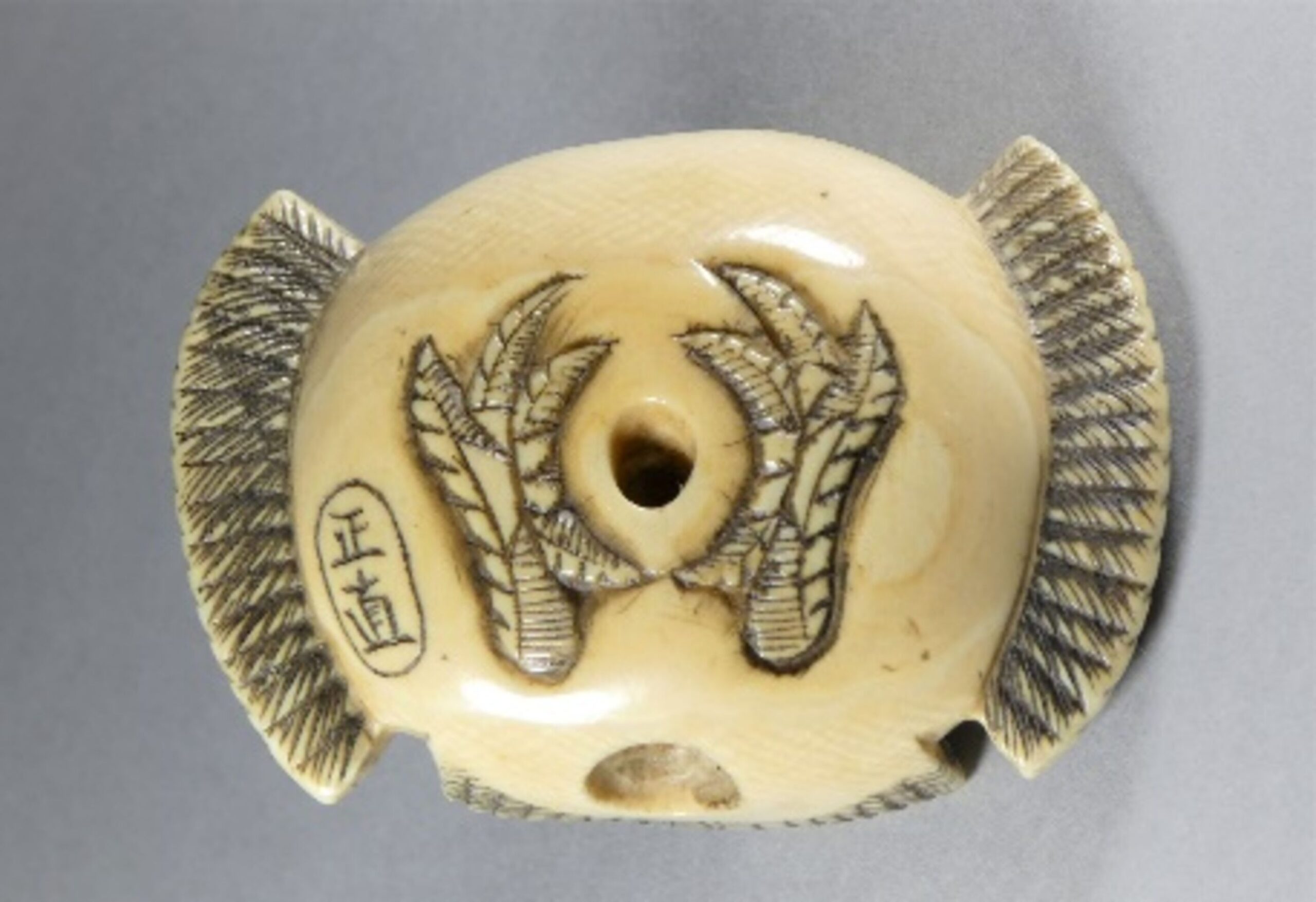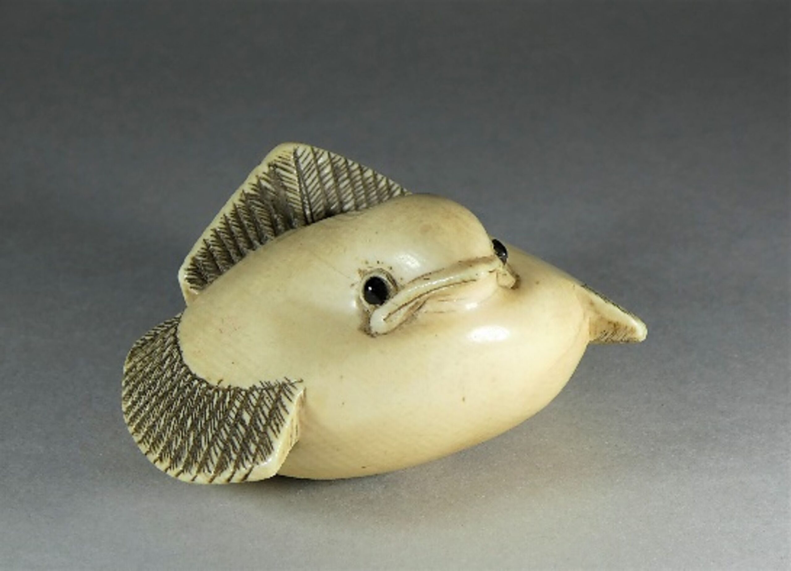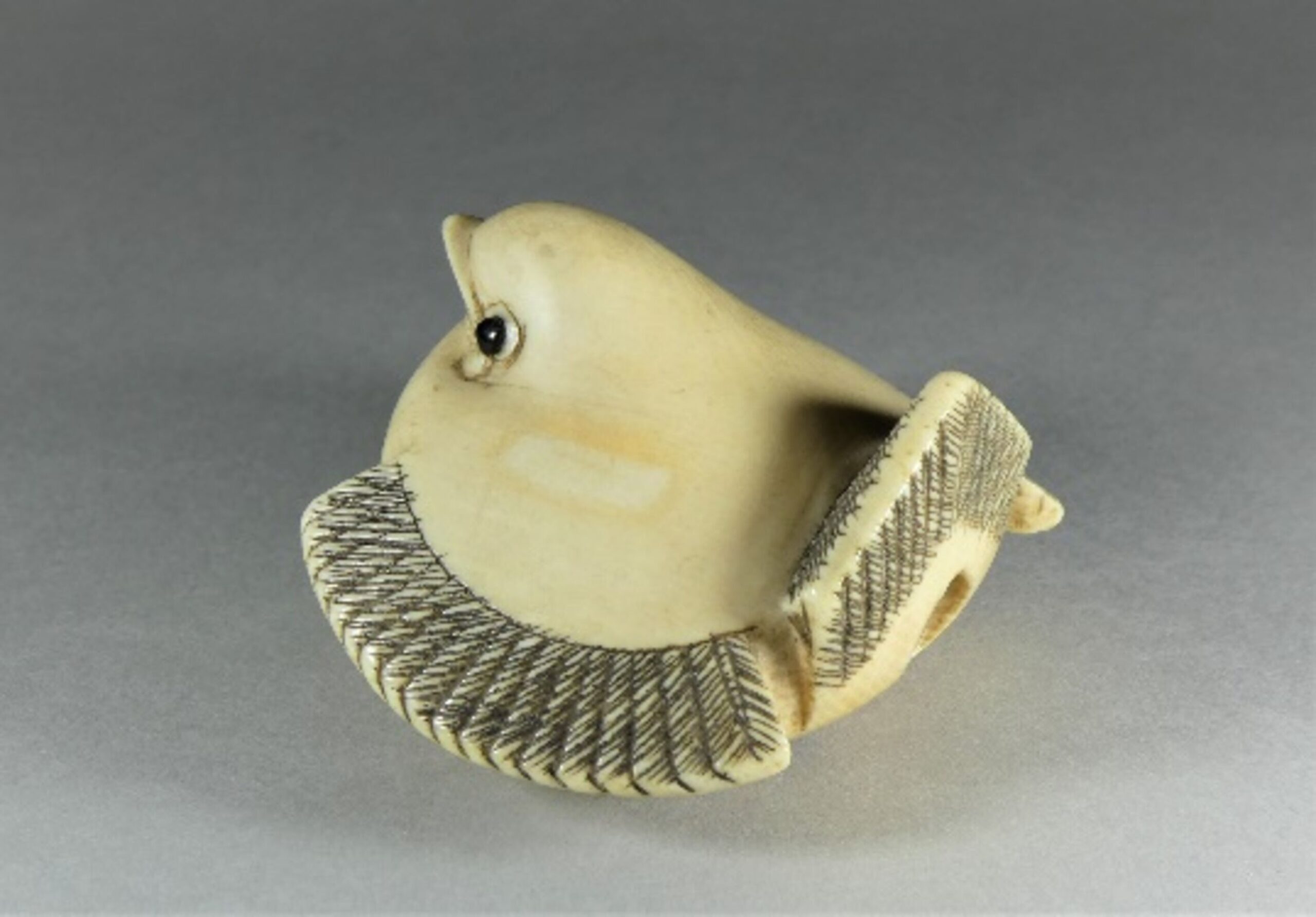 Elfenbein Katabori. Der Glücksspatz in der typischen Version von Masanao von Kyôto. Wach, souverän und etwas abschätzig blickt er in die Welt. Die Flügel breit ausgebreitet, das Schwänzchen wie bei der Liebeswerbung keck in die Höhe gestreckt, liegt er behäbig da, als ob ihm niemand und nichts etwas anhaben könnte. Unterseitig die gravierten Füsse und Krallen und in einer ovalen Umrandung die Signatur MASANAO, , (K191, K282). Auf Unter- und Hinterseite zwei ungleich grosse, gut gebohrte Himotoshi. Breite 57mm. Alter: 19.Jh. In dieser kompakt abgerundeten Form ein ideales Netsuke.