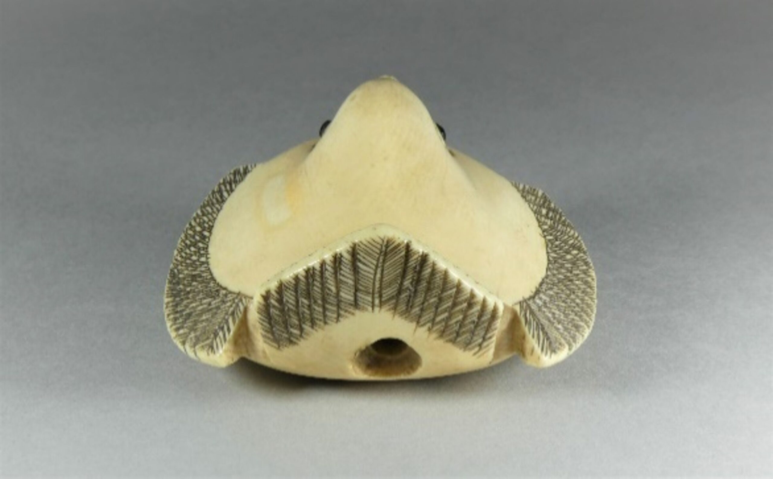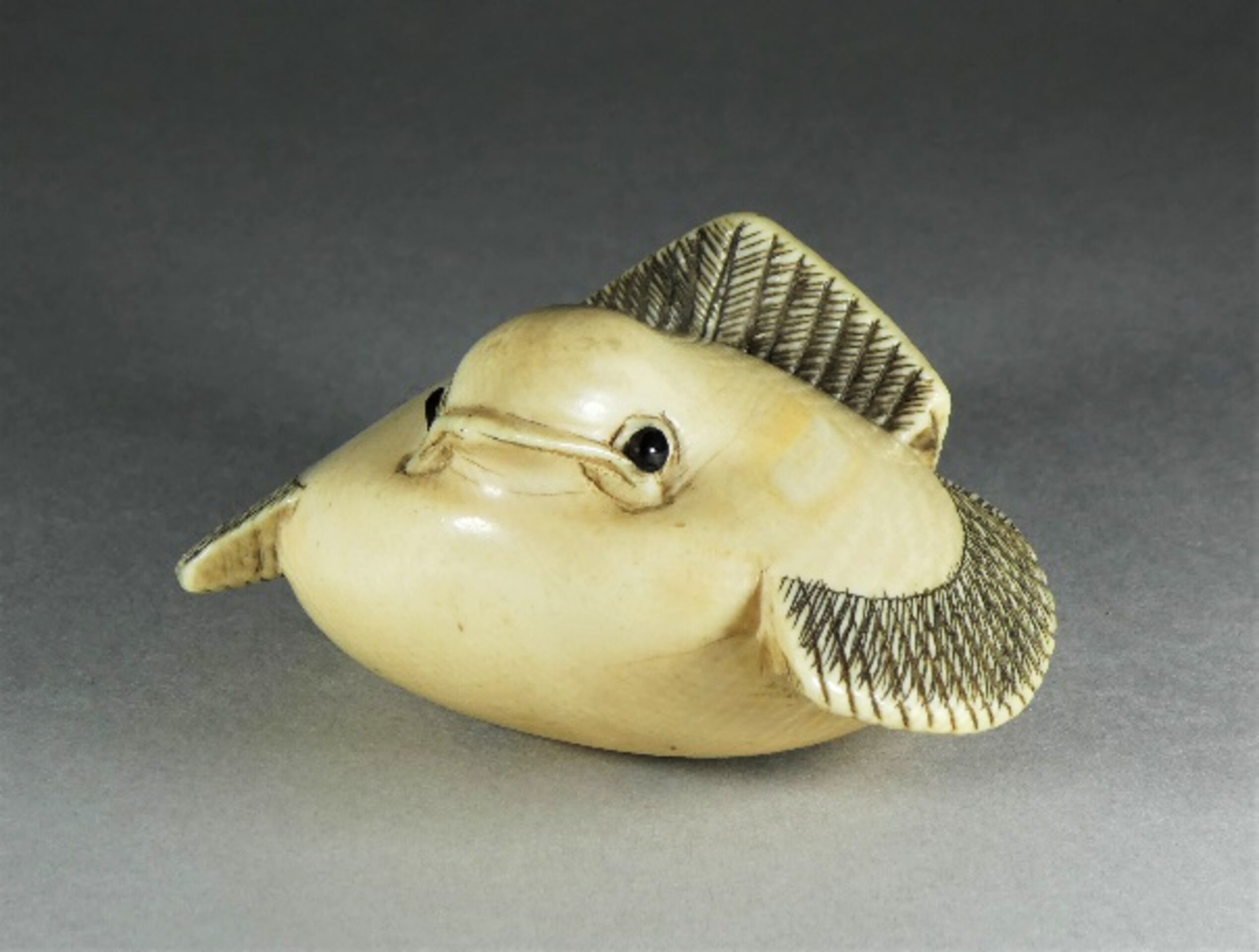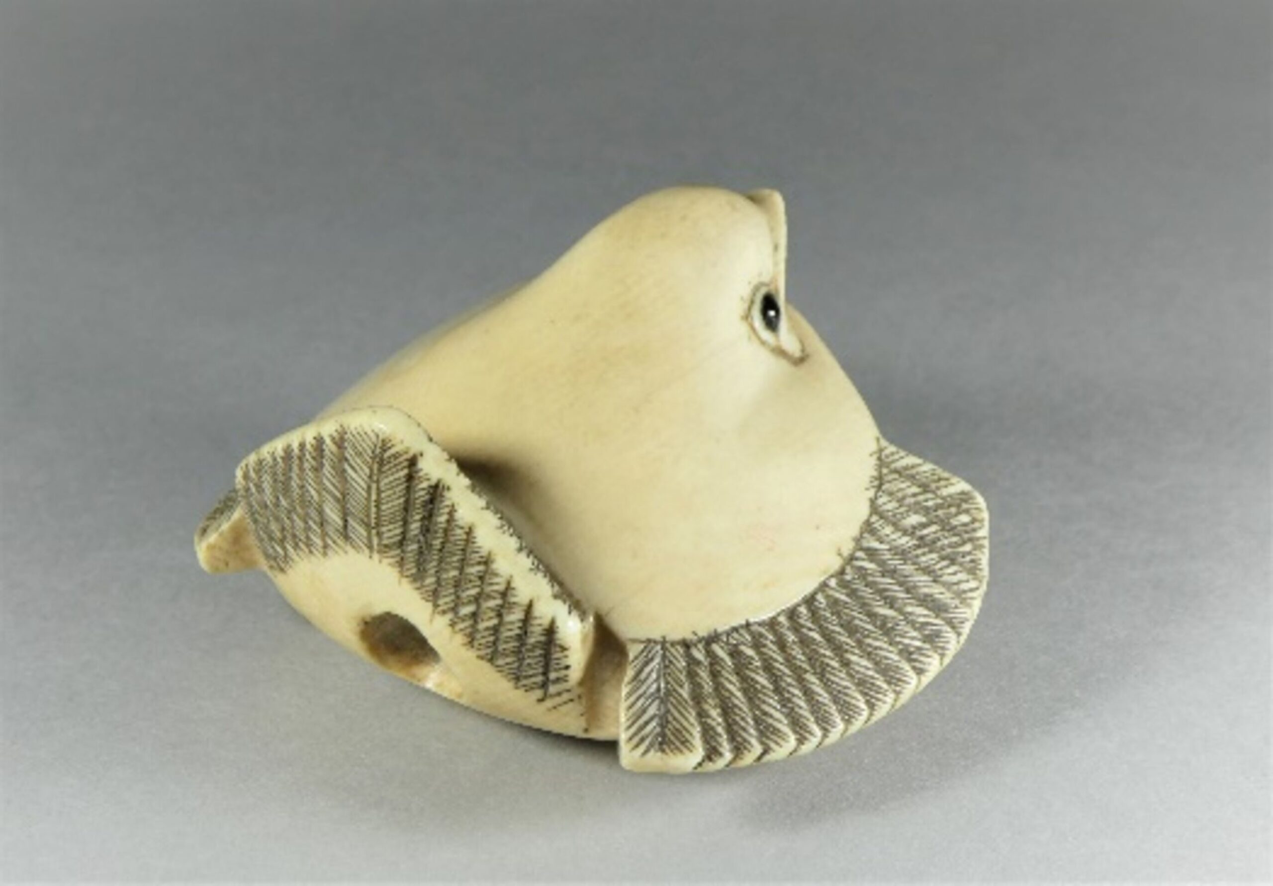 Elfenbein Katabori. Der Glücksspatz in der typischen Version von Masanao von Kyôto. Wach, souverän und etwas abschätzig blickt er in die Welt. Die Flügel breit ausgebreitet, das Schwänzchen wie bei der Liebeswerbung keck in die Höhe gestreckt, liegt er behäbig da, als ob ihm niemand und nichts etwas anhaben könnte. Unterseitig die gravierten Füsse und Krallen und in einer ovalen Umrandung die Signatur MASANAO, , (K191, K282). Auf Unter- und Hinterseite zwei ungleich grosse, gut gebohrte Himotoshi. Breite 57mm. Alter: 19.Jh. In dieser kompakt abgerundeten Form ein ideales Netsuke.
