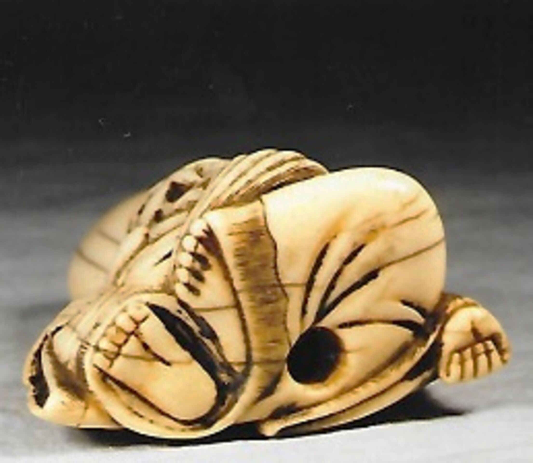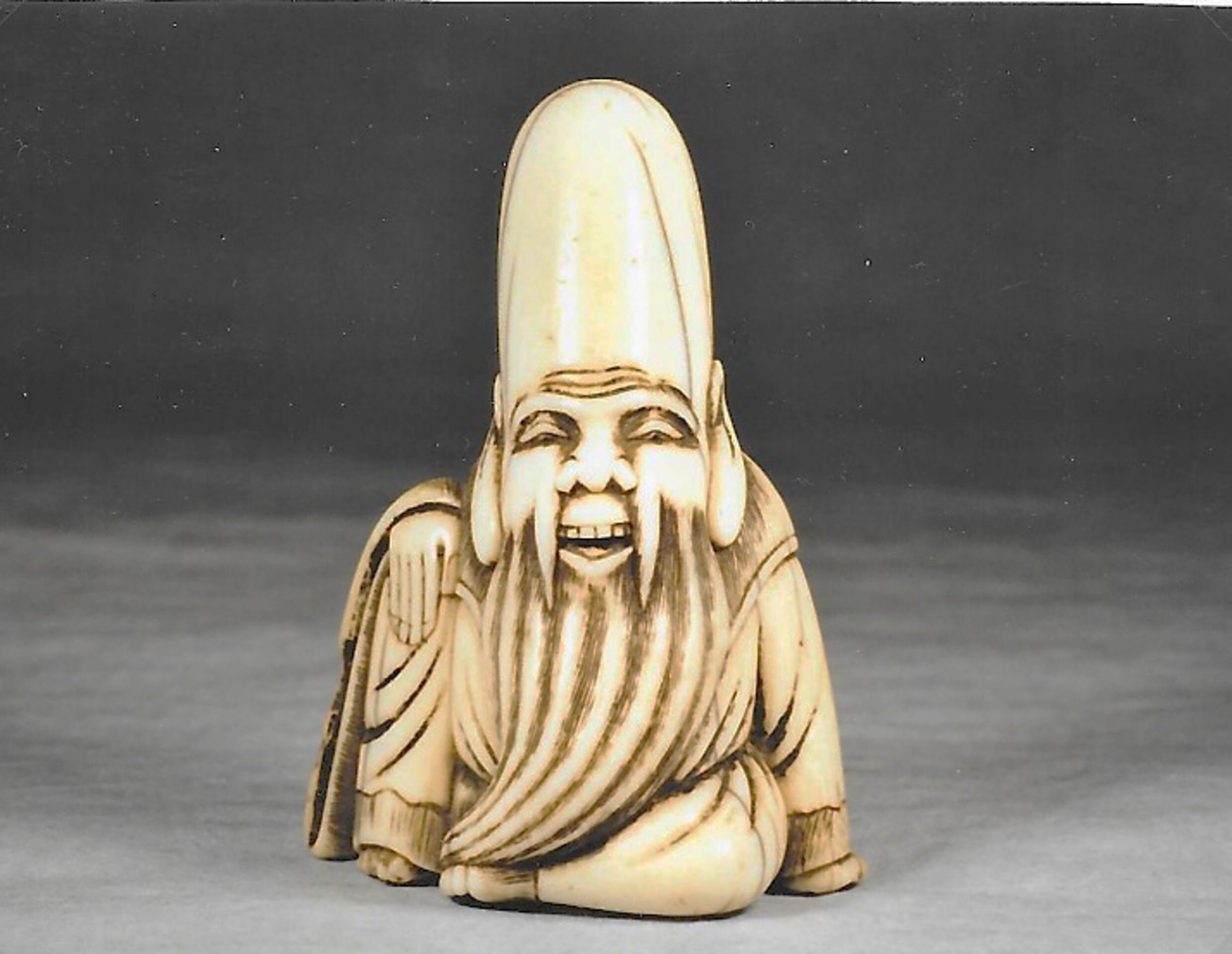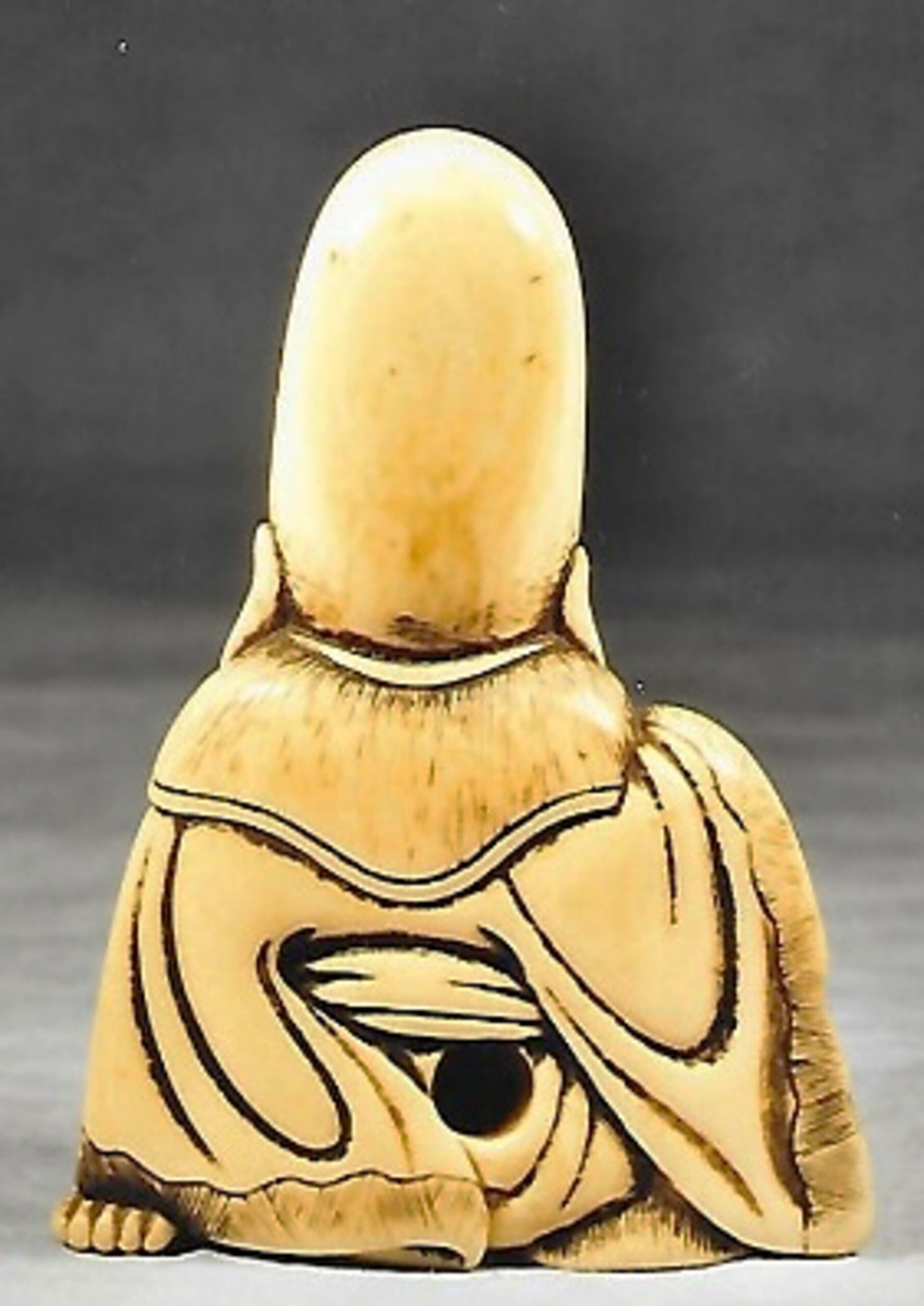 Elfenbein-Katabori von dreieckigem Querschnitt. Der Glücksgott, zu erkennen an dem hohen Schädel und den grossen Ohrläppchen, sitzt lachend mit langem Bart auf dem Boden. Die rechte Hand ruht auf dem aufgestellten rechten Knie, während die Linke sich auf dem Boden abstützt. Höhe 57mm, einige Alterssprünge, die Rückseite deutlich dunkler als die Vorderseite. Gut gebohrte Himotoshi im Rücken und im Gesäss. Nicht signiert. Alter ca. 2.Hälfte 18.Jh.
