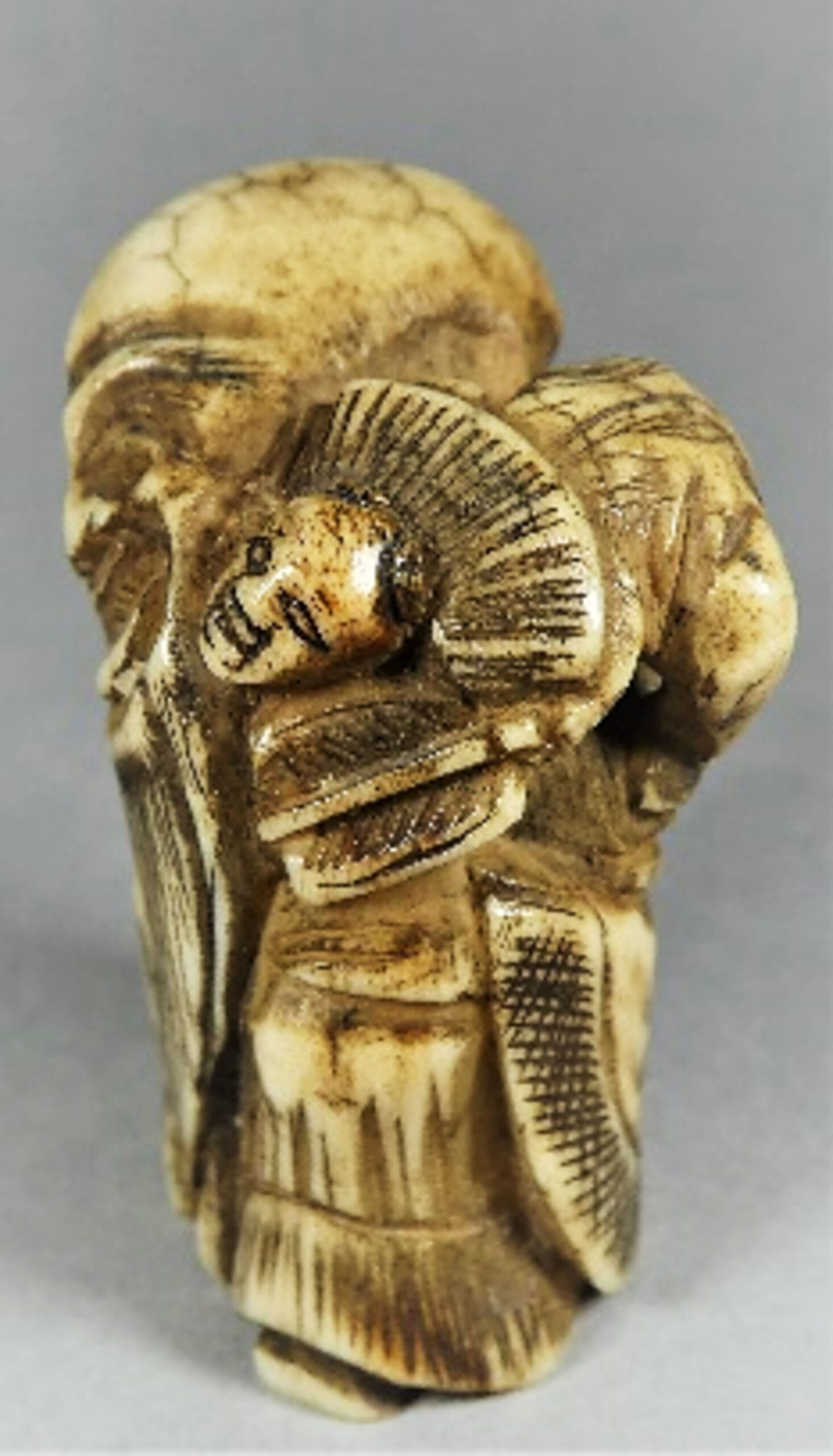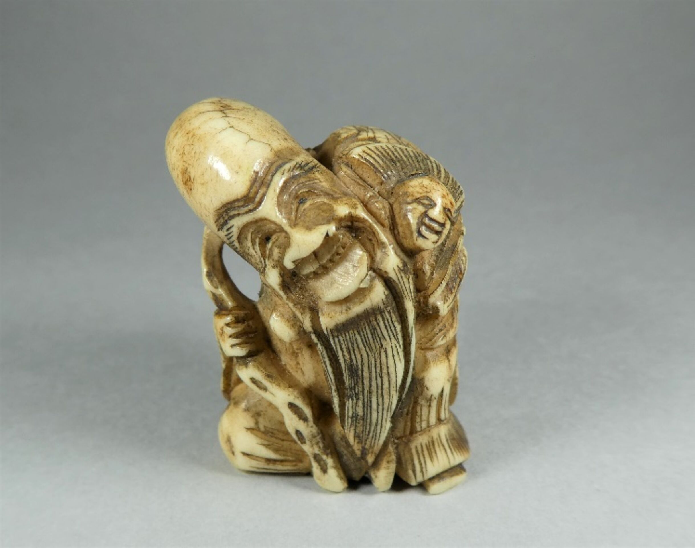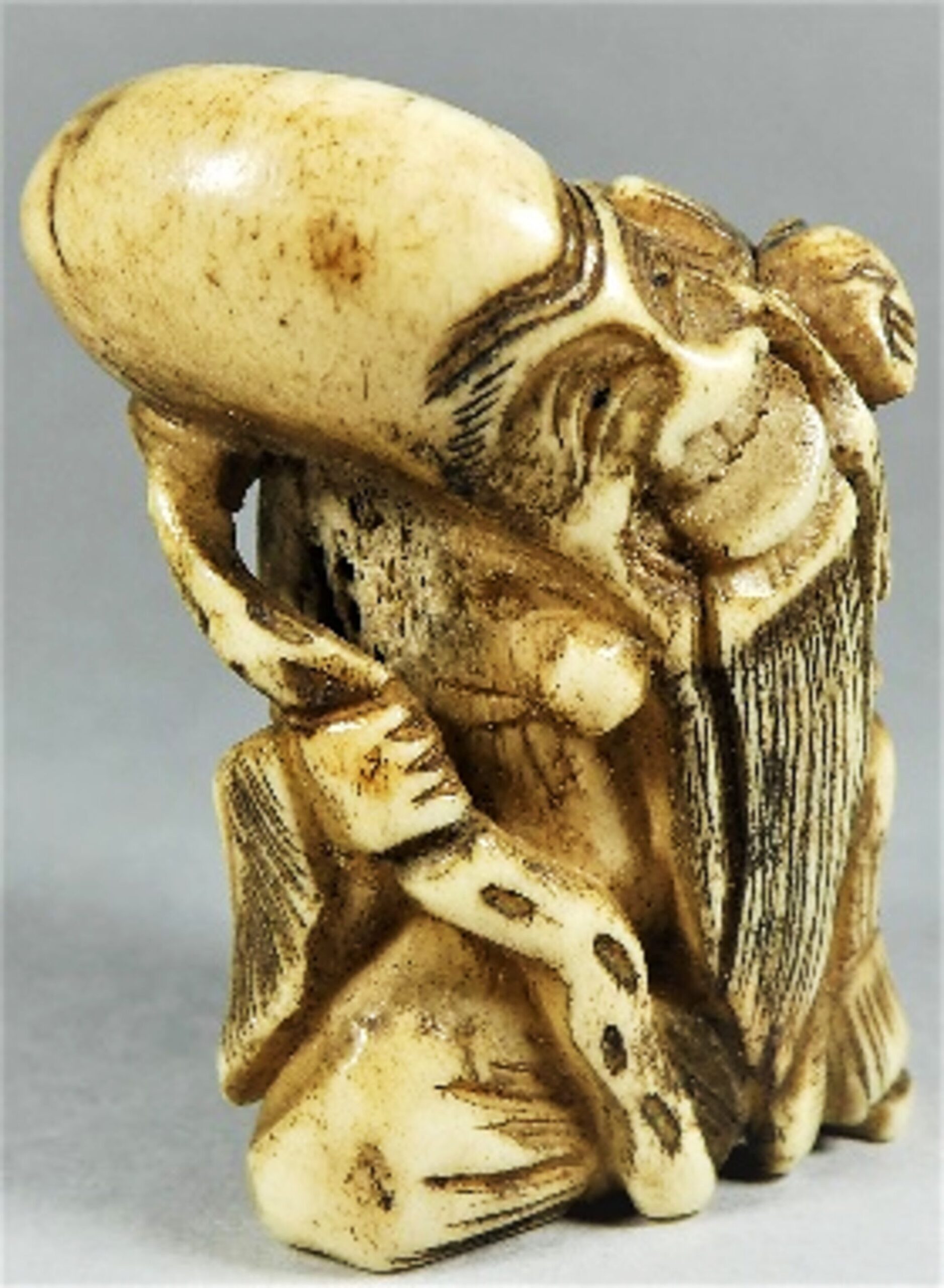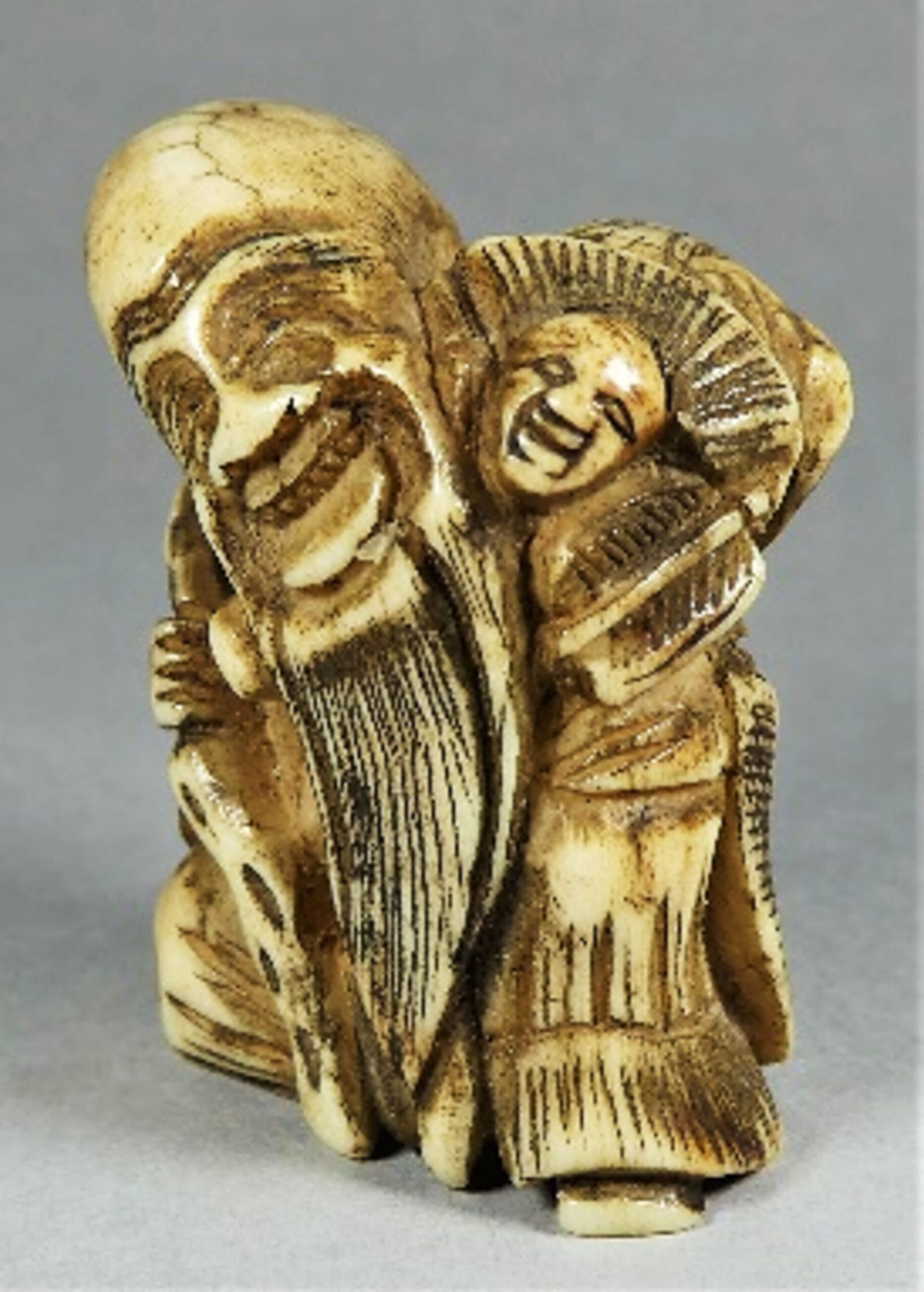 Hirschhorn-Katabori. Der freundliche Glücksgott Fukurokuju, zu erkennen an seinem überlangen Schädel, sitzt/kniet und stützt sich mit der Rechten auf einen Knotenstock. Auf seiner linken Schulter trägt er einen chinesischen Knaben, Karakô. Dieser hinwiederum ist zu erkennen an den beiden dunklen Haarbüscheln Agemaki auf dem ansonsten kahlen Kopf und an dem breiten Schulterkragen Katakara. Ein einfaches liebenswürdiges Stück. Im Rücken zwei gut gebohrte Himotoshi. Unterseitig ist die Spongiosa zu erkennen. Höhe 36mm, Alter ca. 1. Hälfte bis Mitte 19.Jh., nicht signiert.
