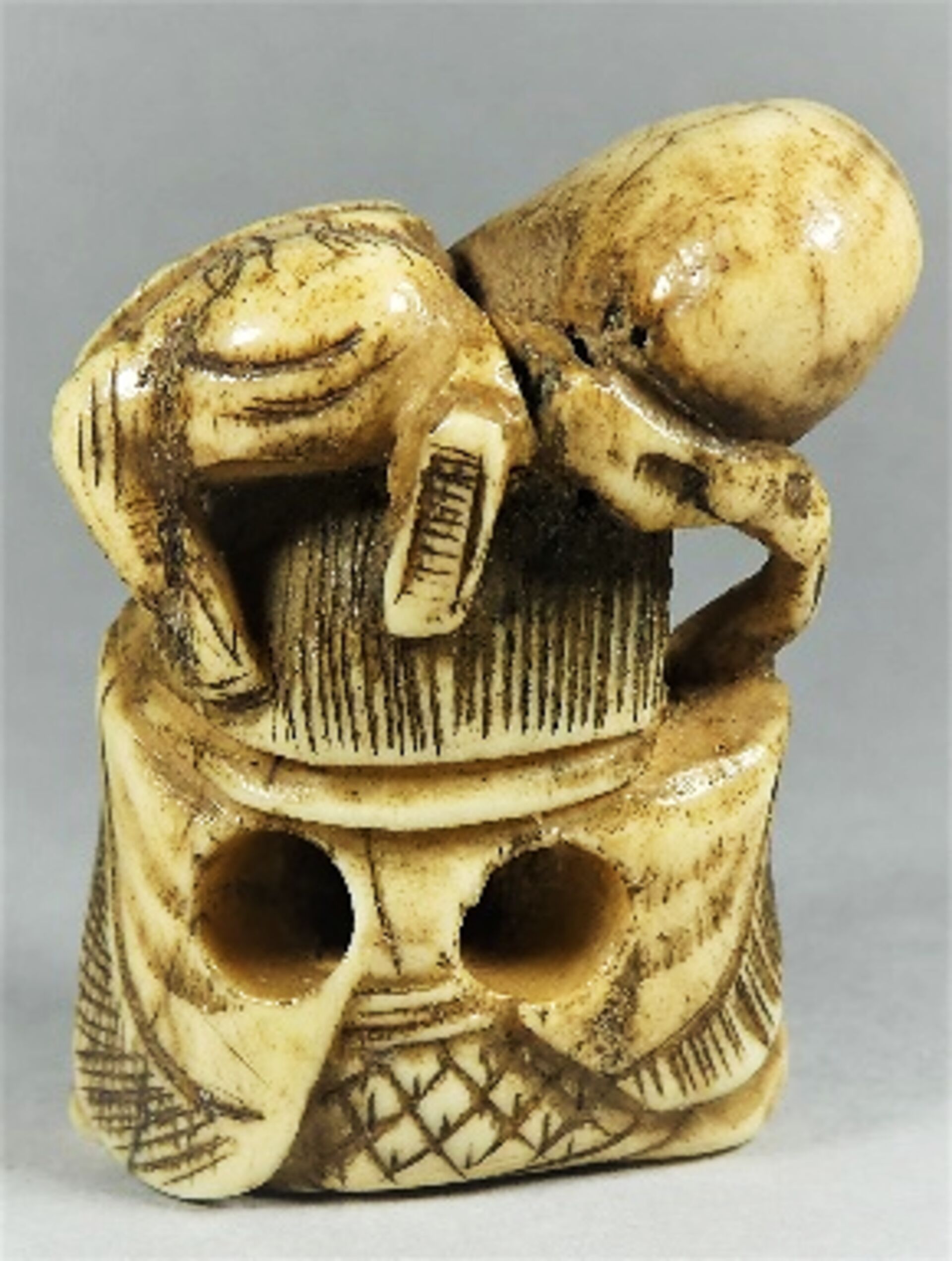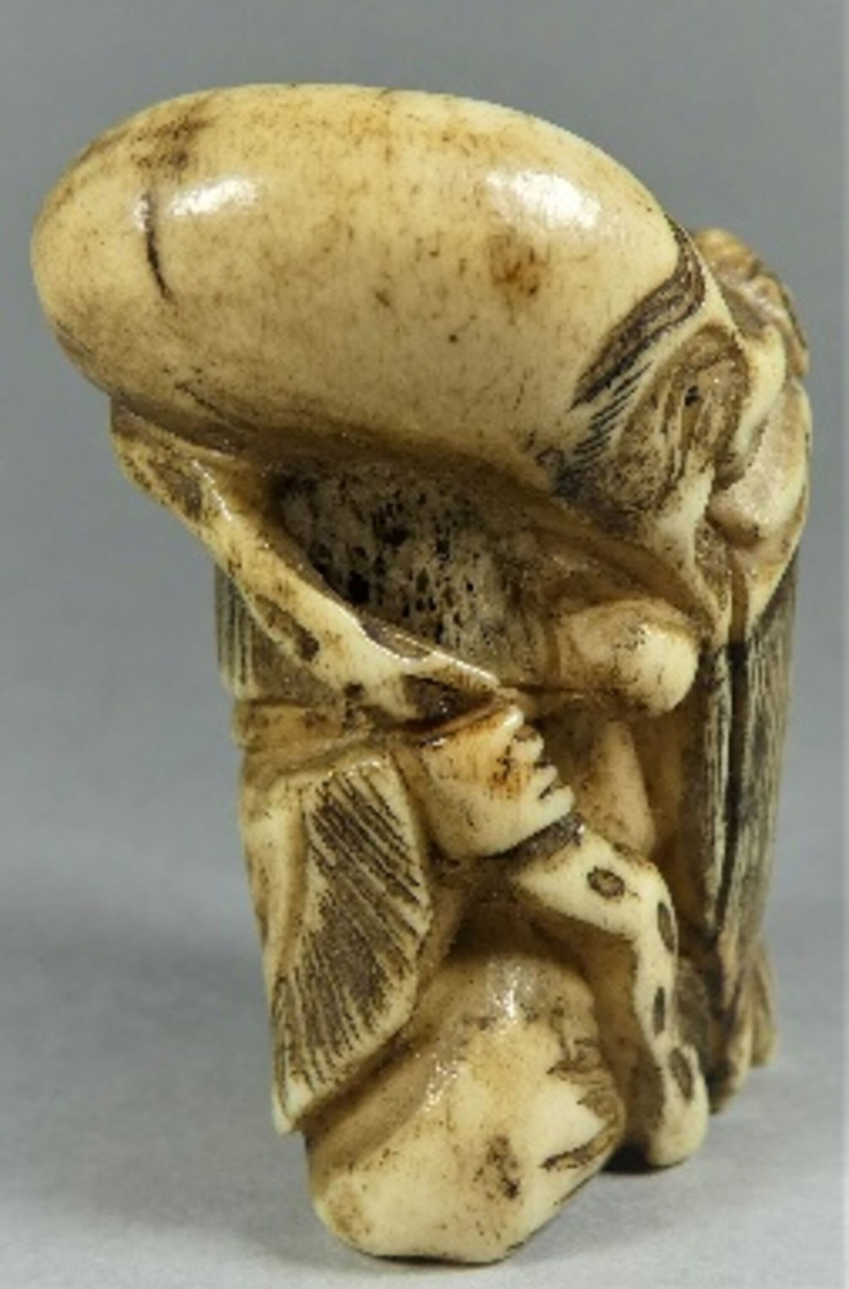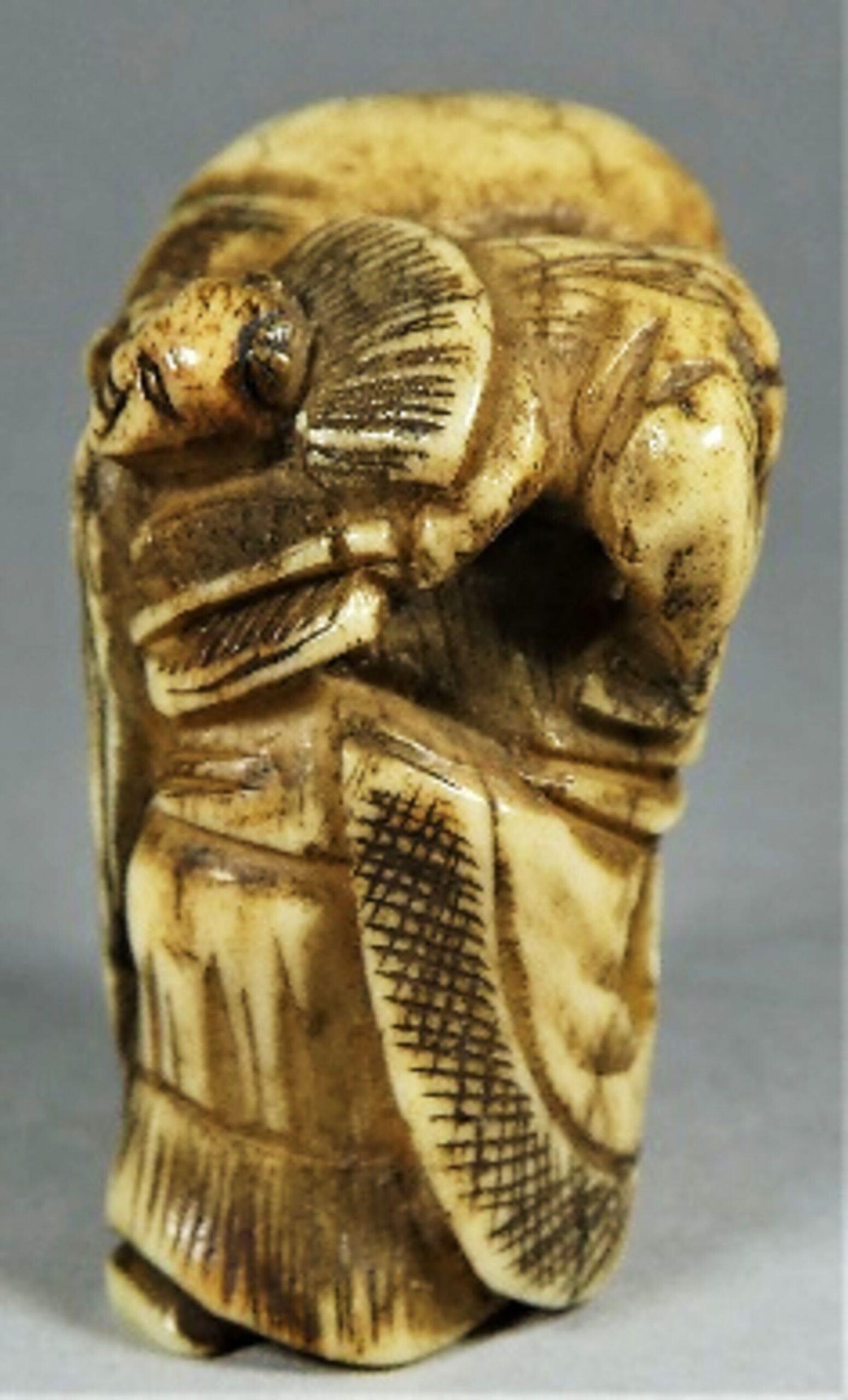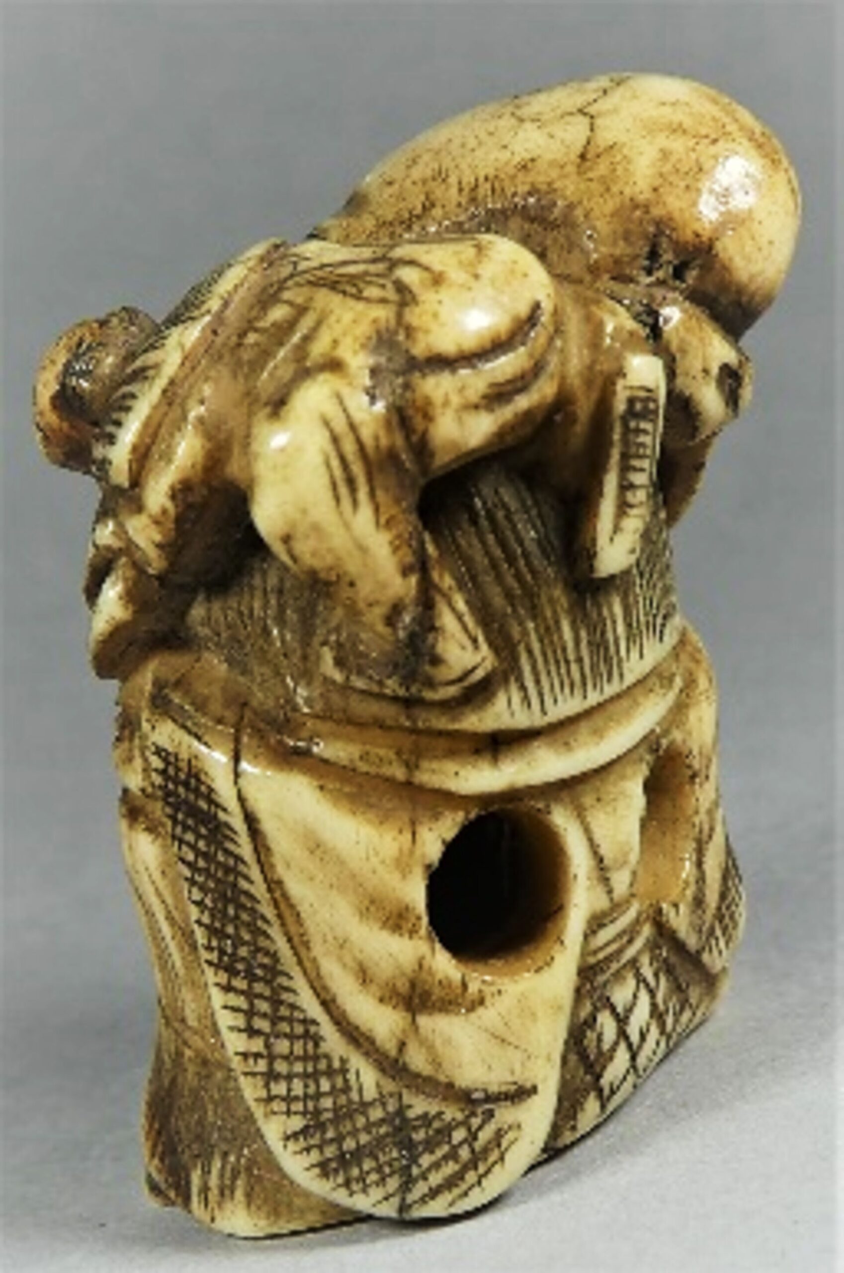 Hirschhorn-Katabori. Der freundliche Glücksgott Fukurokuju, zu erkennen an seinem überlangen Schädel, sitzt/kniet und stützt sich mit der Rechten auf einen Knotenstock. Auf seiner linken Schulter trägt er einen chinesischen Knaben, Karakô. Dieser hinwiederum ist zu erkennen an den beiden dunklen Haarbüscheln Agemaki auf dem ansonsten kahlen Kopf und an dem breiten Schulterkragen Katakara. Ein einfaches liebenswürdiges Stück. Im Rücken zwei gut gebohrte Himotoshi. Unterseitig ist die Spongiosa zu erkennen. Höhe 36mm, Alter ca. 1. Hälfte bis Mitte 19.Jh., nicht signiert.