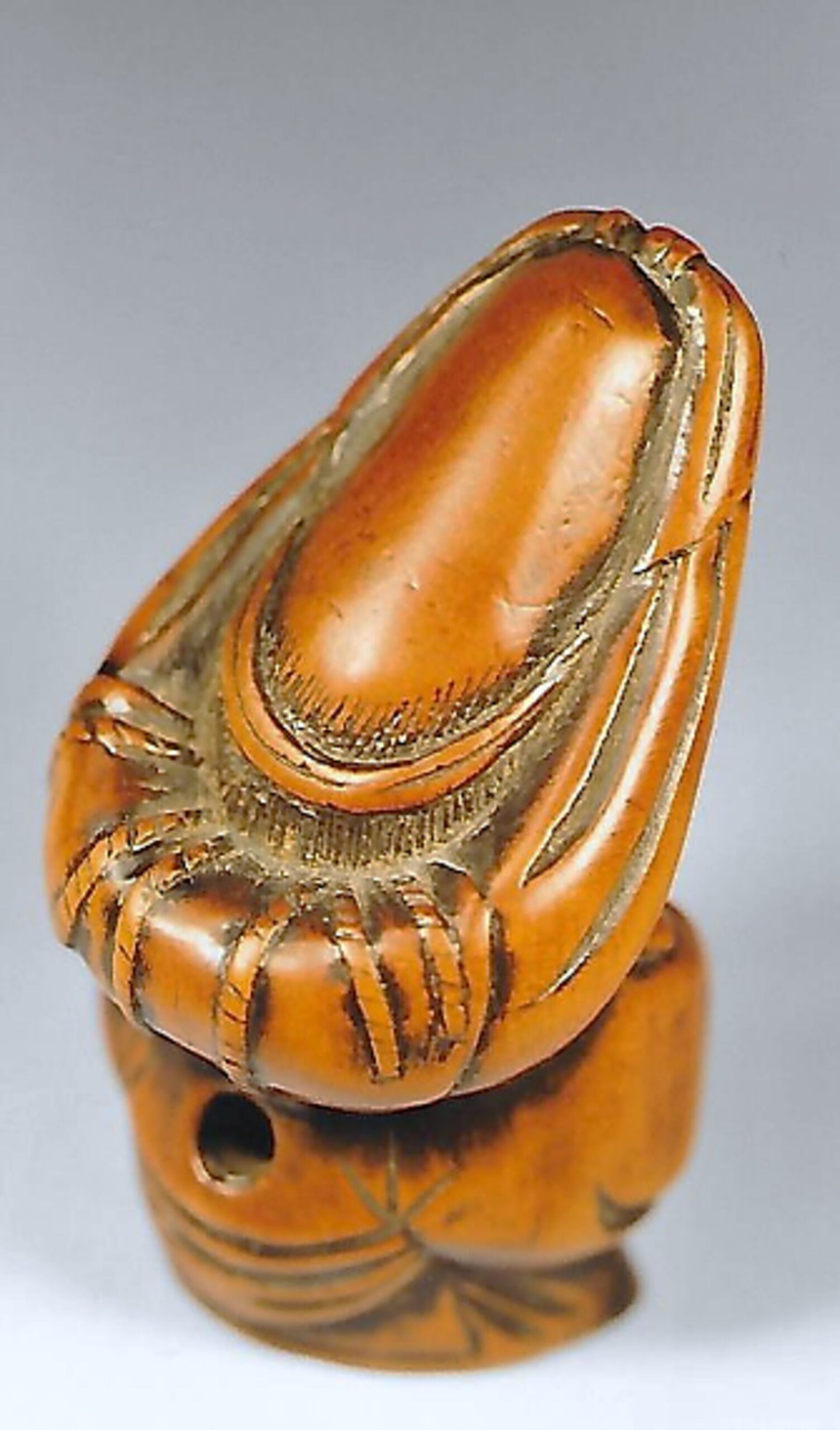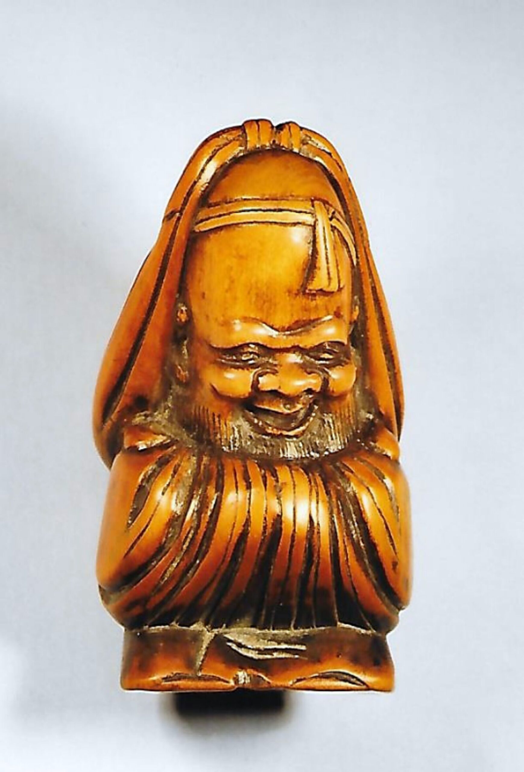 Holz-Katabori. Darstellung des Glücksgottes, wie er, in sich selbst versunken, vergnügt dasteht, den Kopf, lächelnd, leicht gesenkt, die Arme in dem weiten Gewand verschränkt, auf der Stirne ein Schweissband und auf dem hohen Schädel den Glückssack, der ihm hinten über die Schultern hängt. Höhe 52mm. Nicht signiert. Zwei ungleich grosse, gut gebohrte Himotoshi durch Rücken und Boden. Schöne Alterspatina. Alter vermutlich 1. Hälfte 19. Jh.