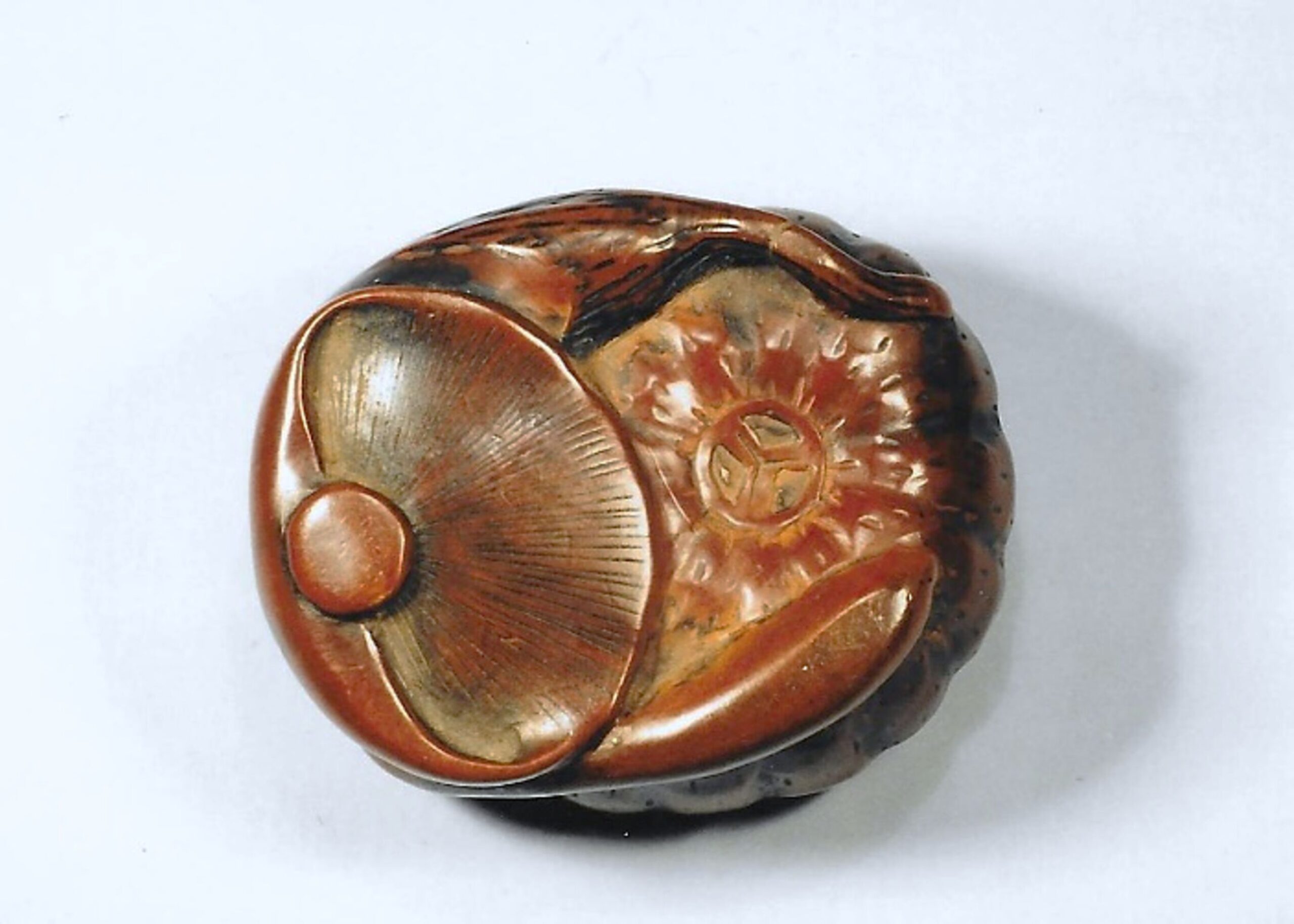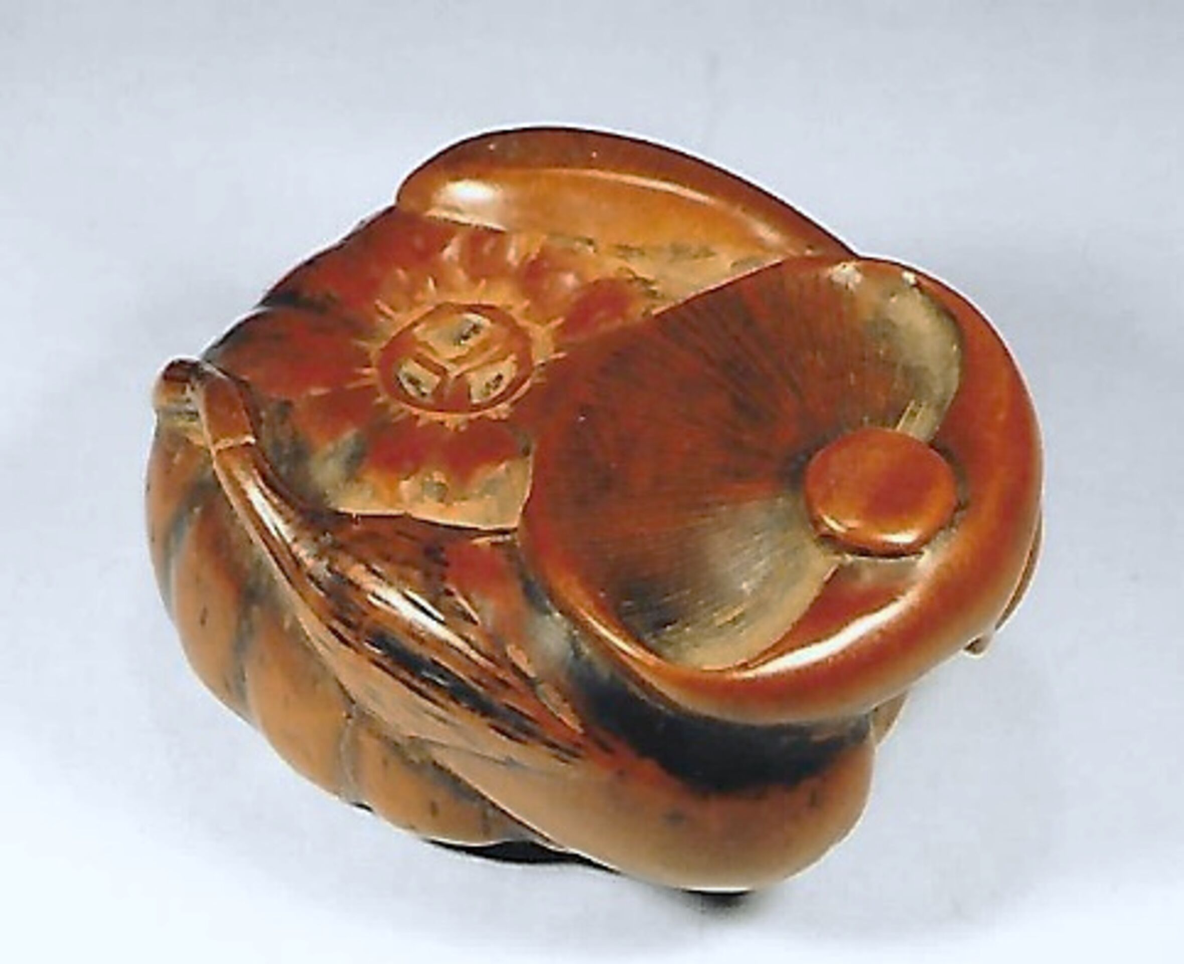 Holz-Katabori. Darstellung einer Gemüsegruppe, bestehend aus Kürbis, Pilz, Aubergine und Bohnenschote. Gut gerundetes und abgegriffenes Netsuke mit schöner Glanzpatina. Länge 52 mm. Natürliches Himotoshi durch den abgehoben gearbeiteten Stiel des Kürbis. Unterseitig auf einer rechteckigen Reserve die Signatur TOMONOBU (K179, K291).