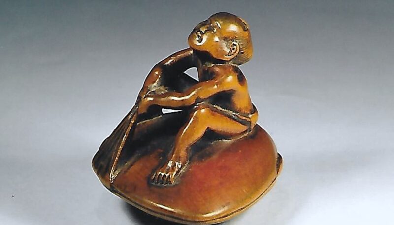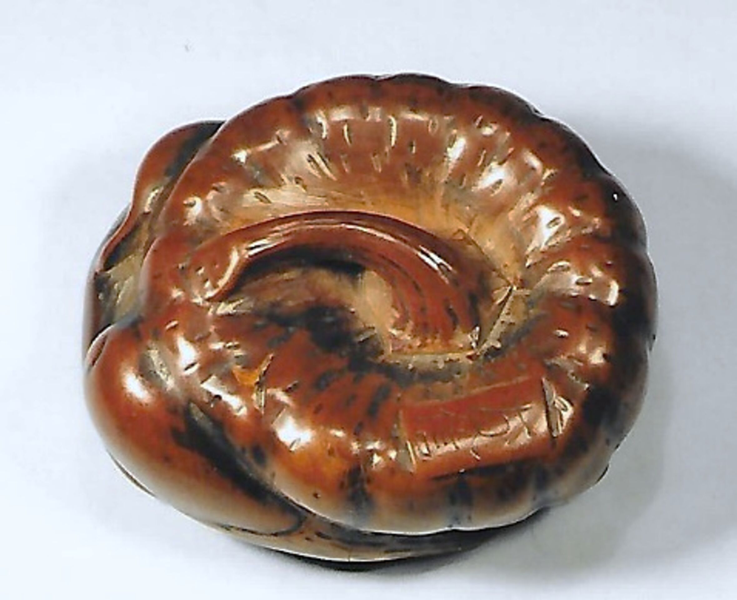 TOMONOBU: Jonas, (p.156) führt einen Schnitzer dieses Namens mit dieser Signatur an und schreibt: Wood, 18th —19th century. — Y.Okada (p.206) schreibt: Late 18ffi cent. Made netsuke of figures animals and insects. — Ueda Reikichi (p.303) No.1211: Temmei and Kansei (1780-1800). Carved netsuke of figures, animals and insects. N.Davev/Hindson collection (p.541) No.2996: MIWA (?). Wood. Late 1 elearly 191h century. und unter No.2999 (mit derselben Signatur): Ivory. Style of Tomochika Chikuyosai. Mid-1e century. — Weber “Koji H6ten vol.II Scuipteur de netsks du )(Er siele. Il sculptait des sujets legendaries et reproduisait des masques (ob das unser Tomonobu ist?). — Der Meinertzhagen Card Index führt auf p.907 4 Schnitzer dieses Namens an, von denen 3 dieselbe Signatur verwenden. Unter Nr.2 ist zu lesen: TOMO-NOBU, ARI-MA (prob. family name, atternatively, name of town nr. Kobe in Setsu, or nr. Nagasaki in Hizen) ?Nagoya school, ca.1820-50 14 Netsuke recorded, all wood. Subj. Frogs, Snakes, Octopus, Pumpkin, Shells, Wasp nest. Style of Tadayoshi, Yoshimasa etc. — Das könnte unser Tomonobu sein