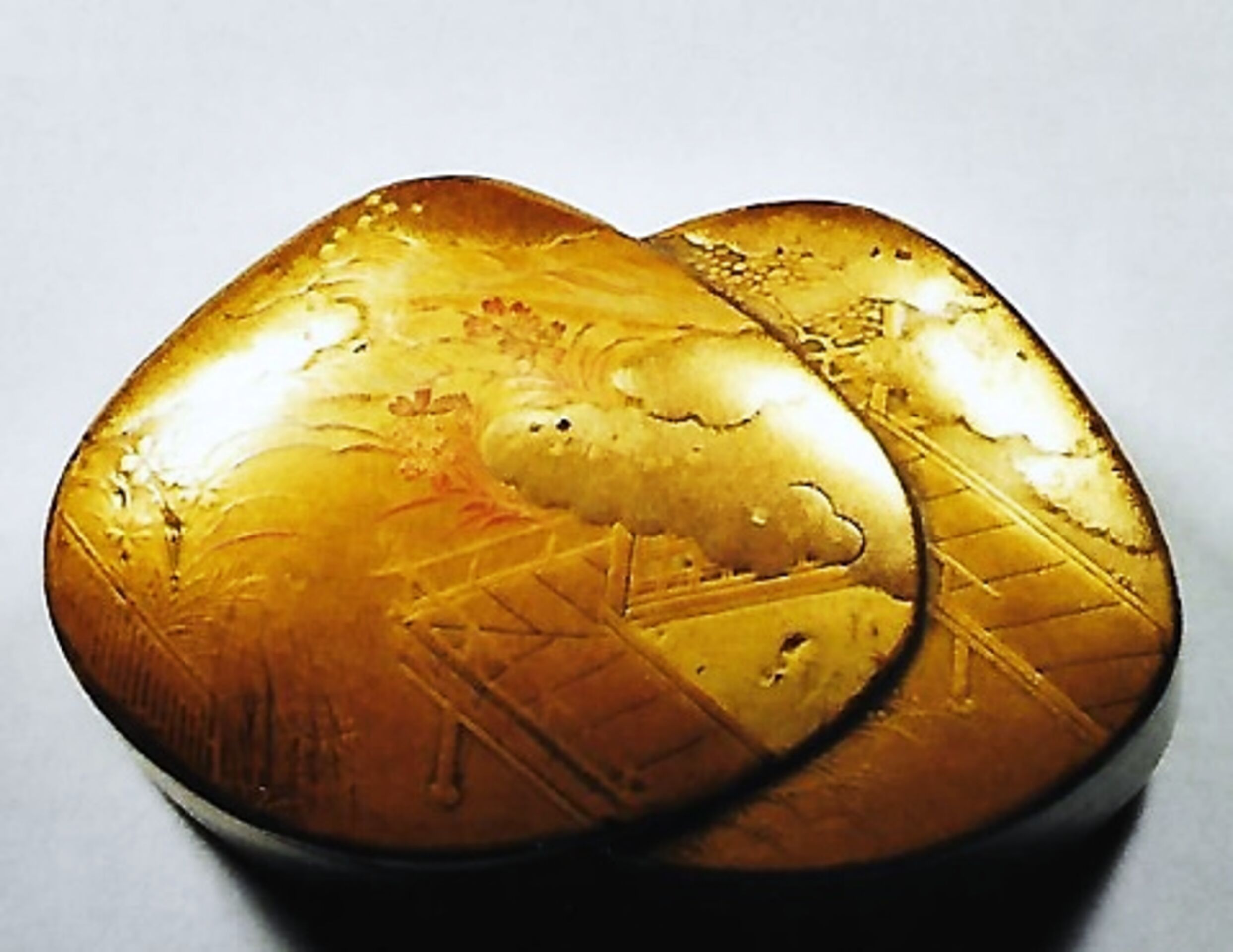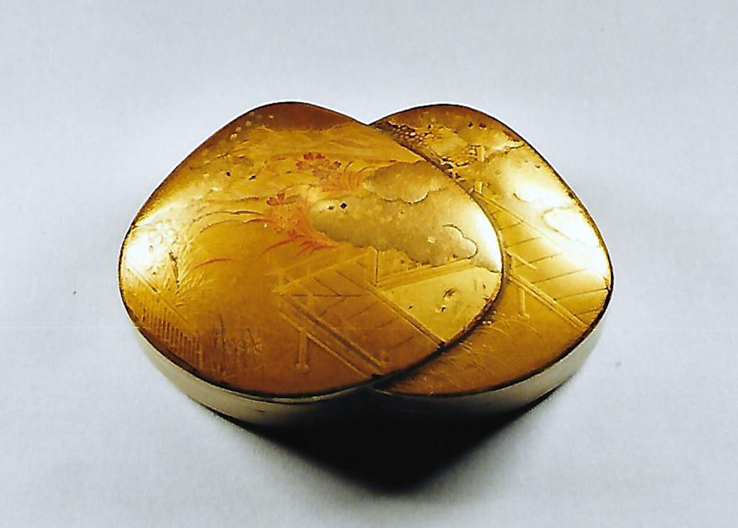 Hako-Netsuke (Schachtel-Netsuke) in Form zweier einander überlappender Muscheln. Auf der Vorderseite in unterschiedlichen Tönungen und Techniken von Rot- und Goldlack offene Veranden über einer Hügellandschaft mit Bäumen, Sträuchern und Blüten. Auf der vorderen Muschel sind ein Teil einer gefensterten Schiebewand und der Eingang in ein Haus sichtbar. Weiteres ist von einer Wolkenformation verdeckt. Auf der Rückseite Sonnenstrahlen- und Wellendekor und eine metallene runde, auf ihrer äusseren Zirkumferenz genoppte Öse für den Schnurdurchtritt. Innen gestreuter Goldlack und deckelseitig ein länglicher Ring zur Befestigung der Schnur. Länge 46mm, Breite 29mm, Höhe 18mm. Nicht signiert. Alter, vermutlich 1. Hälfte 19.Jh.