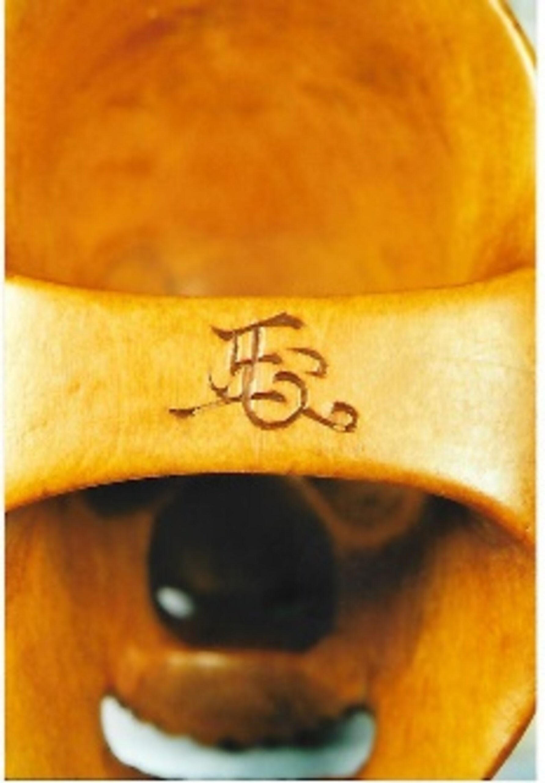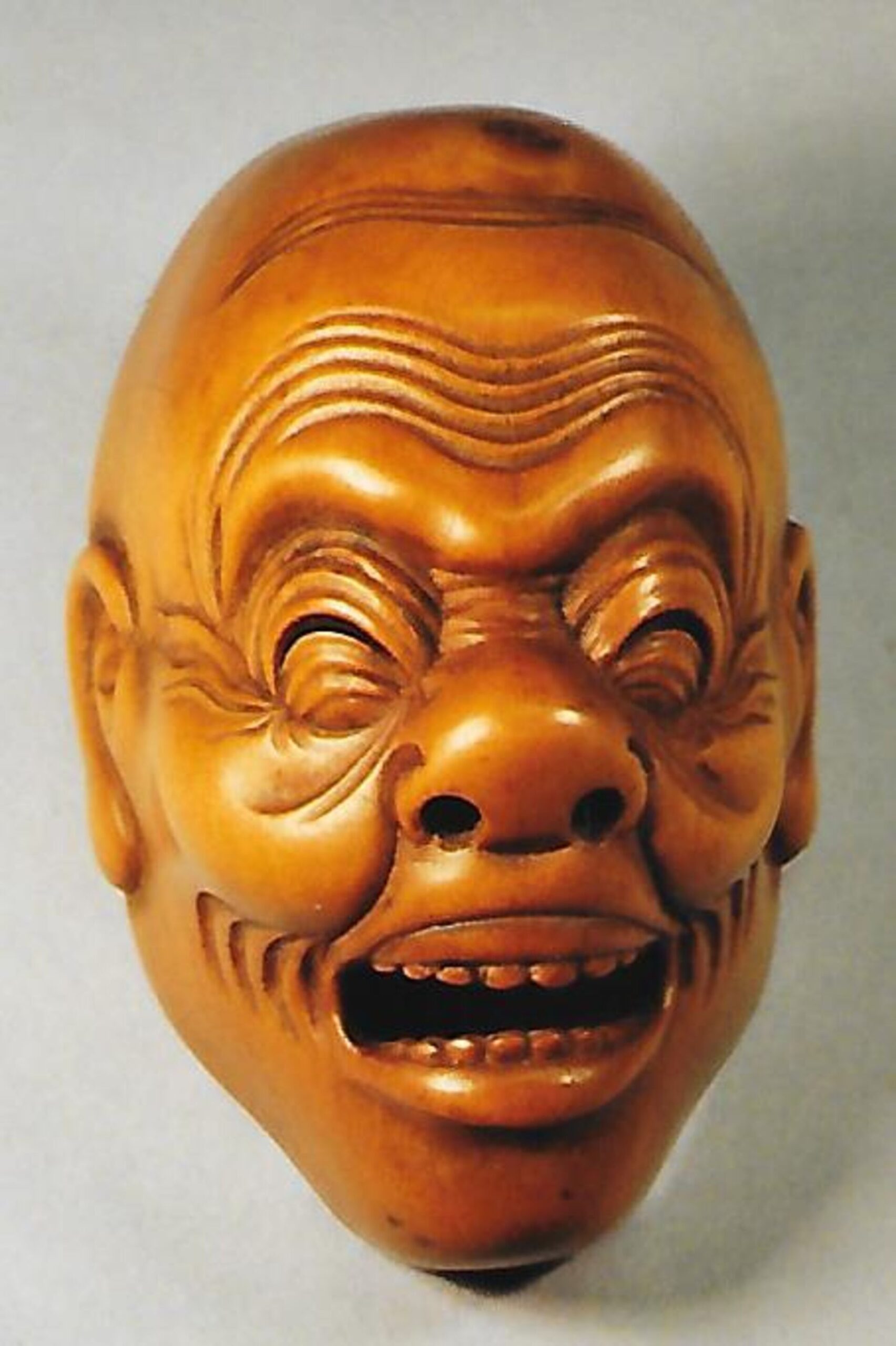 Bugaku-Maske eines kahlköpfigen Mannes mit vielen Falten im Gesicht. Die Augen sind zugekniffen, der Mund ist geöffnet und lässt beide Zahnreihen sehen. Der Ausdruck ist unbestimmt, könnte sowohl als spasshaft wie als gequält interpretiert werden. Helles, feinmaseriges Holz, sehr leicht. Höhe 46mm, Breite 32mm. Rückseitig auf dem Steg signiert mit einem Kakihan (persönliches Zeichen des Künstlers).