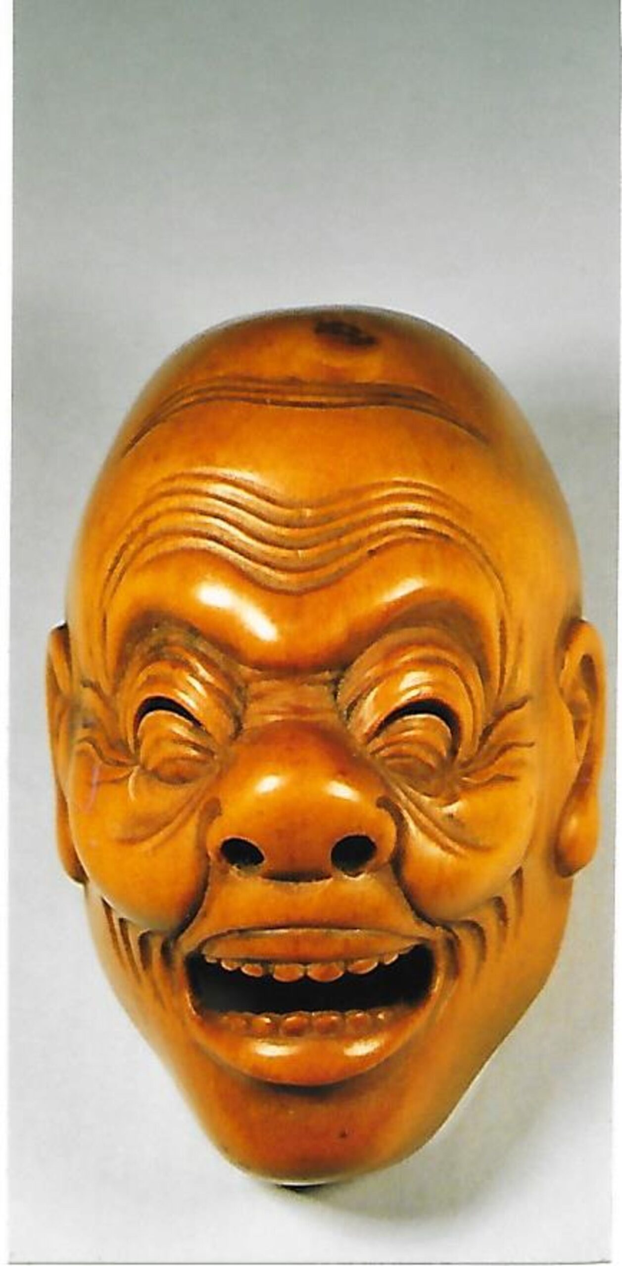 Herkunft: Auktion Galerie Koller, Zürich, 9.12.2000, Lot 528. Gemäss schriftlicher Angabe des deutschen Einlieferers wurde das Stück 1979 erworben bei Galerie Gross in Wiesbaden. – Die Maske ist abgebildet bei M. Tollner, Netsuke, 1954, pl.13. Als Vorbesitzer ist dort L. Gichner, Washington DC genannt. – Die Maske ist ebenfalls abgebildet in Lazarnick, N&IA, 1981, p.1290. Das Kakihan ist dort bezeichnet als „unidentified“. – Das Kakihan ist ebenfalls abgebildet in R. Bushell, Netsuke Masks, pp.193-4, Nrn.6-10, dort auch nicht identifiziert. – Lazarnick MCI 1986 p.1014 bildet das Kakihan im Zusammenhang mit einem sitzenden Affen ab. Er datiert das Stück als „early Meiji“ (d.h. nach 1868). – Barry Davies, Netsuke Classics, 1990, No.74, zeigt die Maske eines grimassierenden Mannes mit demselben Kakihan. Verglichen mit anderen signierten Masken neigt er, aufgrund des expressiven Ausdrucks und des hellen Buchsbaumholzes dazu, sie dem Schnitzer SANSHO, spätes 19.Jh. zuzuordnen. – B. Filatov, Kokeisai Sansho: Mystery oft he Genius. Int. Netsuke Society Journal 32/1, Spring 2012, pp.12-25, stellt die Arbeiten dieses Künstlers ausführlich dar und ordnet ihm auch das Kakihan zu: SANSHO 1871-1936, aus Osaka, Schüler von Dosho.