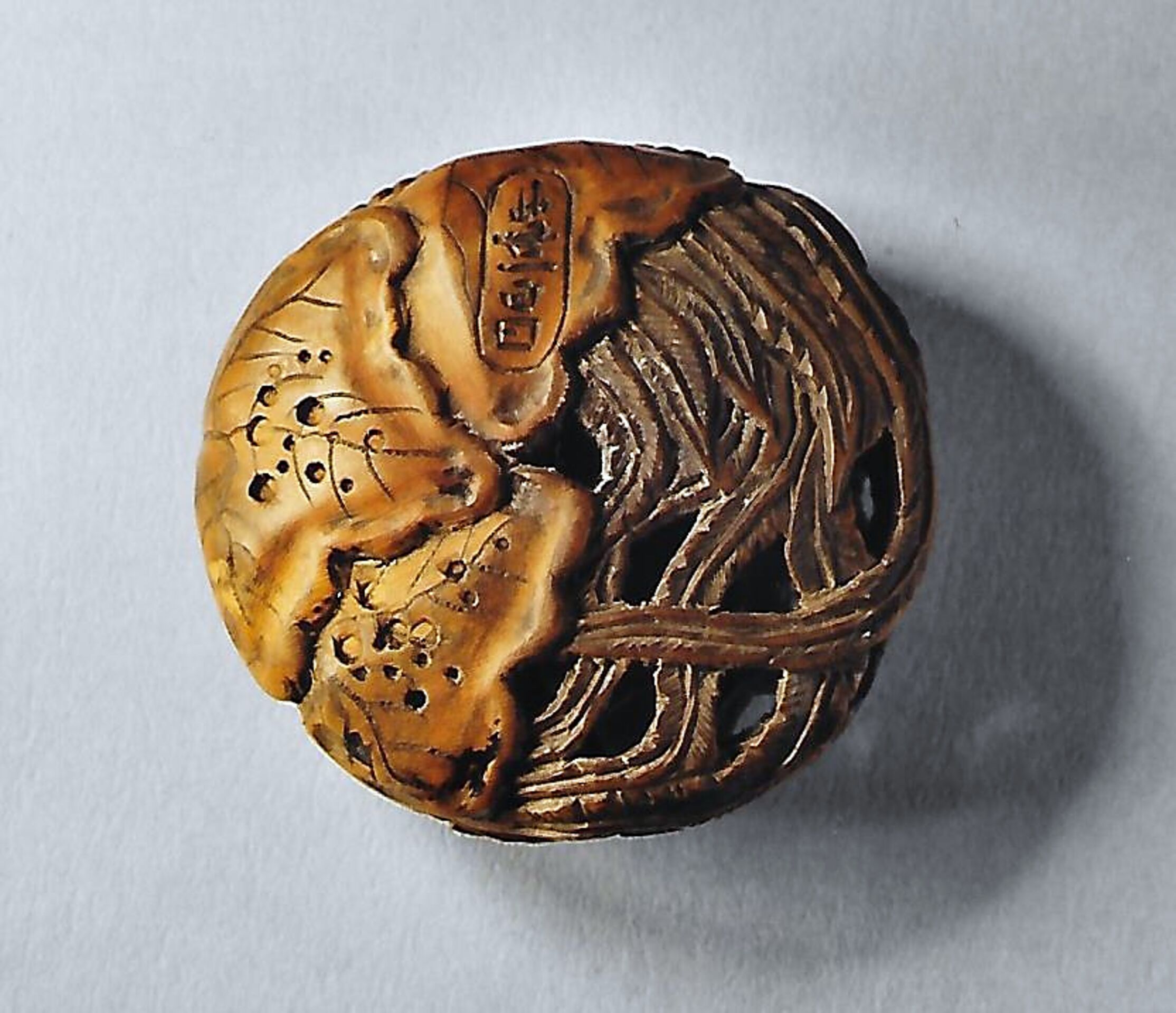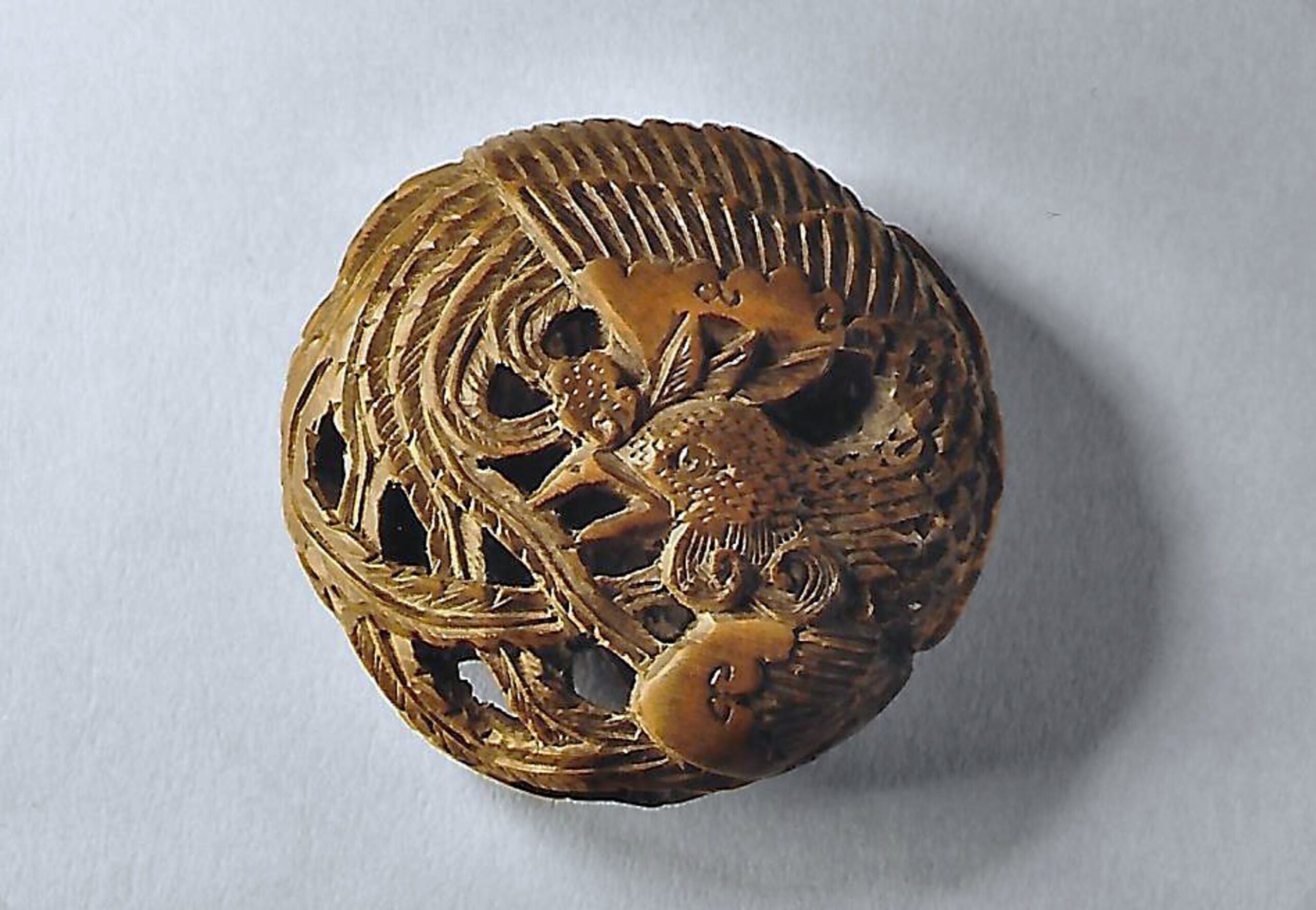 Holz-Ryûsa. Kunstvoll und durchbrochen gearbeitet der Vogel mit seinem reichen Gefieder. Das Auge in hellem Schildpatt eingelegt. Auf der Unterseite drei absichtlich wurmstichige Paulownia (Kiri)-Blätter und die Signatur in einer länglich gerundeten Reserve TOYOMASA (K505, K274). Grösster Durchmesser 38mm.