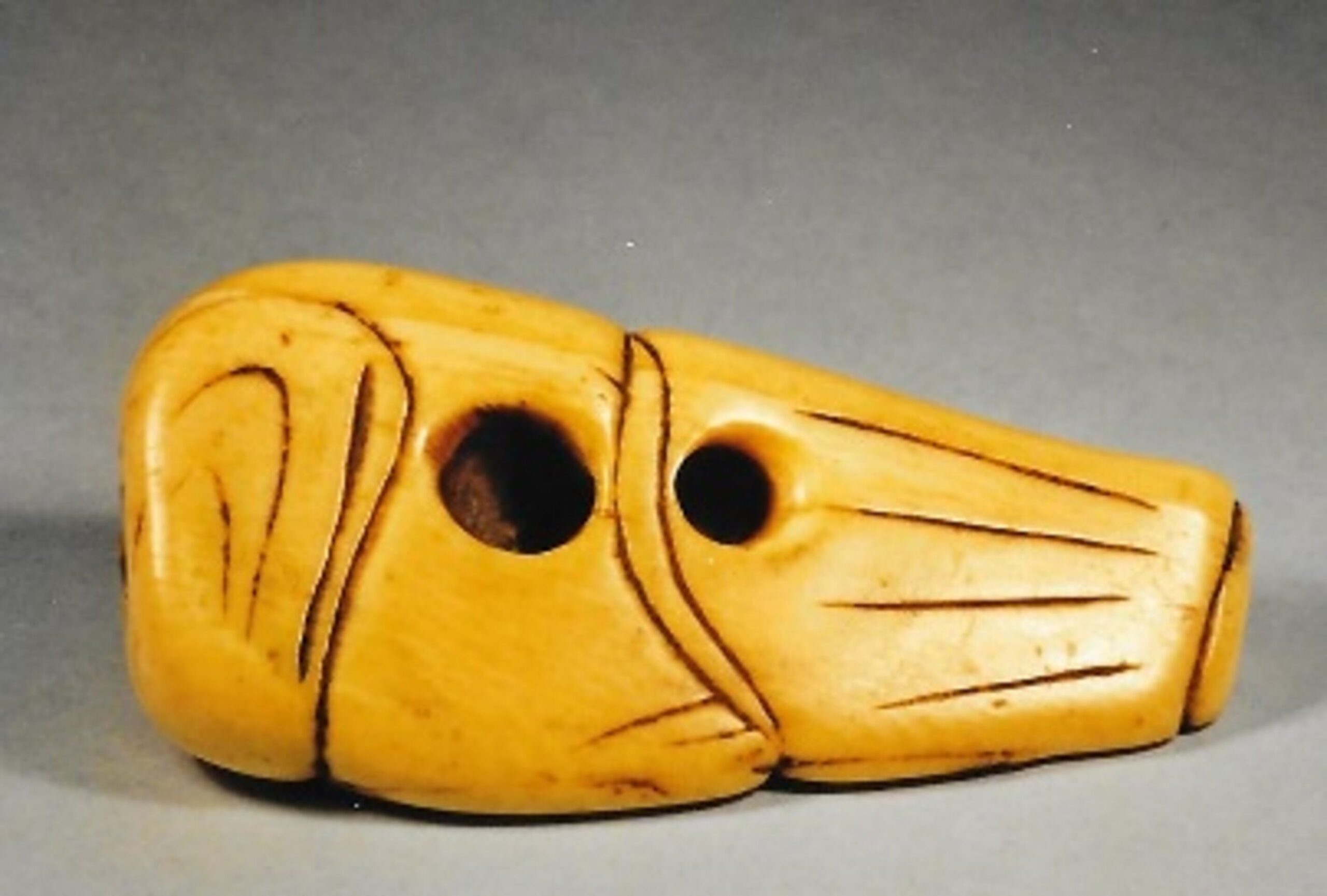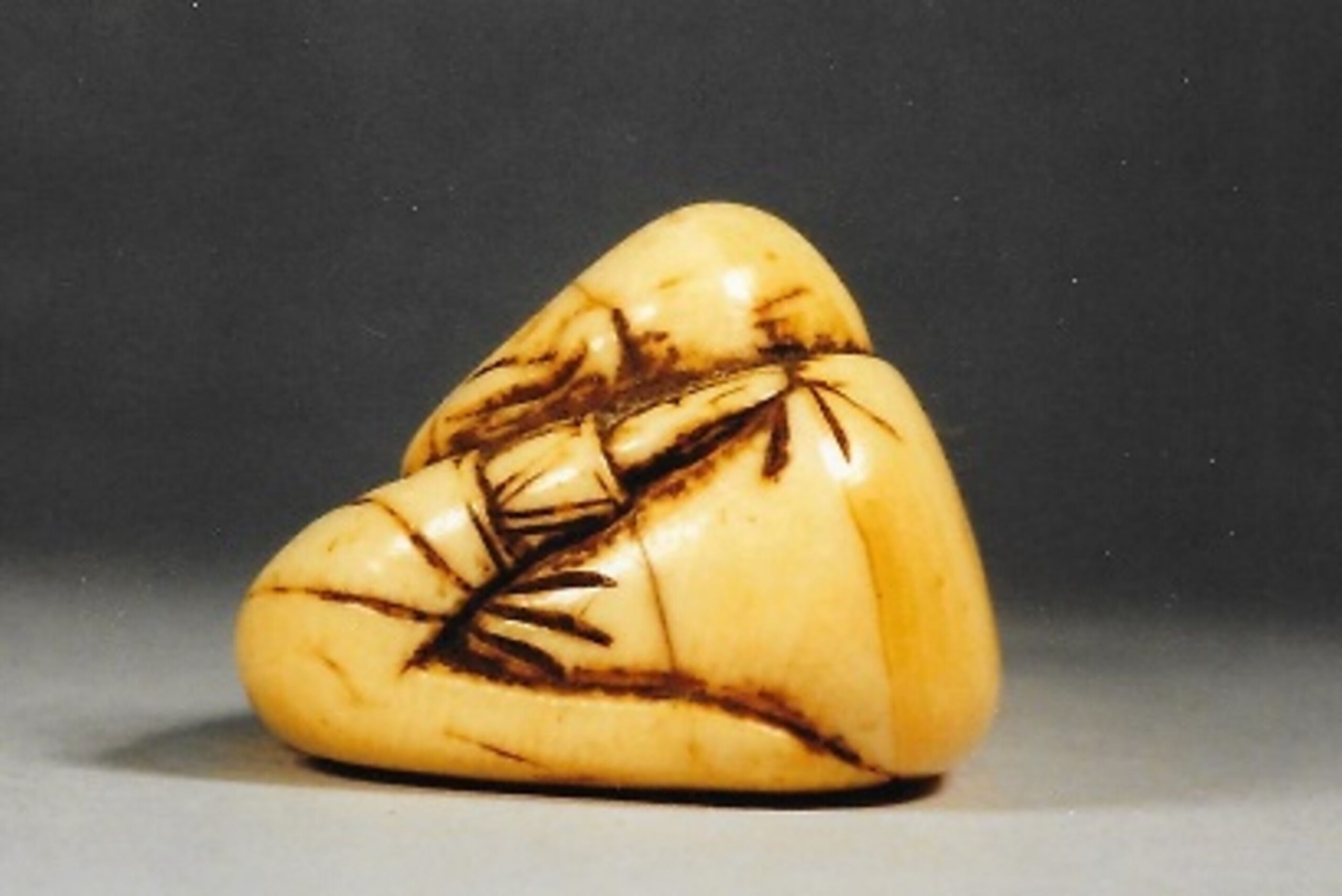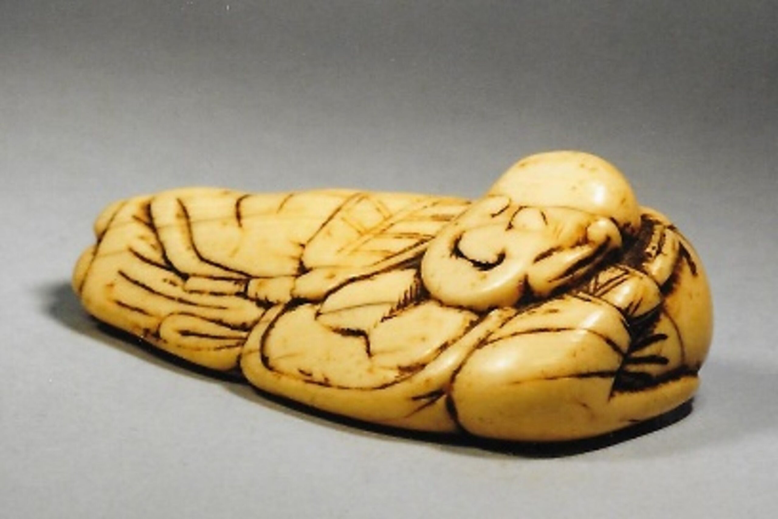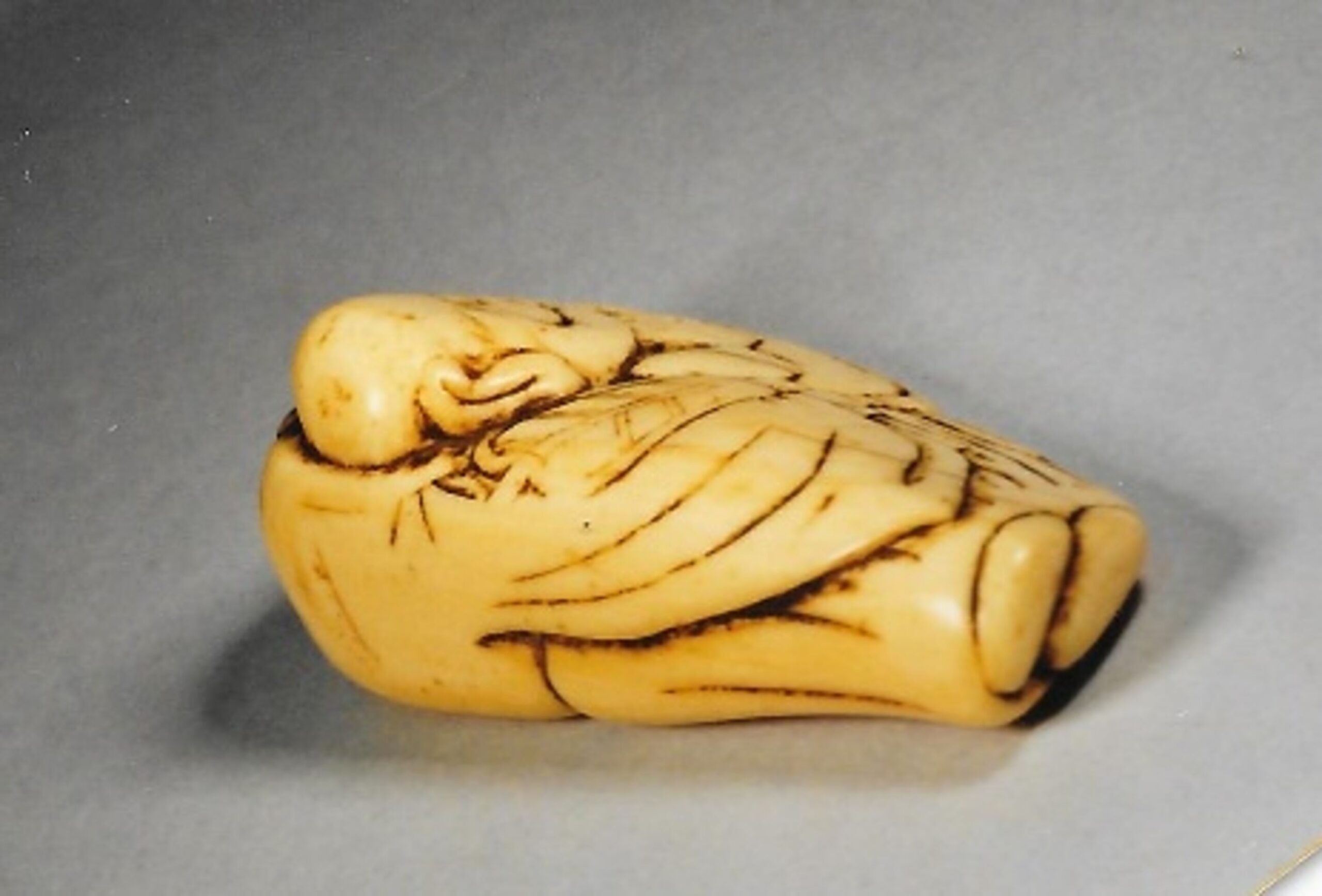 Elfenbein-Katabori. 62mm, 1800 oder früher, nicht signiert. Der liegende Glücksgott Hotel ist mehr zu erahnen als zu sehen. Er liegt auf der linken Körperseite, der lachende Glatzkopf mit den übergrossen Ohren ist auf den linken Arm gestützt. Man ahnt die Brüste und den fetten nackten Bauch, die rechte Hand hält einen Blattfächer vor der rechten Schulter, auf der Unterseite zu beiden Seiten des Gürtels zwei unterschiedlich grosse, gut gebohrte Schnurlöcher Himotoshi. Die Grundform ist dreieckig, konisch zulaufend, einige Alterssprünge, alles sehr abgegriffen, handschmeichelnd, man könnte meinen, der heilige Mann habe sich bereits weitgehend aus dem Sein zurückgezogen, wie es das Ziel des Buddhismus ist.
