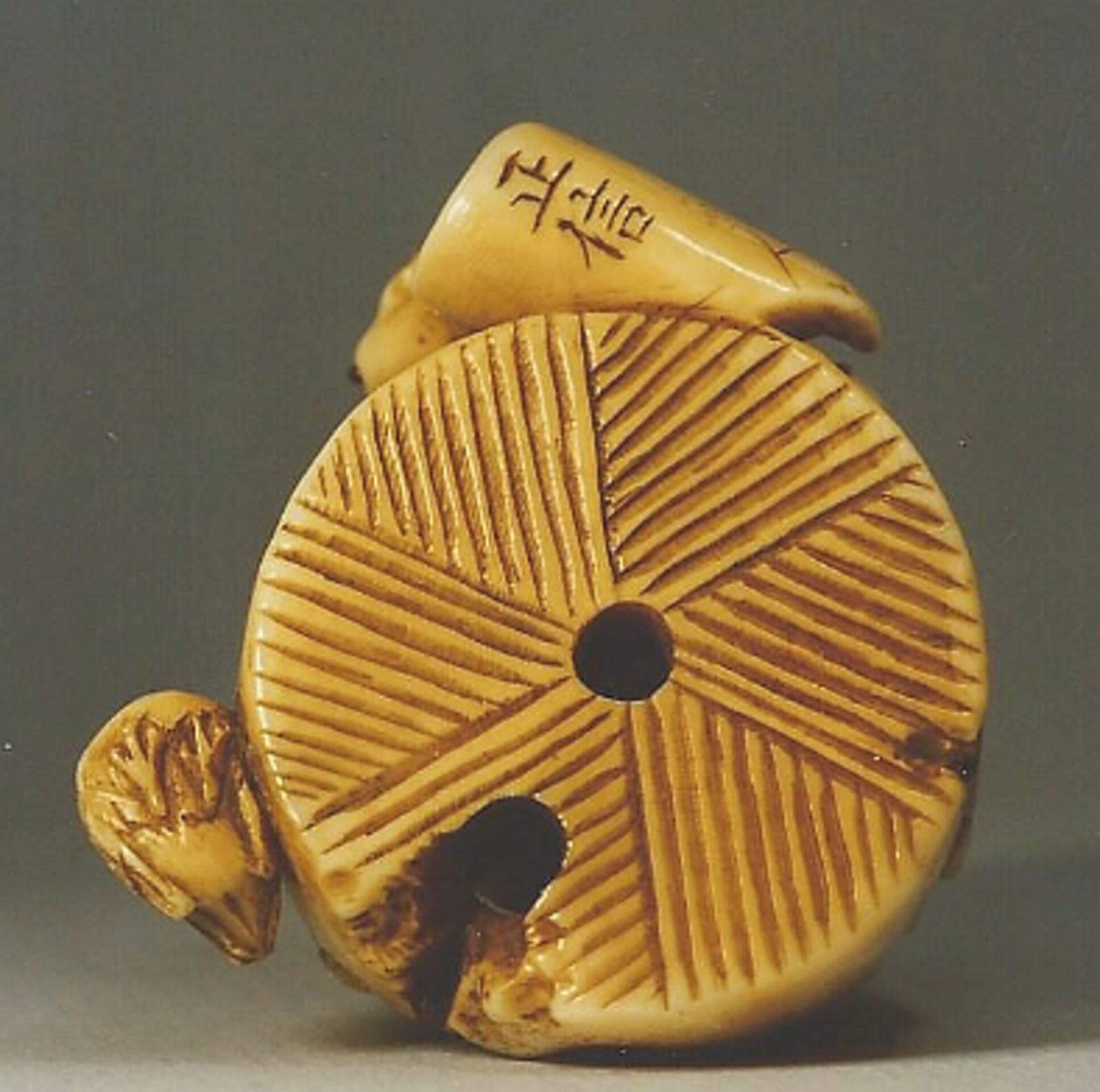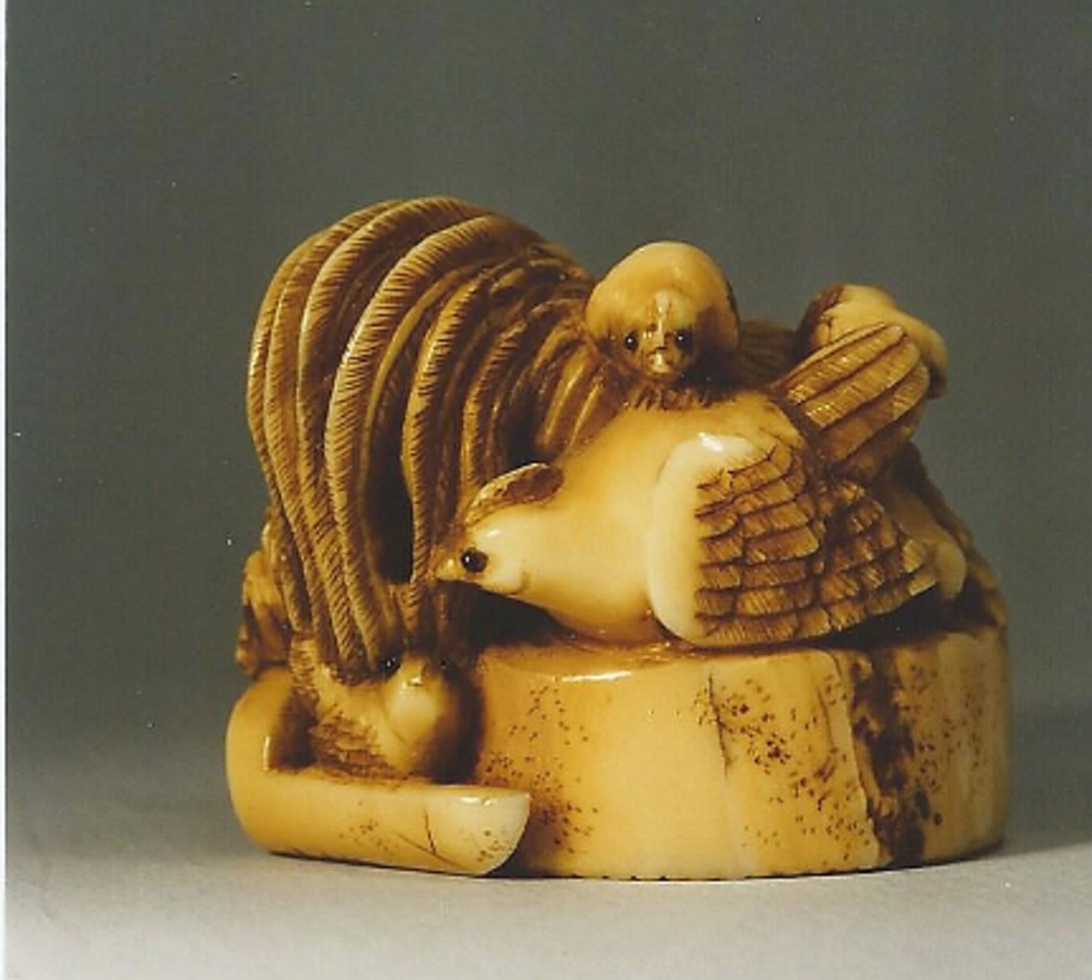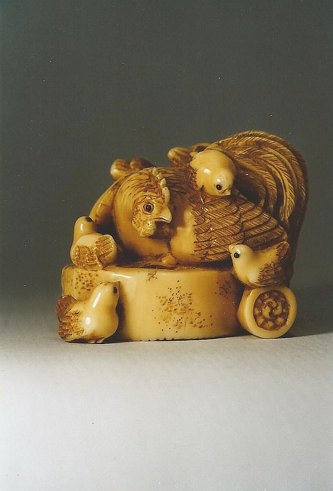 Elfenbein-Katabori. Auf einem und um einen Mühlstein befinden sich ein prächtiger Hahn, eine vergleichsweise bescheidene Henne und acht Kücken. Alle haben mit dunklem Material eingelegte Augen. Neben dem Mühlstein liegt ein Dachziegel, auf dessen Vorderseite das aus drei Kommas gebildete Glückszeichen Mitsu-tomoe eingraviert ist. Eine kompakte Komposition. Max. Breite 38mm. Auf der Unterseite des Dachziegels die Signatur: MASANOBU (K191, K192). Alter: ca. Mitte 19.Jh.