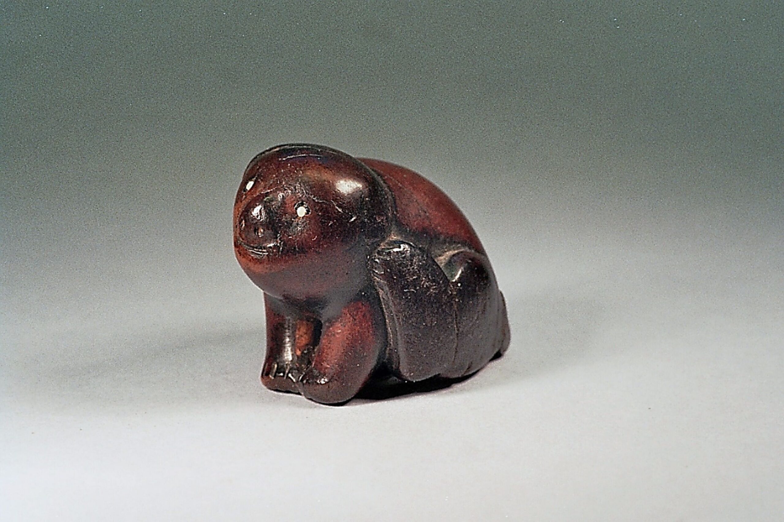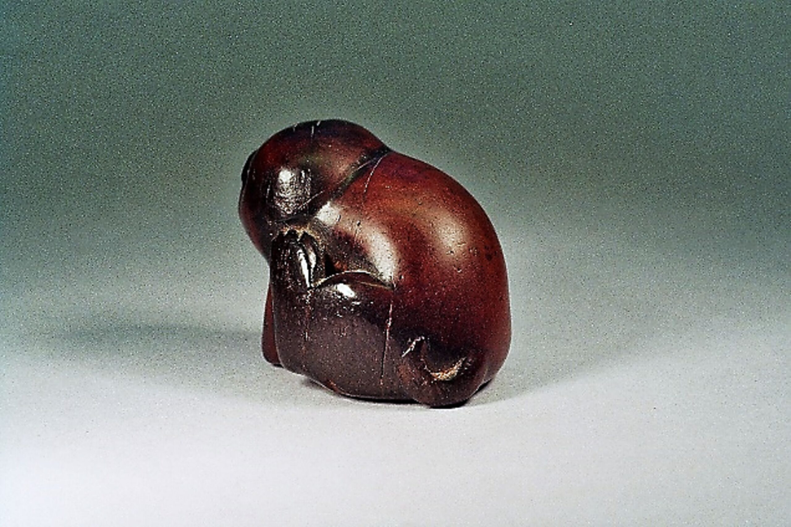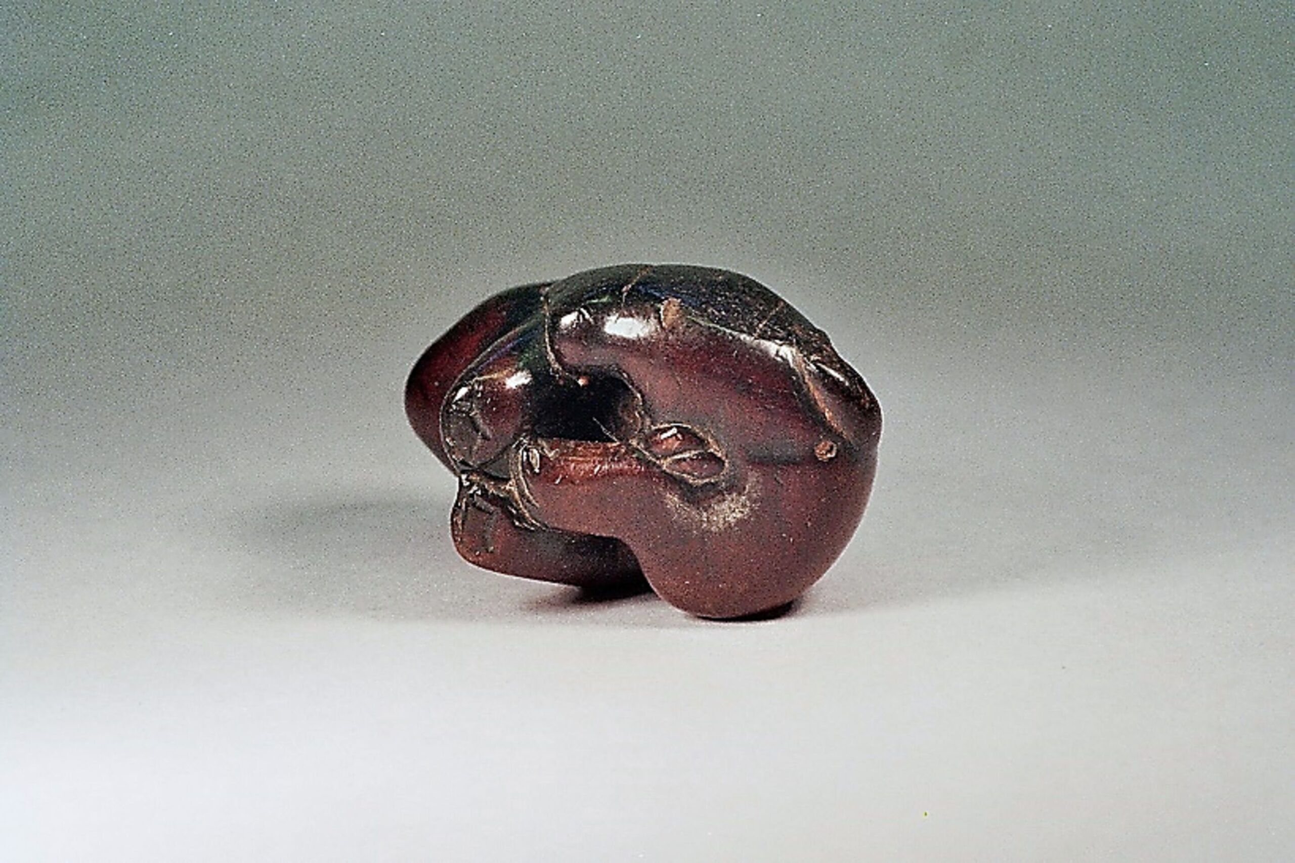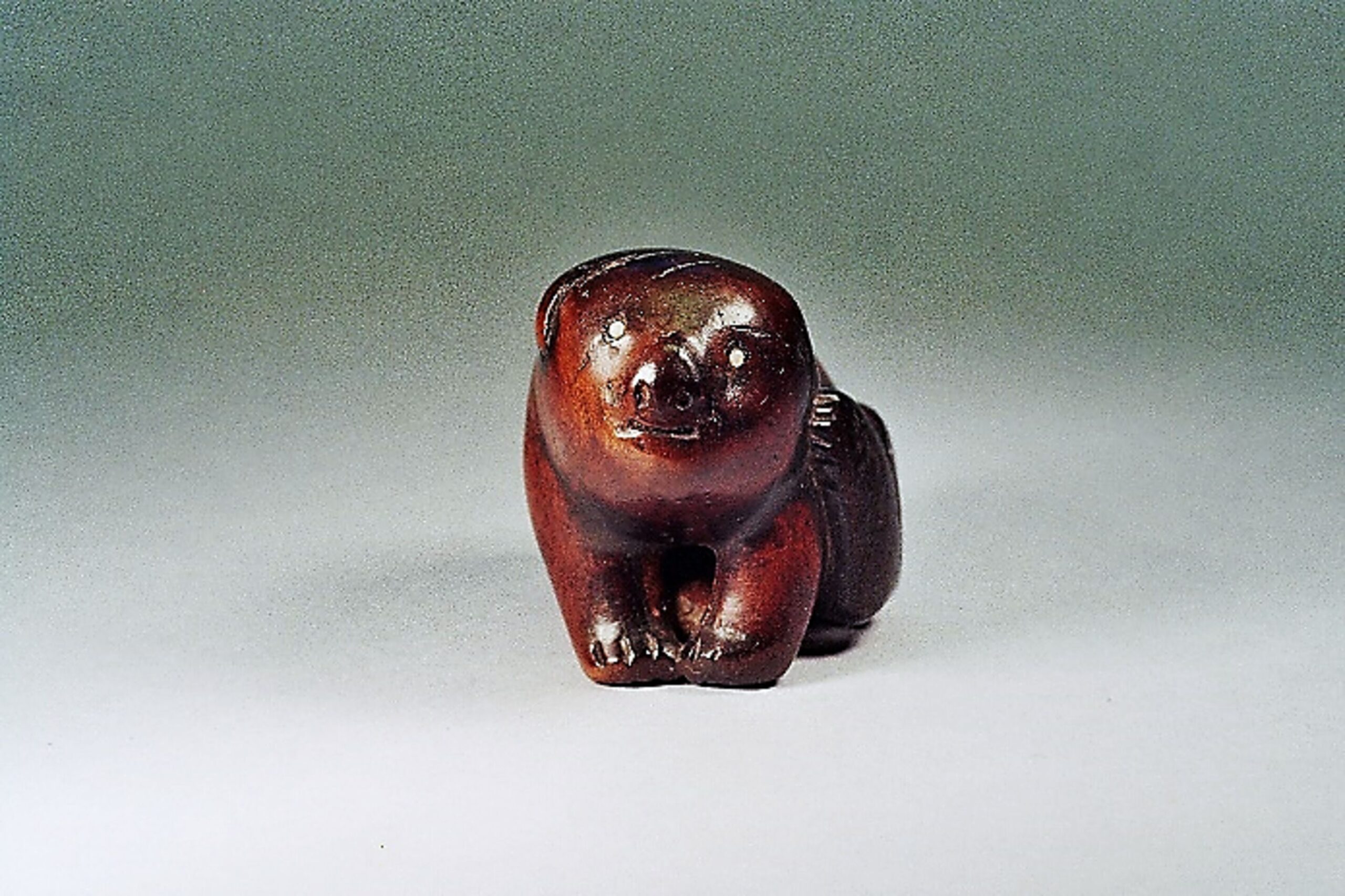 Holz-Katabori. Hündchen, glattfellig kauernd, sich mit der linken Hinterpfote am Kopf kratzend. Augen in weissem Material eingelegt. Anspruchsloses, dennoch liebenswürdiges Stück. Gut abgegriffen, handschmeichlerisch, schöne Glanzpatina. Himotoshigang durch das linke kratzende Hinterbein. Länge 43mm, Alter: ca. Mitte 19.Jh.