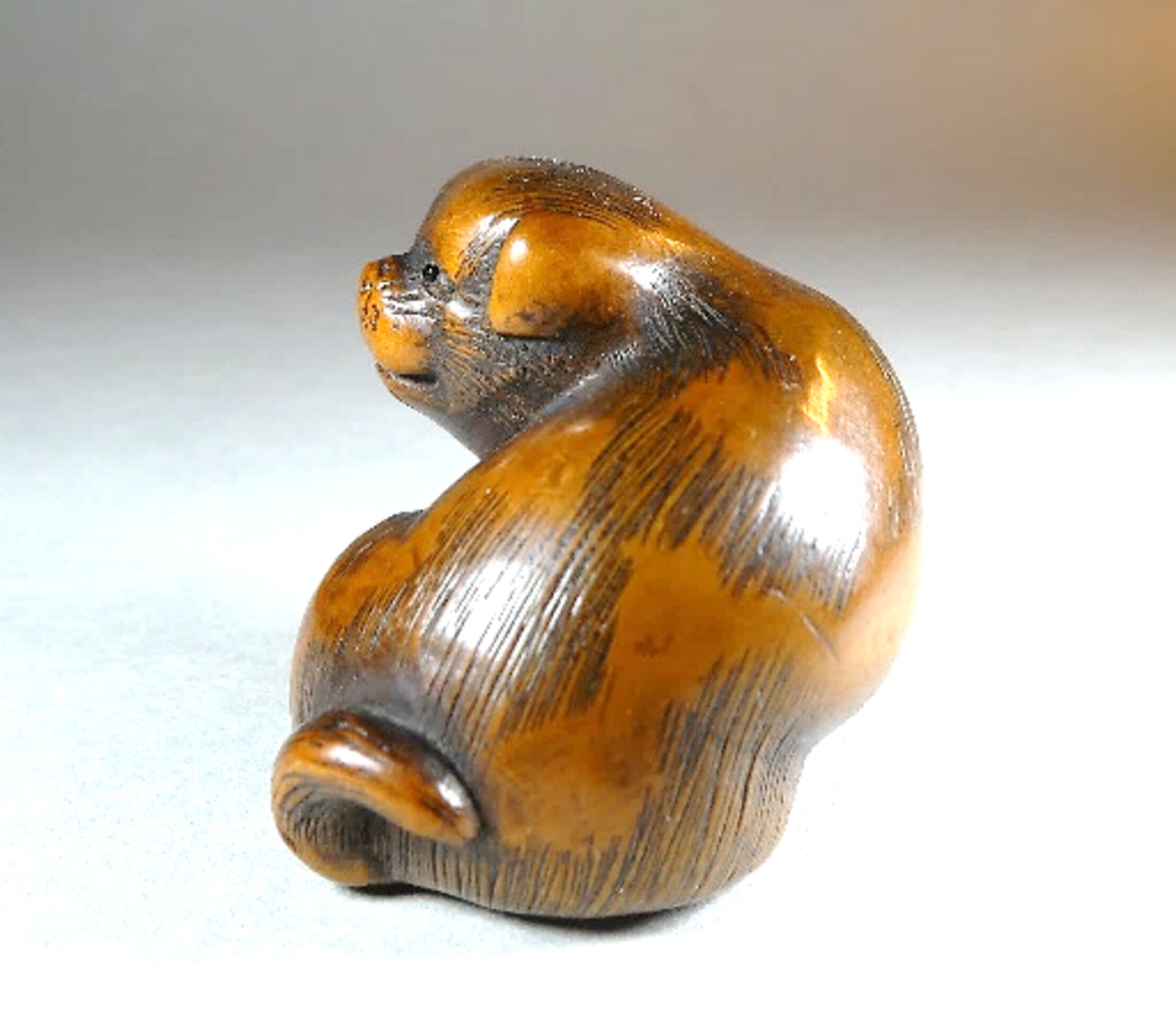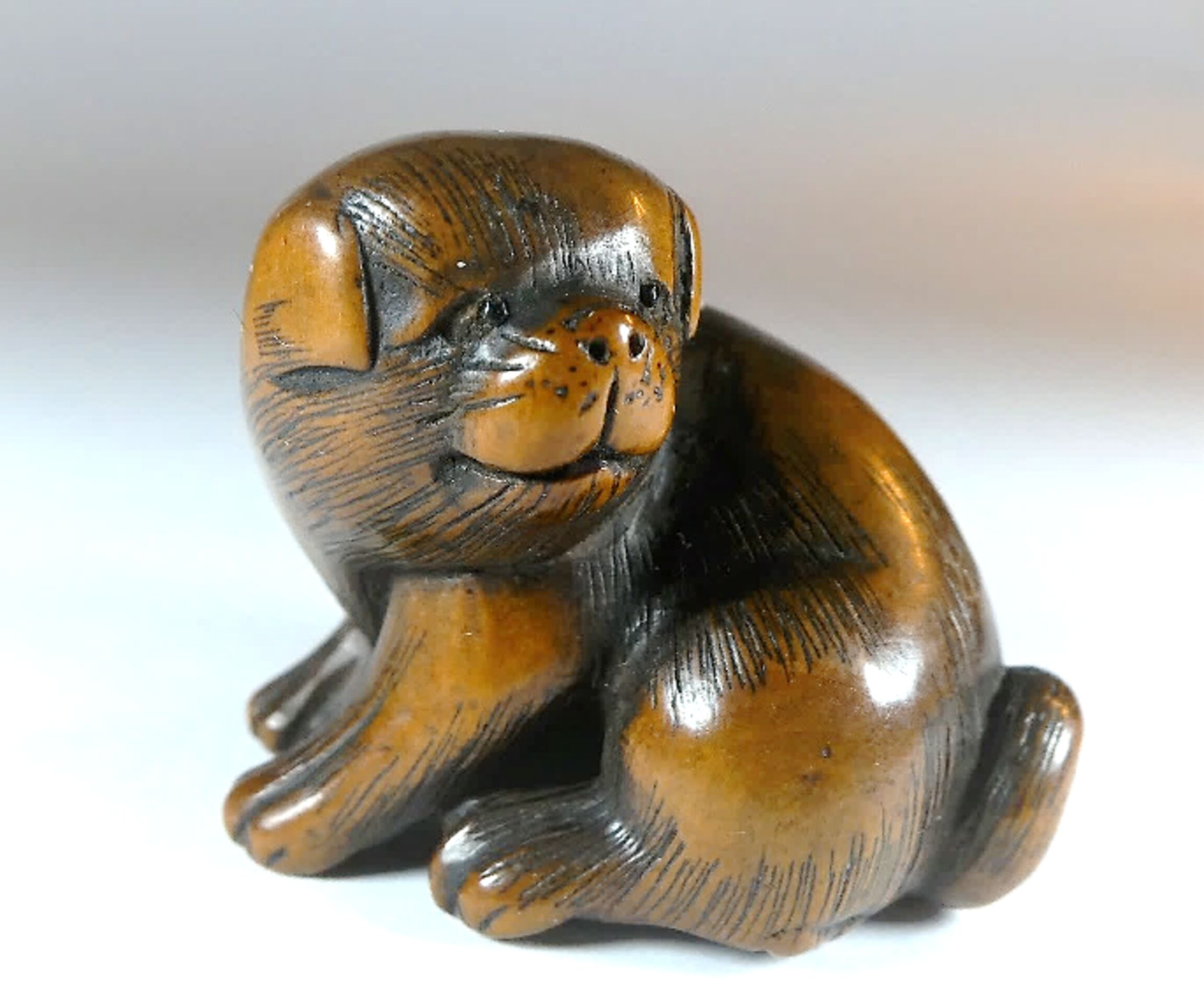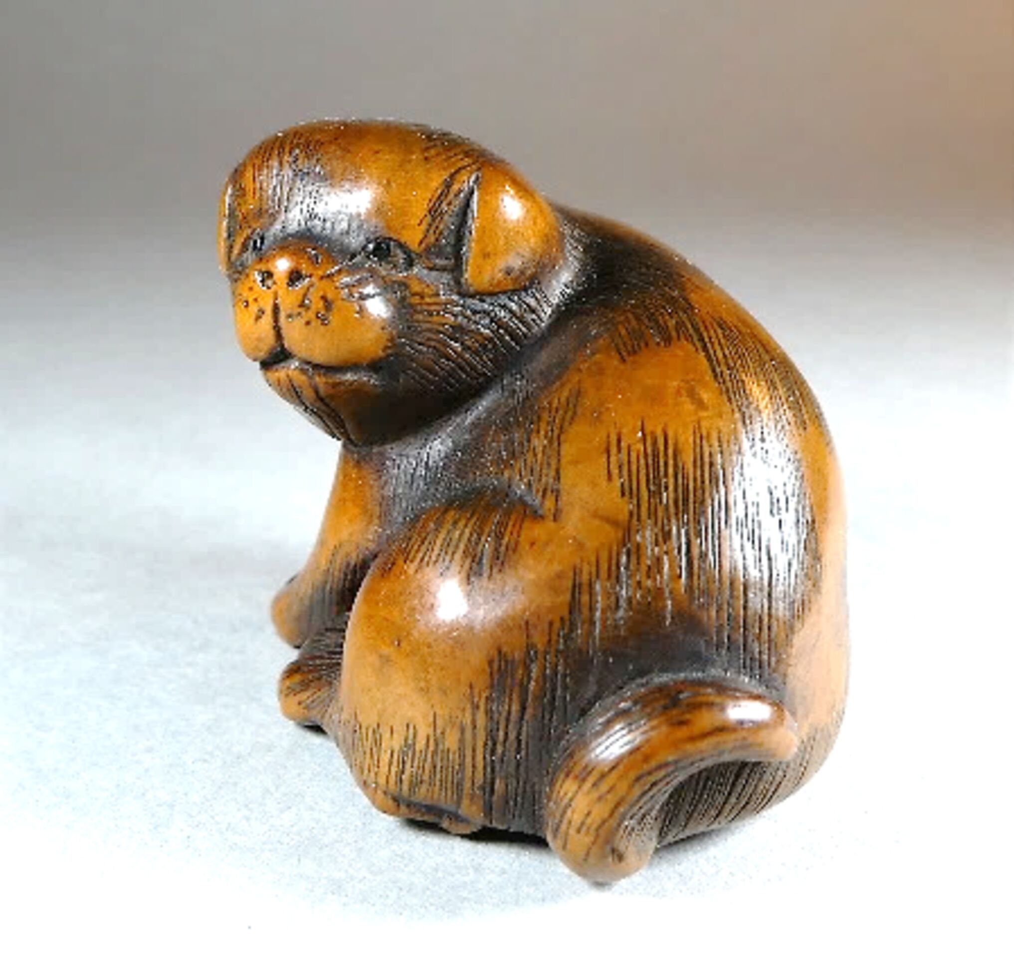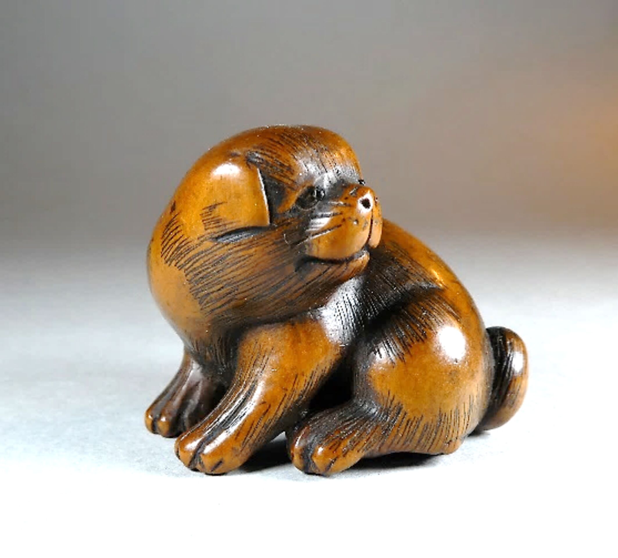Holz-Katabori. Das freundliche Hündchen sitzt und wendet den Kopf mit der Schnuppernase munter nach links hinten. Kleine Schlappohren, feine Fellzeichnung (im Gegensatz zu der teilweise groben Fellzeichnung anderer Masanao-Hündchen, siehe umseitig), Spuren von Gebrauch und ein Ringelschwänzchen runden das Bild ab. Auch auf der Unterseite die Pfoten und das Bauchfell sind sorgfältig ausgearbeitet. Auf der Unterseite des rechten Hinterbeins findet sich die Signatur MASANAO, , (K191, K282). Ein „natürliches“ Himotoshi zwischen Bauch und linkem Hinterbein. Die weit auseinander liegenden Äugelein in dunklem Material (Horn?) eingelegt. Höhe 32mm, Breite 38mm, Alter ca. 2.Hälfte 19.Jh.