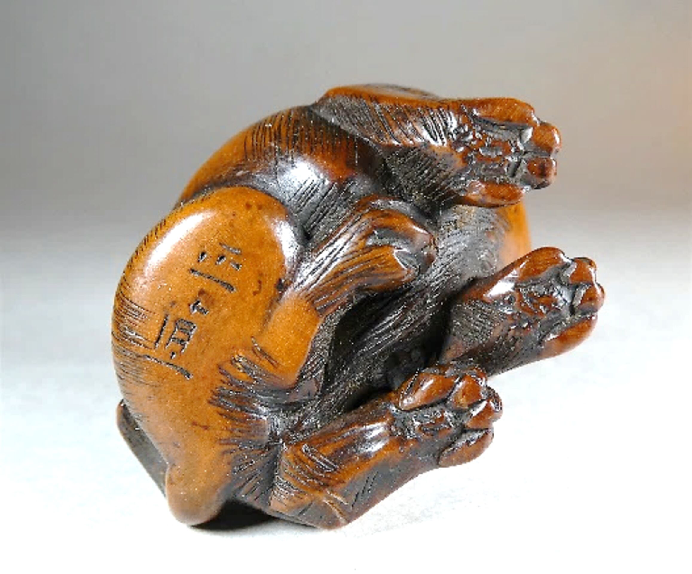 MASANAO: derartige Tierdarstellungen sind typisch für die Schnitzergilde Masanao aus Ise/Yamada, die von der 1.Hälfte des 19.Jh. bis weit ins 20.Jh. zahlreiche ausgezeichnete Schnitzer hervorbrachte, die fast ausschliesslich in Holz arbeiteten. Gemäss der Ausfertigung der Signatur ist das Stück Isawa Masanao zuzuordnen, einem Schüler von Masanao I (A.Dicros, Netsuke & Sagemono, 1987, p.210).