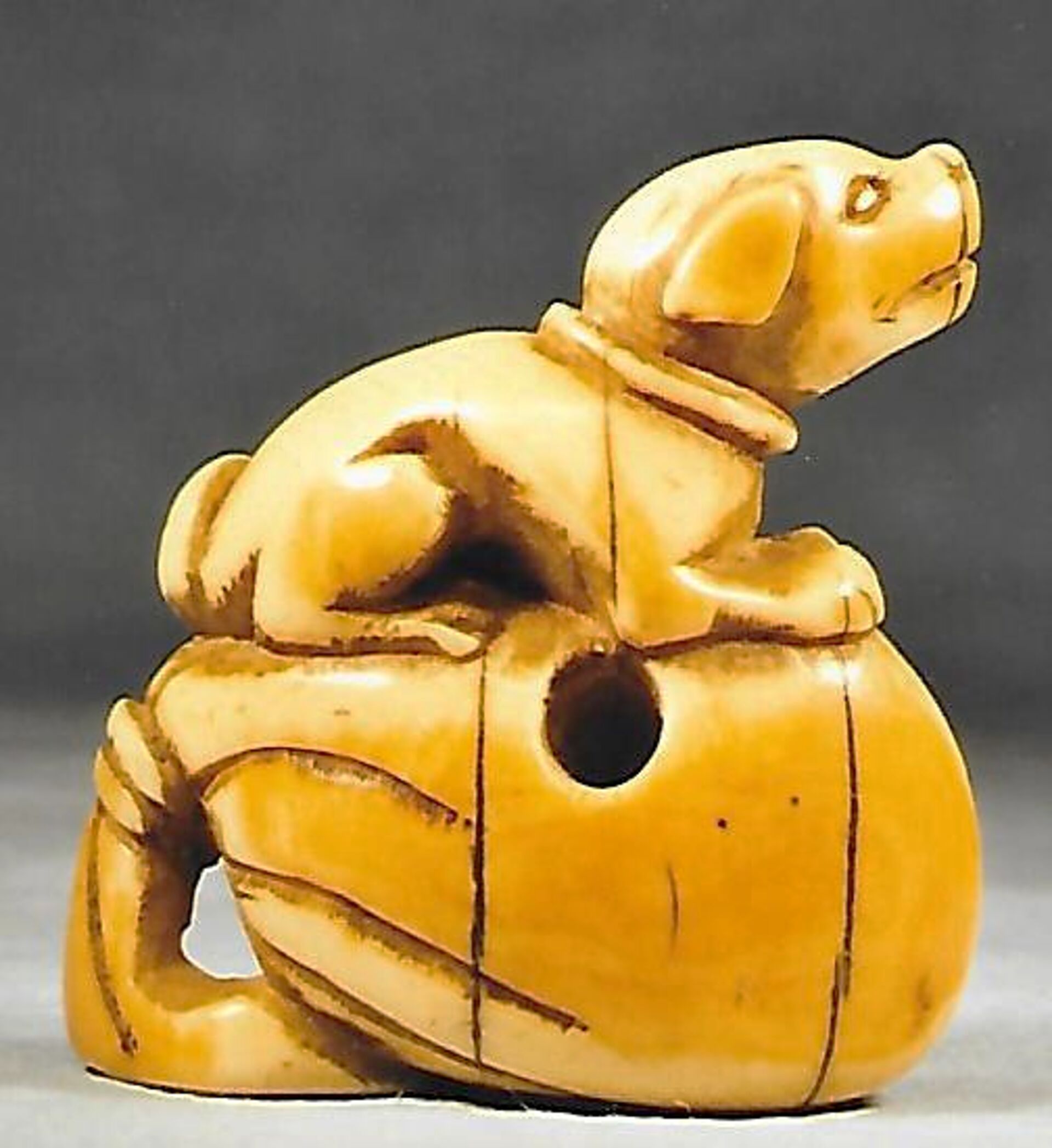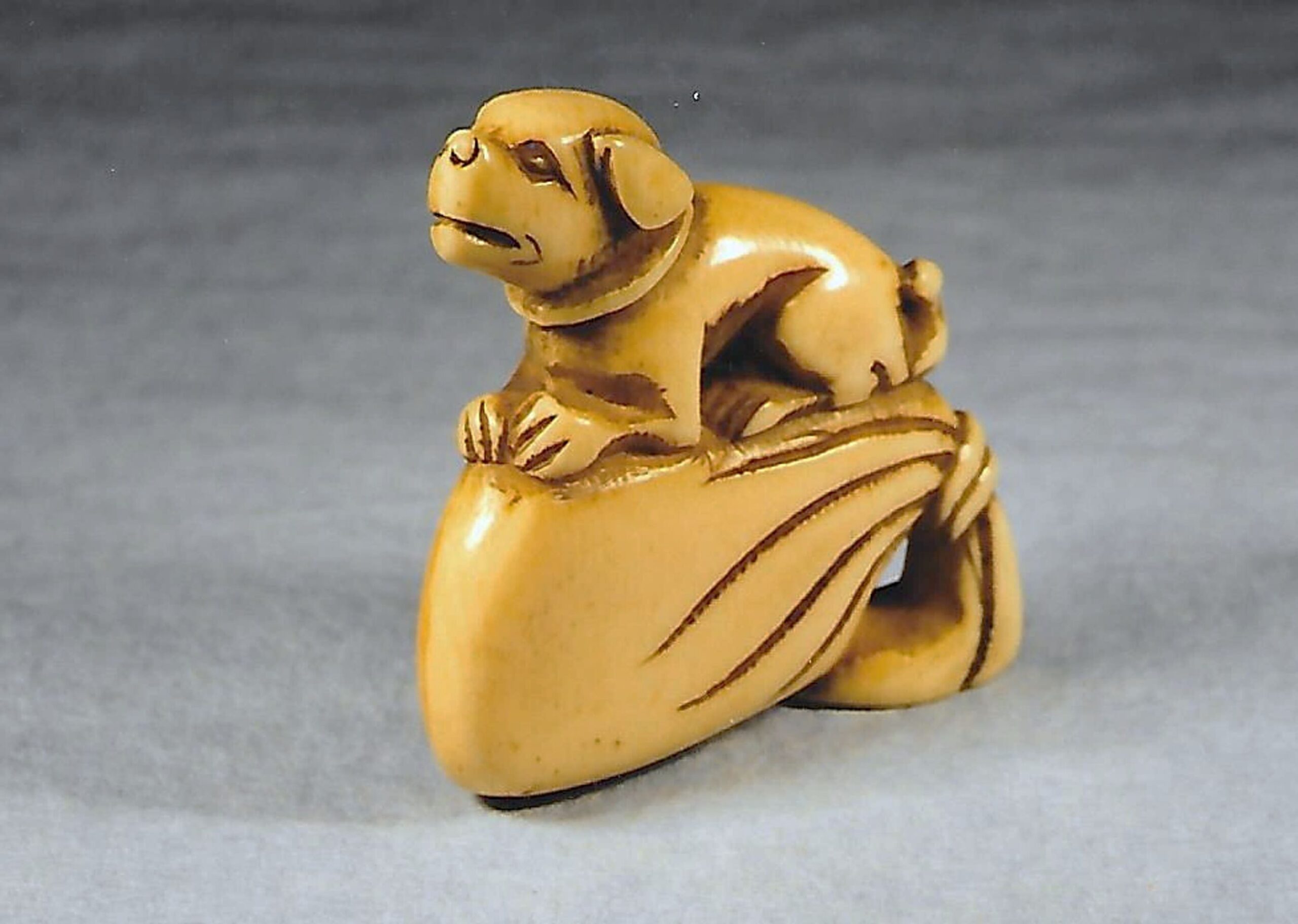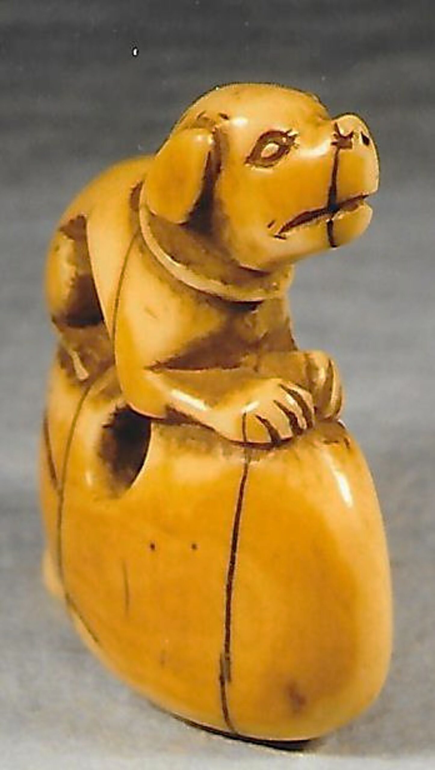 Der Hund, jap. Inu, ist der chinesische Hund, der Haushund, im Gegensatz zu Kame, dem europäischen Hund. Er ist das 11. Zeichen des Tierkreises. Anders als in den chin. Traditionen, gemäss denen der Hund als dämonisch angesehen wurde – Donner beispielsweise wurde als das Bellen des Himmelshundes gedeutet – gilt er in Japan als treuer Freund, Wächter und Jäger, und wurde auch im Krieg eingesetzt. Schwangeren wird am Tag des Hundes ein Gürtelamulett angelegt. In der Legende bewahrt er die Seelen, besonders der Kinder vor den Angriffen von Dämonen. Babys wurde am 10. Tag ihres 8. Lebensmonats mit roter Farbe das Zeichen des Hundes Inu auf die Stirn gemalt. Mütter murmeln Inuko, Inuko, „Hündchen, Hündchen”, um von bösen Träumen geplagte Kinder zu beruhigen. Dem Kaiser eilte auf Reisen eine Hundegarde Hayabito voran, die bellen musste, um böse Geister zu vertreiben. Auch bei Beerdigungen gingen als Hunde verkleidete Männer dem Leichenzug voran. – Der Hund ist der natürliche Feind von Katzen, Füchsen und Tanuki, die sich verwandelt haben_ Sobald er auftaucht, müssen sie wieder ihre natürliche Gestalt annehmen und fliehen. Ein Hundetalisman erfüllt denselben Zweck. – Auf den Oki-Inseln im Westen Japans vor der Küste von Izumo gelten Hunde allerdings als Zaubertiere. Hunde, die sich in Haus oder Garten erleichtern, gelten dort als übles Vorzeichen, es sei denn, sie tun dies am Tag der Schlange. – Die im Zeichen des Hundes Geborenen gelten als loyal, pflichtbewusst und ehrenhaft, wohl etwas exzentrisch und bissig und können deshalb beleidigend sein. Sie haben einen ausgeprägten Gerechtigkeitssinn, sind aber auch selbstsüchtig und stur. – Am Tag des Hundes wurde bevorzugt Reis angepflanzt. — Der Sack, auf dem der Hund liegt und den er bewacht, könnte der Schatzsack Takarabukuro sein, der die 24 Kleinode Takaramono enthält, den sonst die Glücksgötter tragen. So wird dieses Netsuke vermutlich einen günstigen, behütenden, bewahrenden Aspekt symbolisieren.