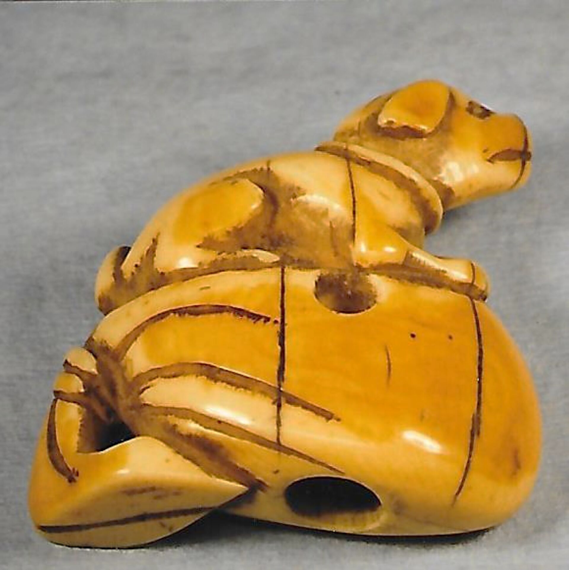 Elfenbein-Katabori. Ein kleiner feister Hund mit Halsband liegt zur Gänze auf einem Sack. Er blickt wachsam, vielleicht sogar böse nach oben. Das Elfenbein stammt aus einem Randsegment eines Zahnes und zeigt auf der Aussenseite dunklere Schichten und einige vertikal verlaufende Altersrisse. Grosse gut gebohrte Himotoshi durch die Hinterseite und den Boden des Sacks. Höhe 38mm, Alter: ca. Ende des 18.Jh.