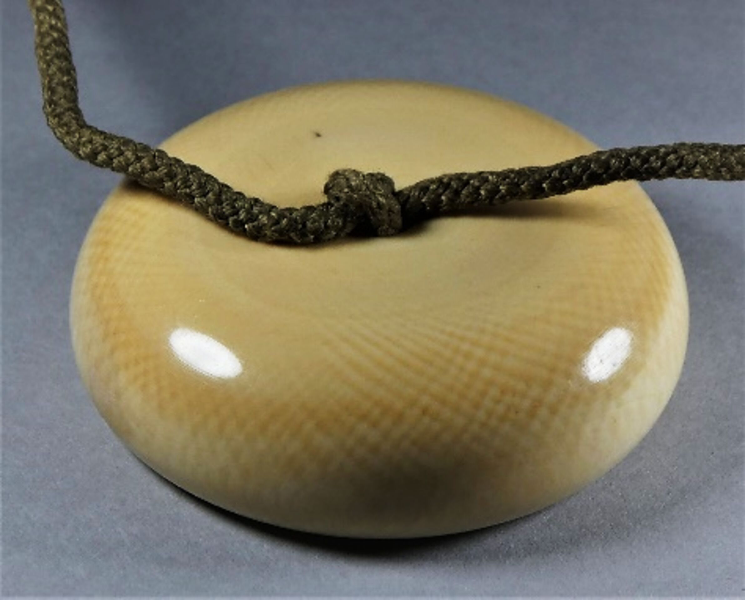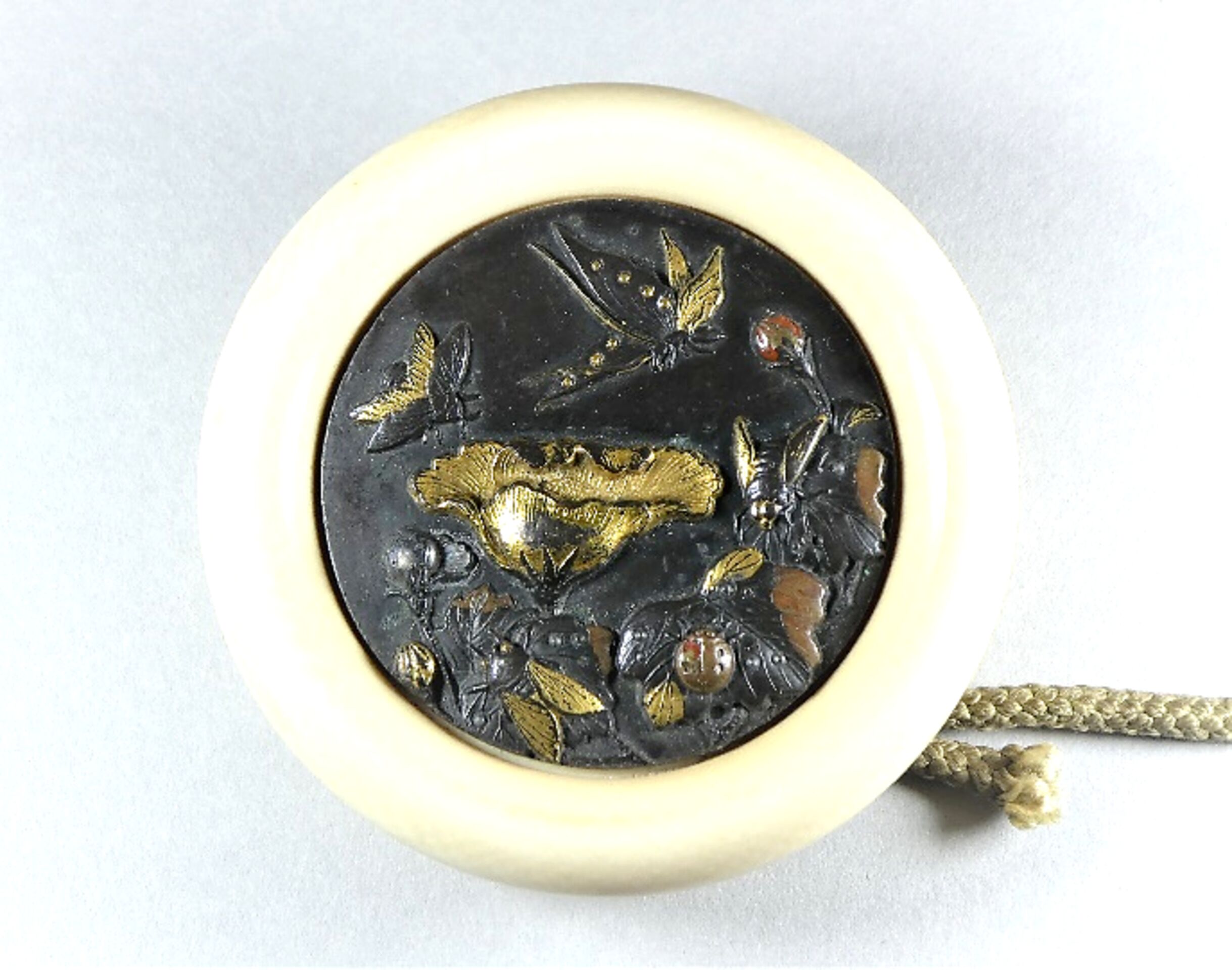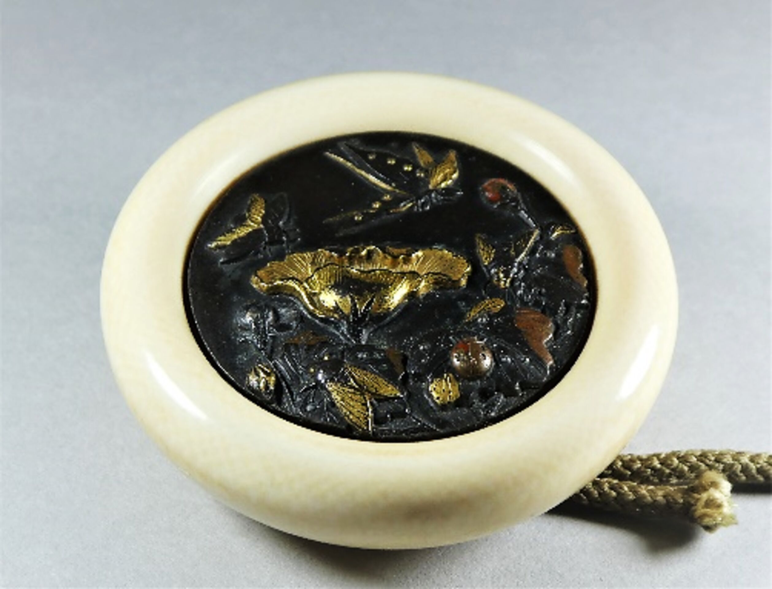 Kagamibuta-Netsuke. Die Schale ist aus untadeligem Elfenbein, die gekreuzten Schreger-Linien sind gut zu sehen (siehe umseitig). Die dunkelgraue Platte aus Shibuichi-Legierung zeigt in der Mitte eine grosse vergoldete Blüte, vermutlich eine Päonie, darüber und ringsherum plastisch aufgesetzte Schmetterlinge, Käfer, Fliegen, Insekte aller Art, Blätter und Knospen, zum Teil vergoldet, zum Teil shakudo eingefärbt. Durchmesser 51mm, Alter: ca. 2. Hälfte 19. Jh., nicht signiert. Unterseitig auf der Platte eine Öse für die Schnur, auf der Unterseite der Elfenbeinschale ein zentrales Himotoshi.